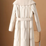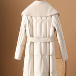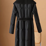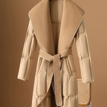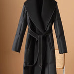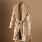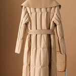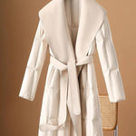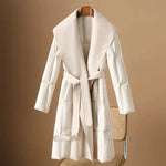 Sculpted for warmth and poise, this long duck down coat pairs a wide wool shawl collar with a belted waist — a timeless silhouette made for the modern winter.