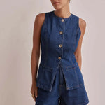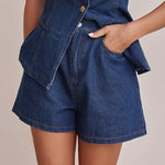 Structured but playful, this sleeveless denim vest and wide-leg short combo brings vintage tailoring into modern daylight. Buttoned charm meets breezy comfort for everyday polish.