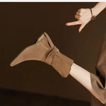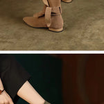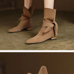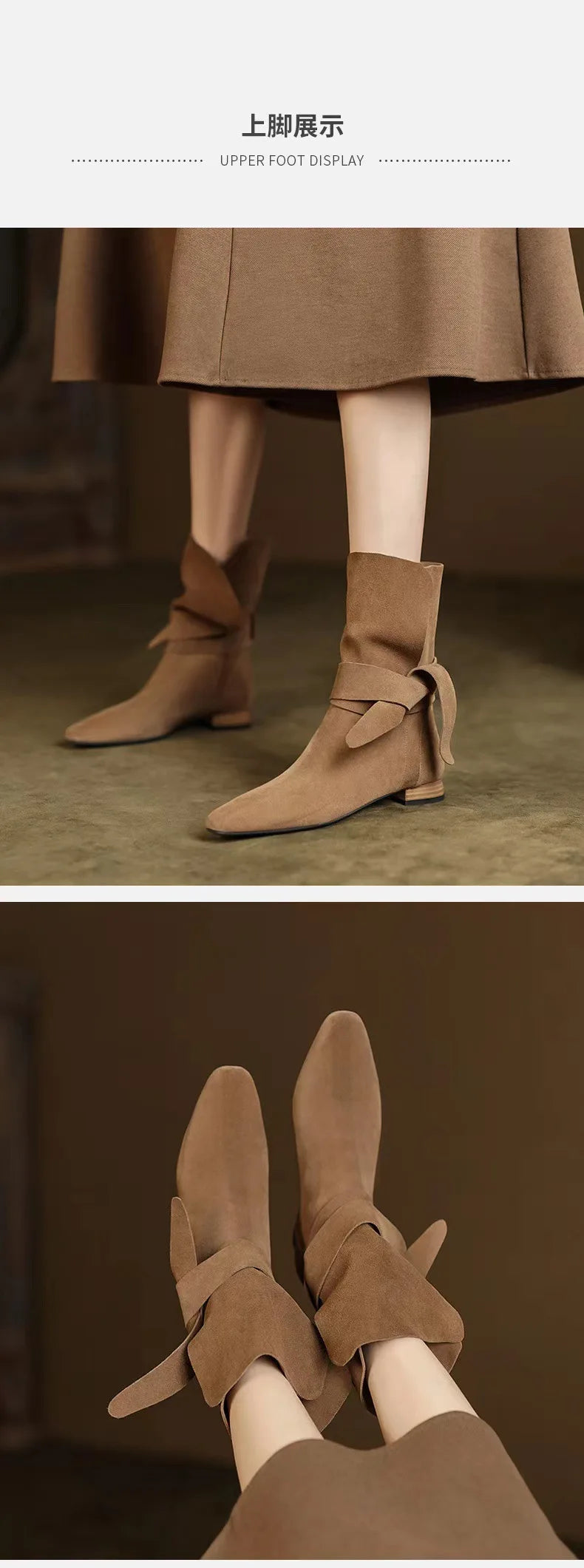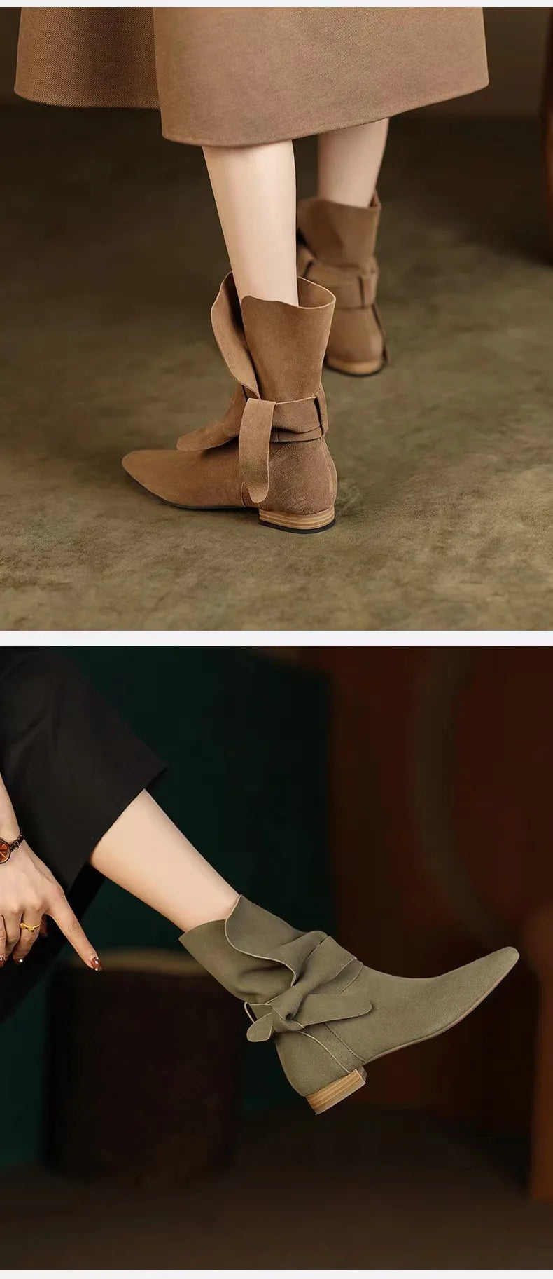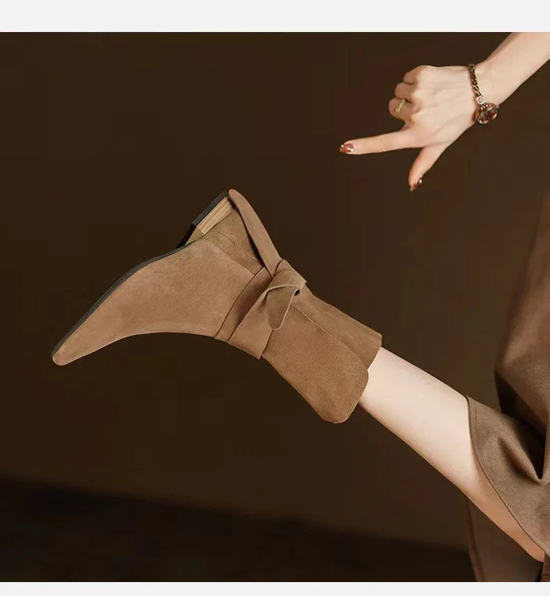 Elegant and understated, these pointed-toe suede boots feature a soft sculpted shape with a wraparound tie detail. A refined choice for effortless autumn sophistication.