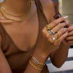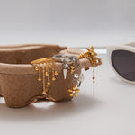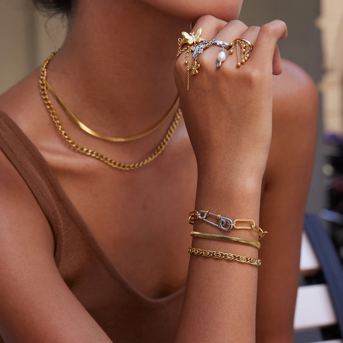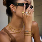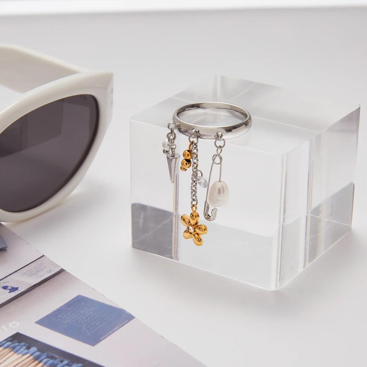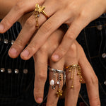 Adorn your fingers with a touch of whimsical rebellion. This ring isn't just an accessory; it's a conversation starter, dripping with a playful mix of charms that dance with every move you make. Delicate chains, freshwater pearls, and edgy accents come together in a look that’s both chic and uniquely you, perfect for stacking or wearing as a standalone statement.
