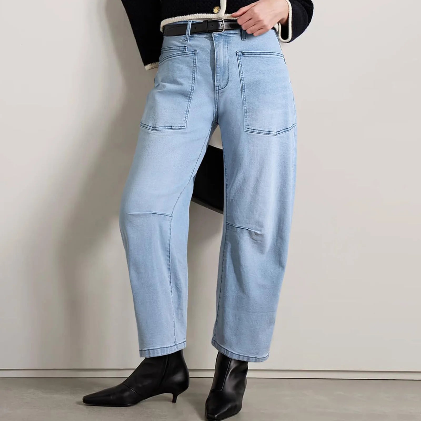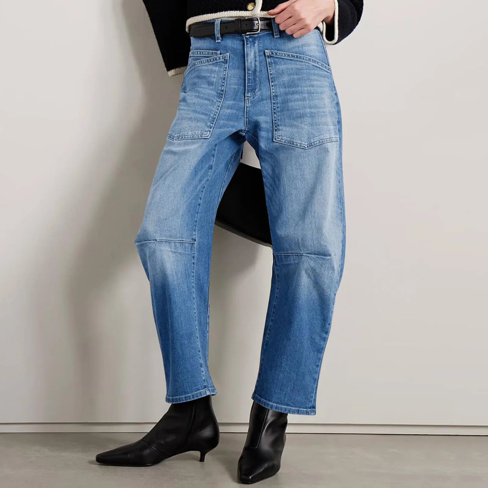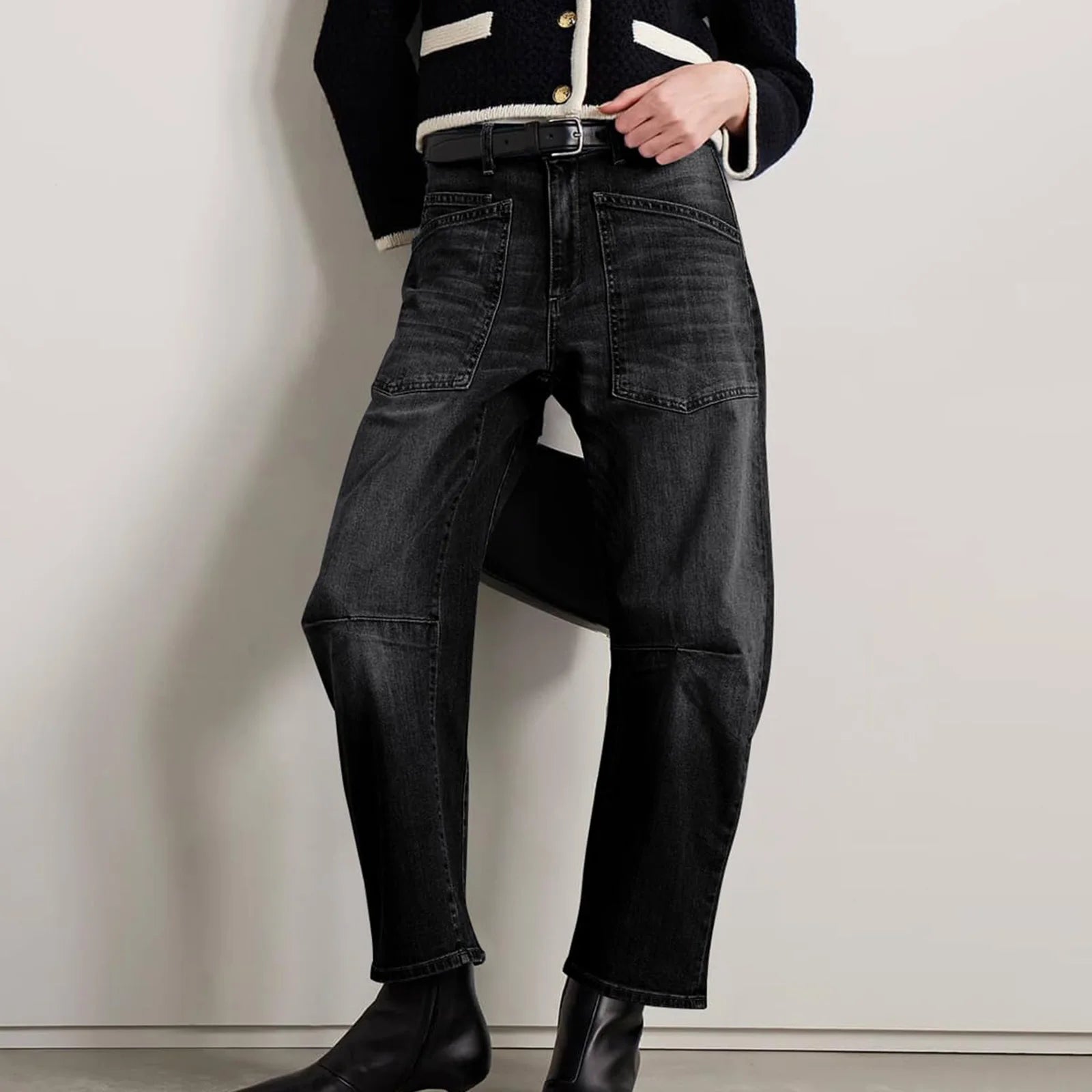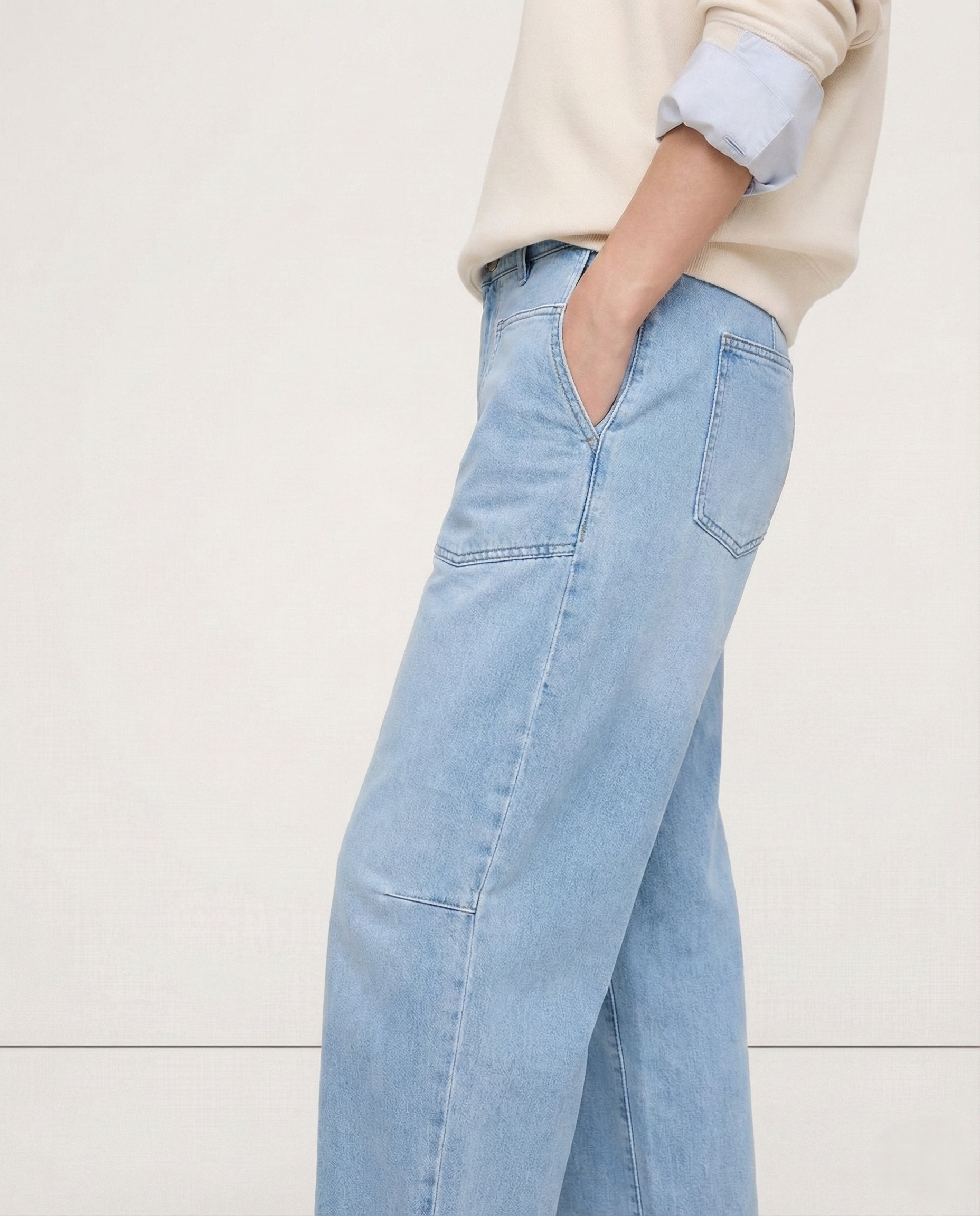 A new proportion changes everything. Our sculpted barrel leg curves with intention through the hip and tapers softly at the ankle, creating shape without clinging and structure without stiffness — the kind of denim that makes the rest of the outfit feel considered.