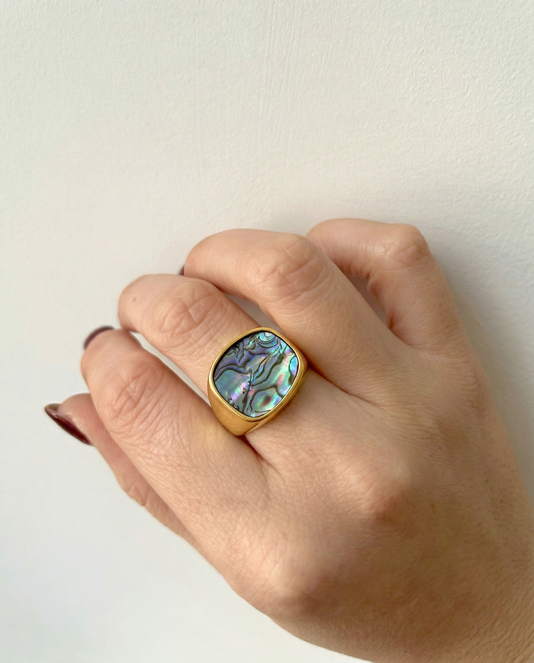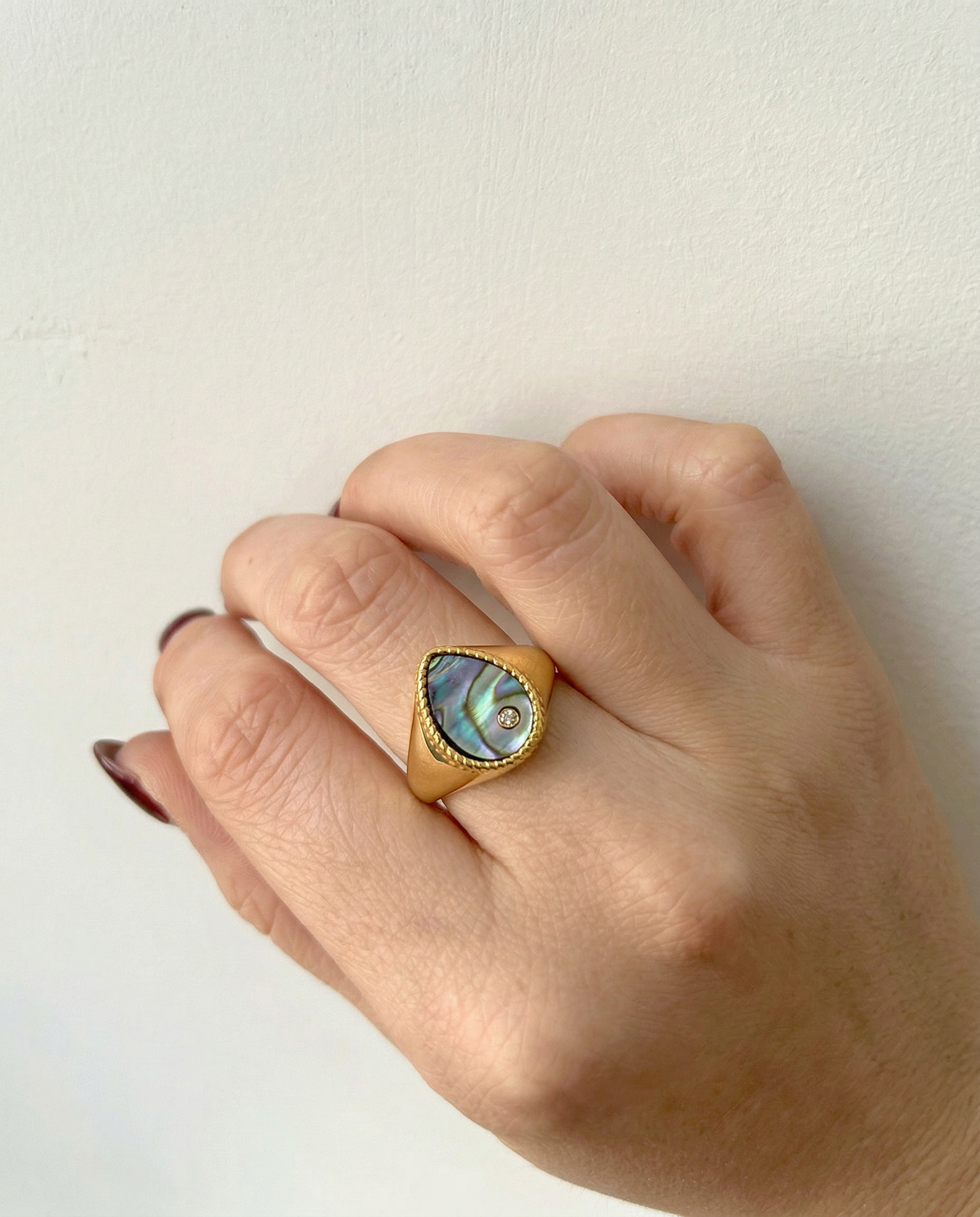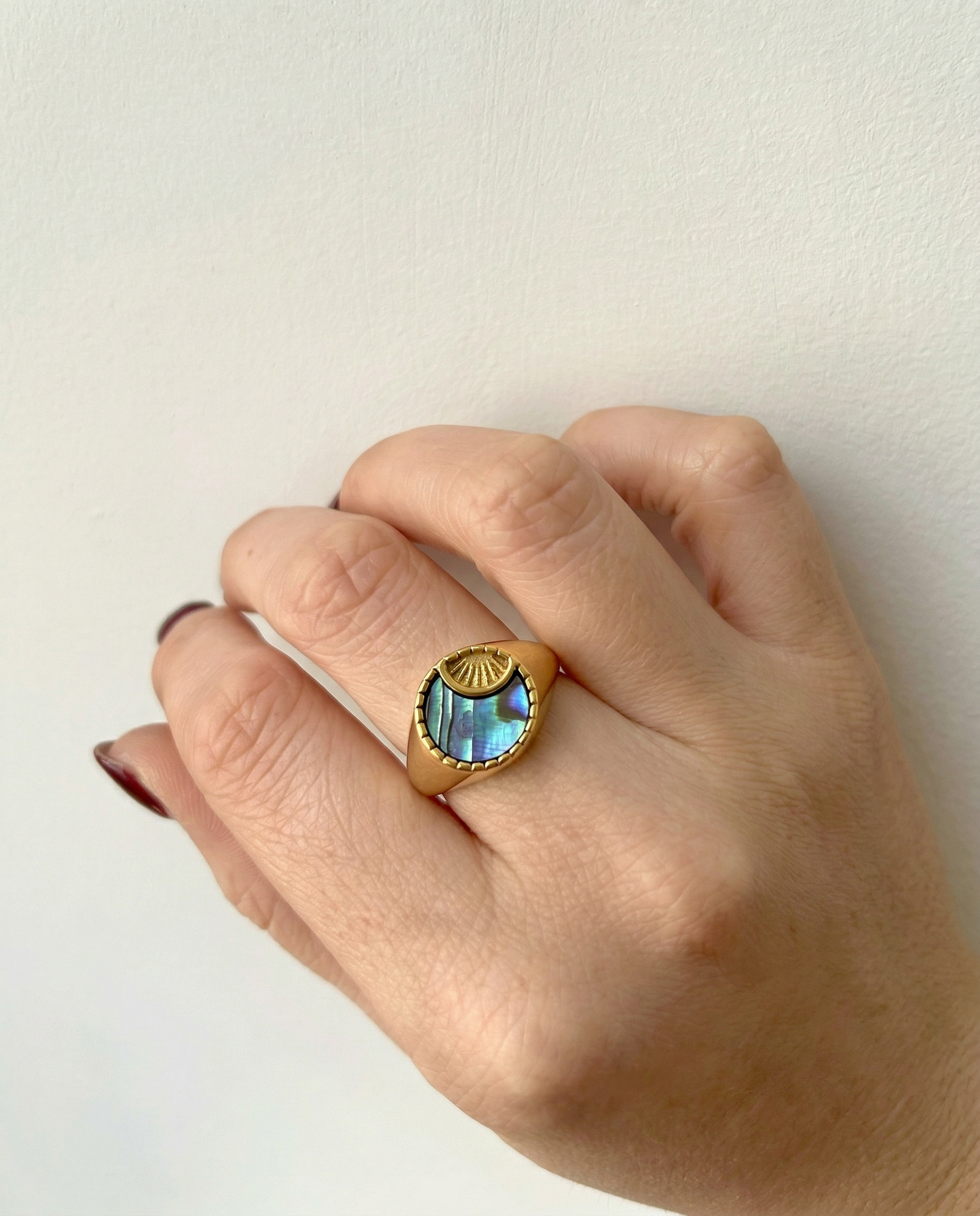 Luminous depth meets sculpted gold. Each iridescent abalone inlay catches the light differently, giving this bold signet silhouette a rich, dimensional glow that feels both modern and heirloom-worthy.