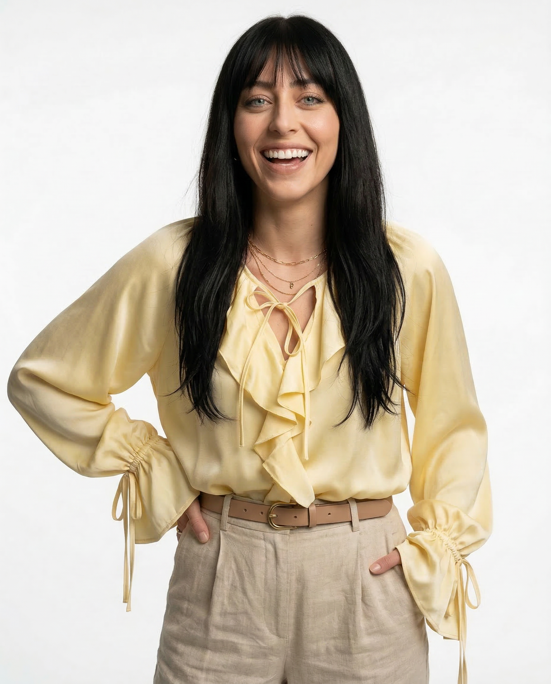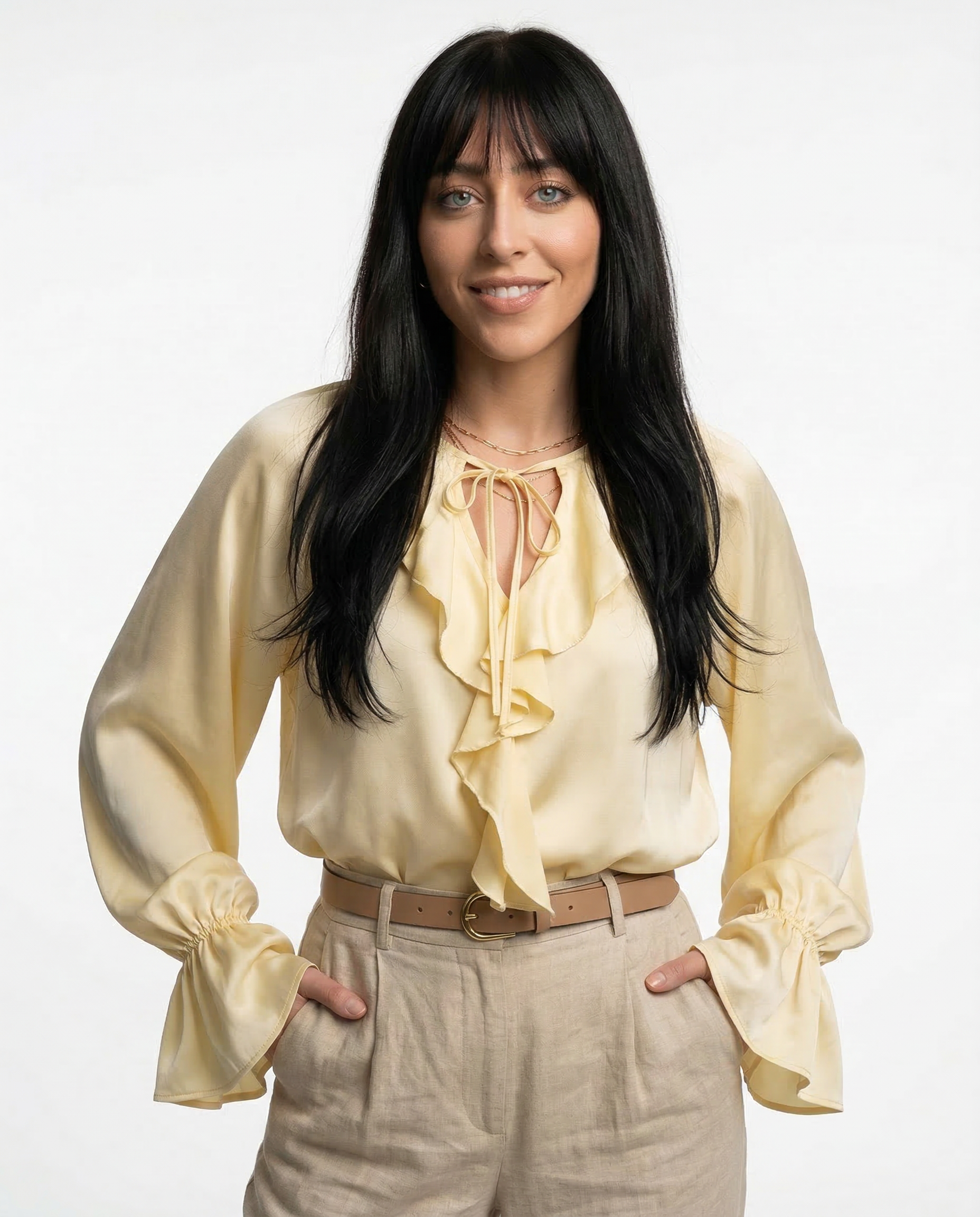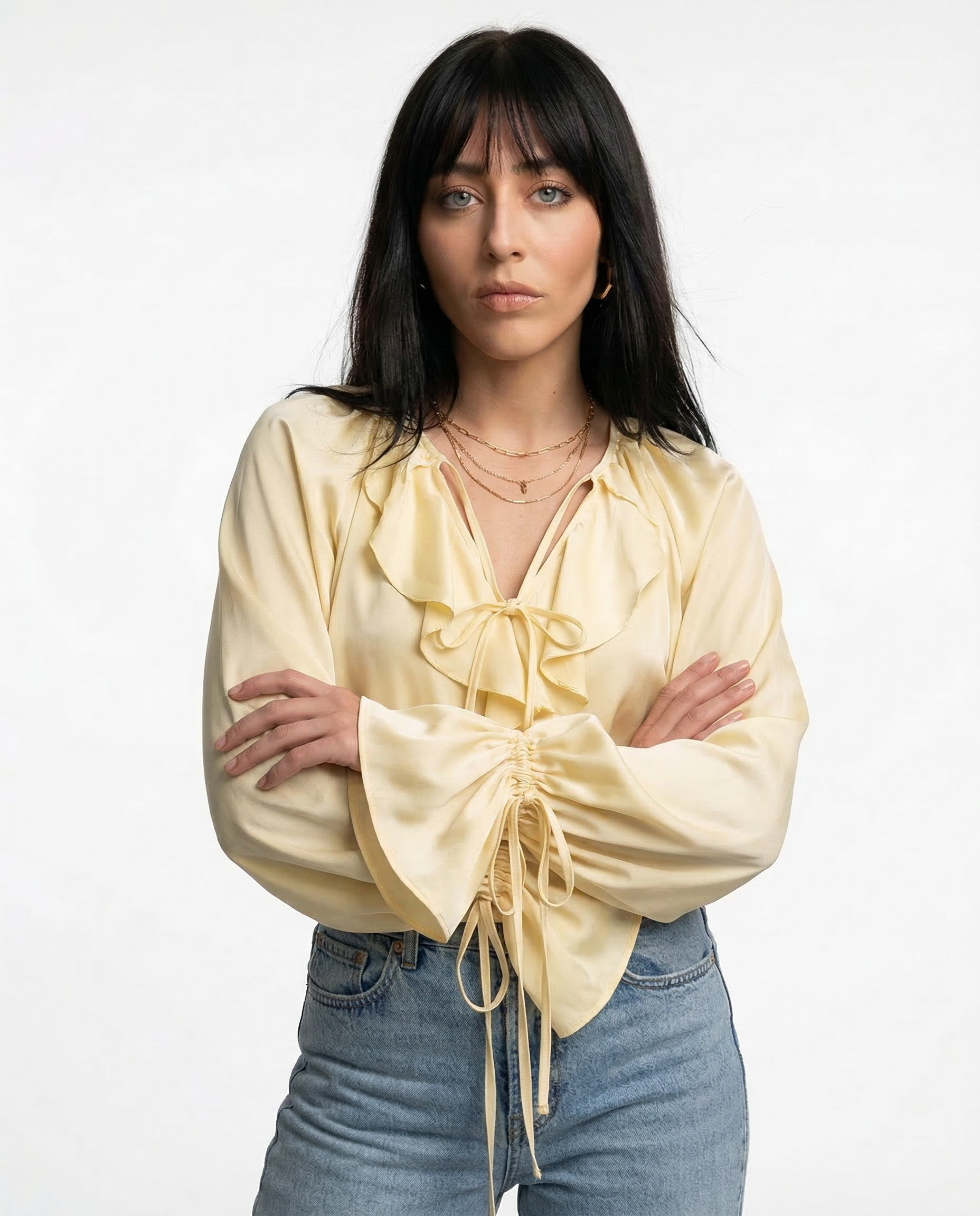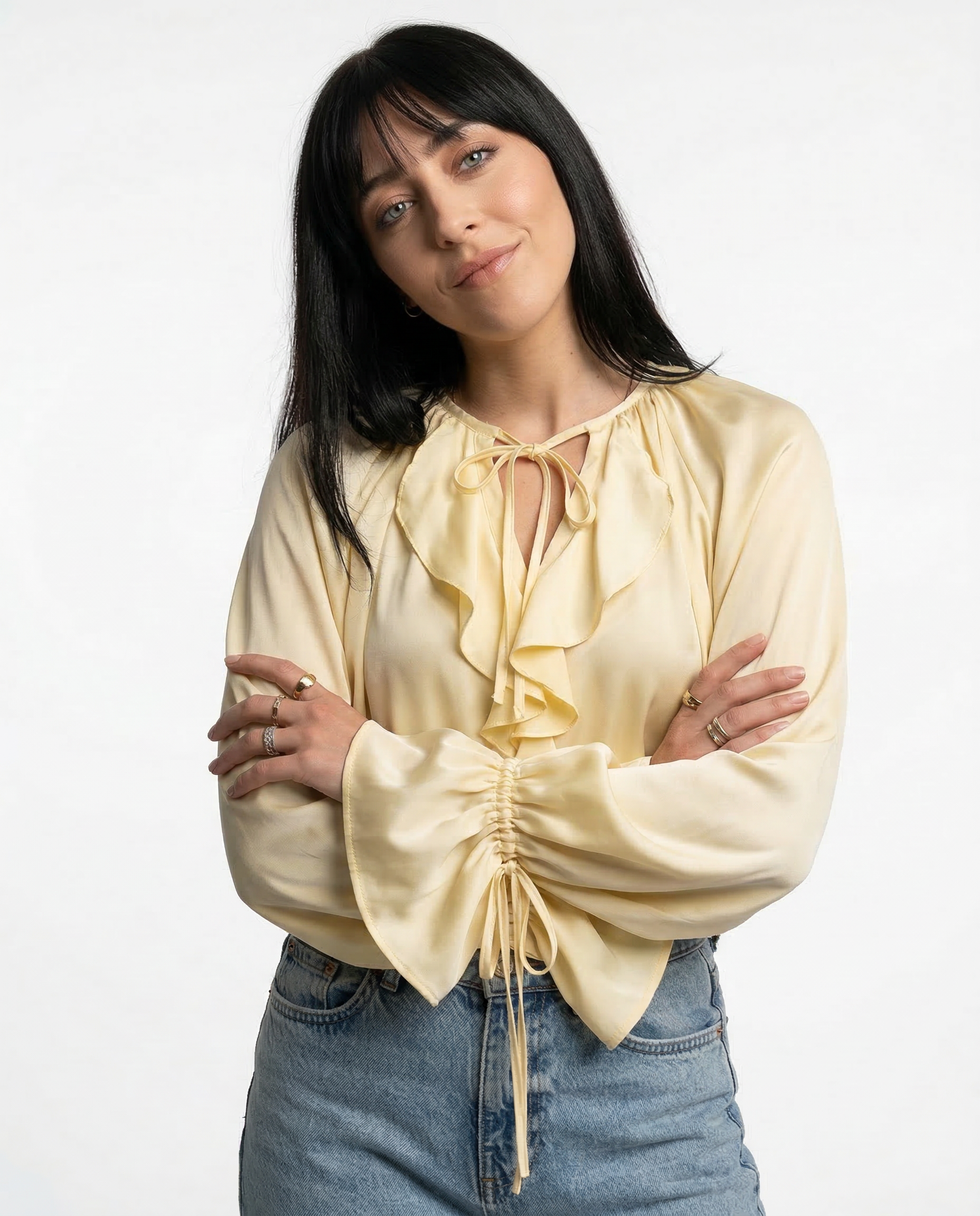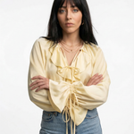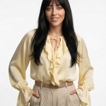 Light-catching and soft to the touch, this blouse blends satin fluidity with ruffled edge and gathered sleeves. Whether tucked or loose, it’s made to move effortlessly from daylight to dinner.