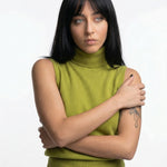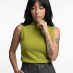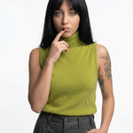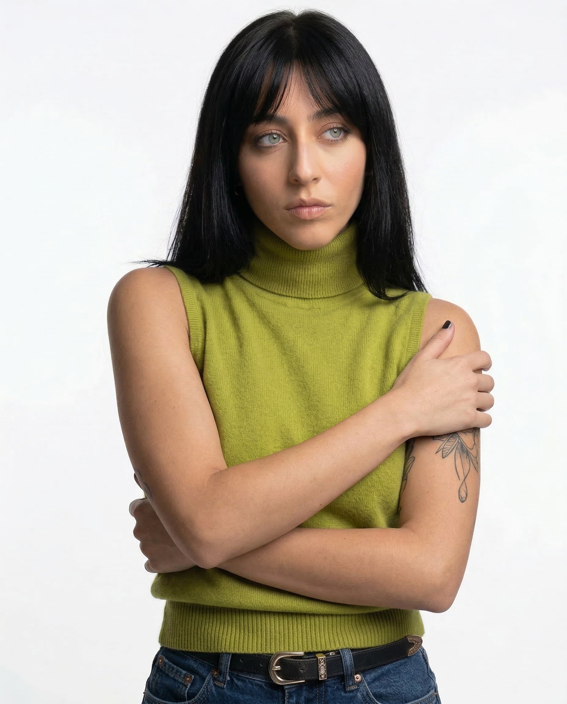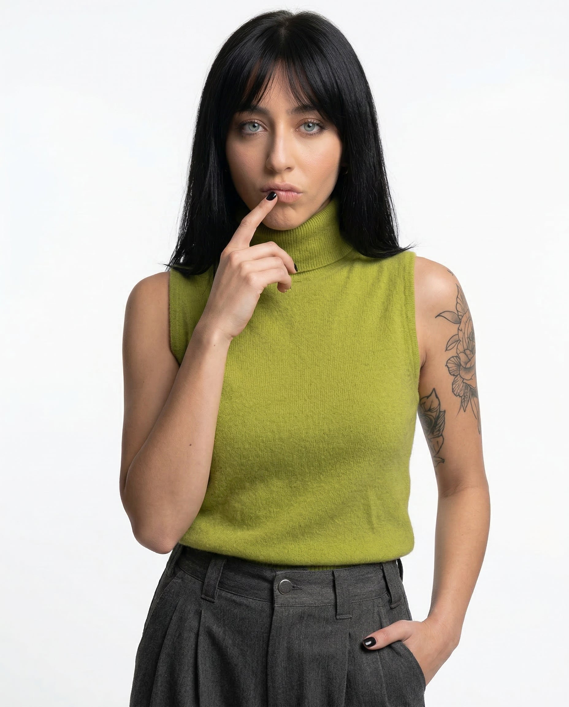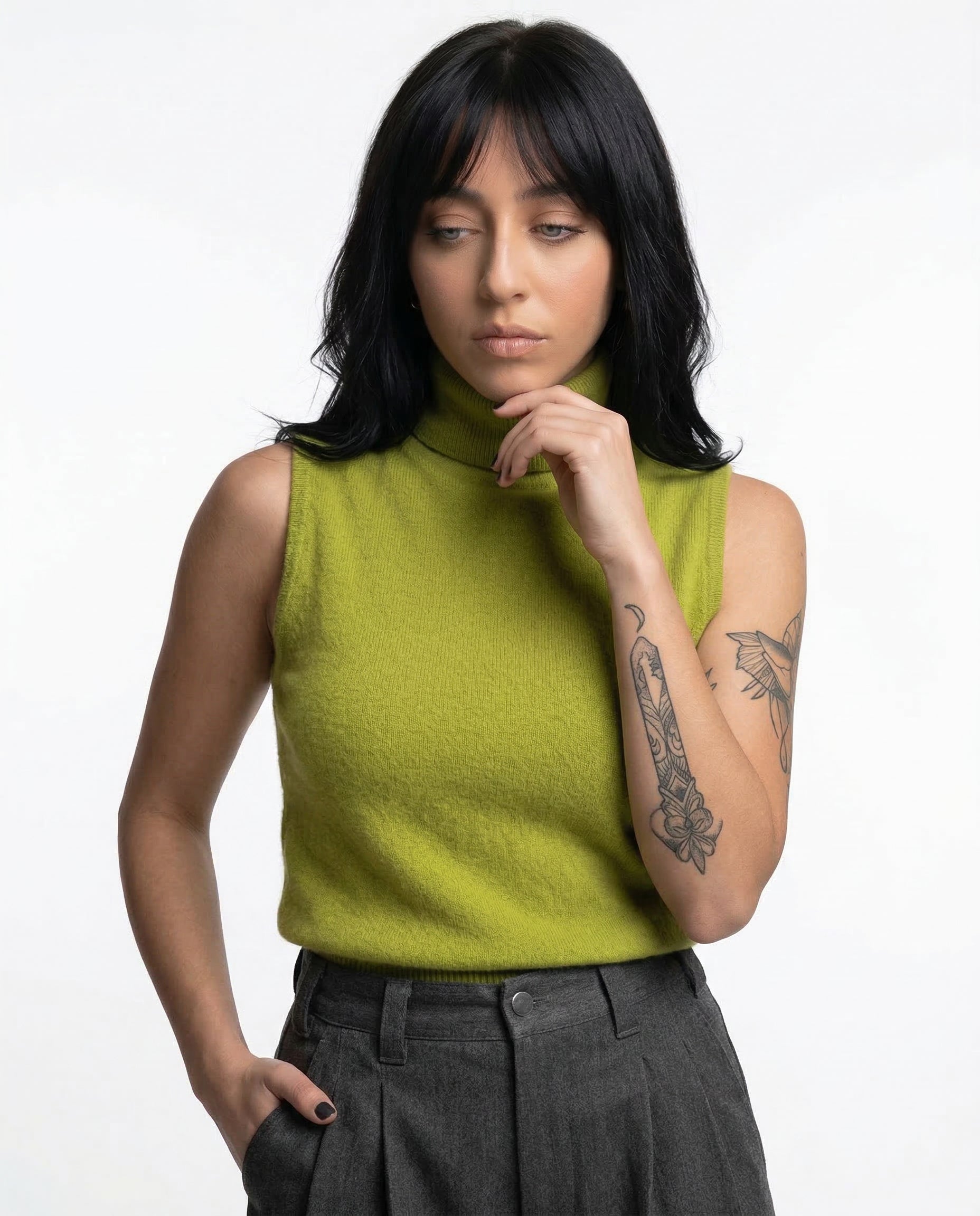 Simple, sculpted, and refined. With its sleeveless cut and tall neckline, this knit adds instant polish whether worn casually or under structured layers.