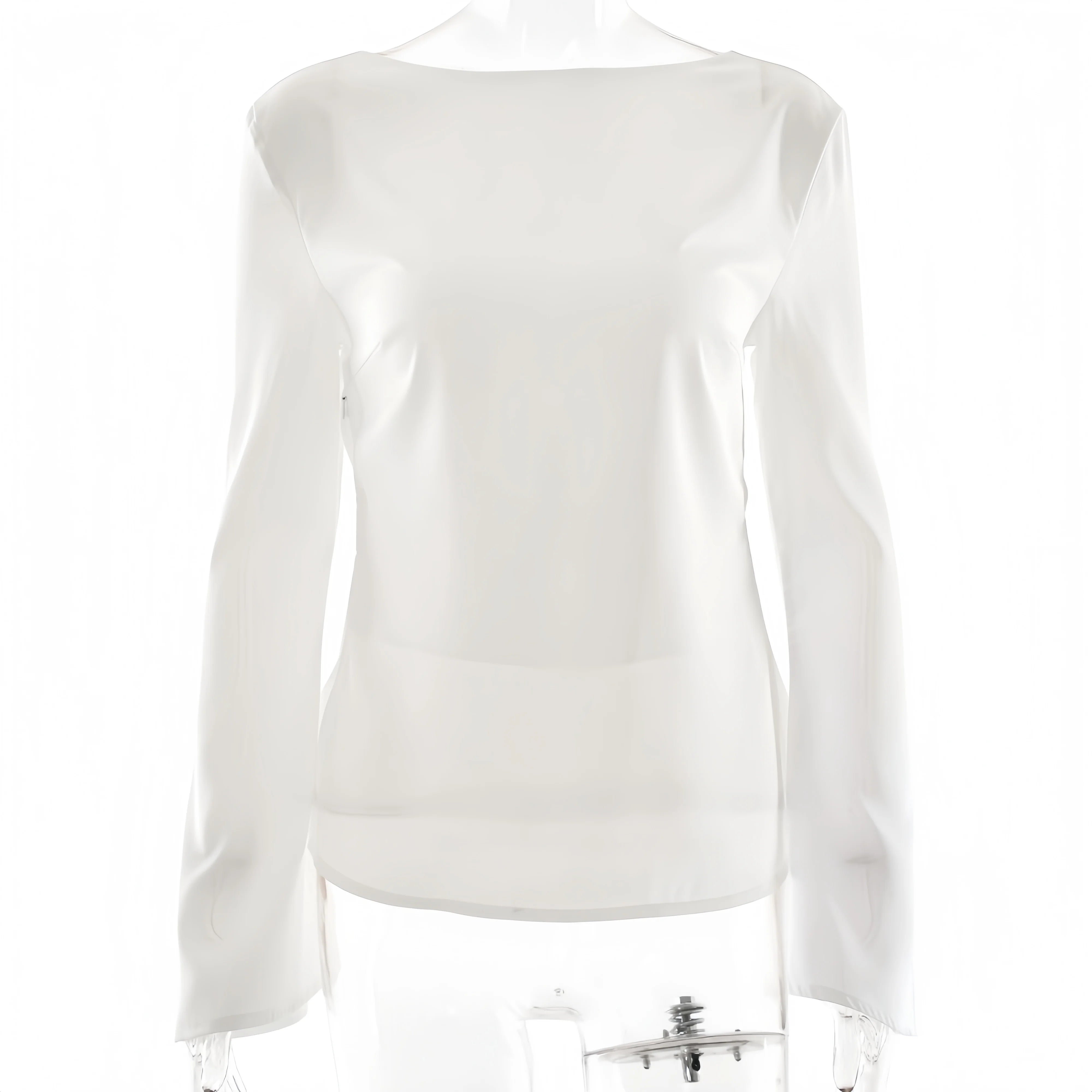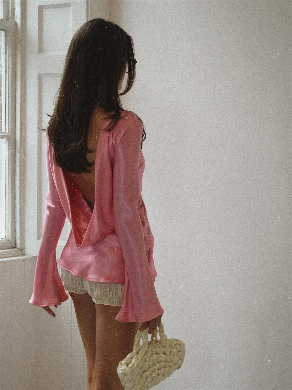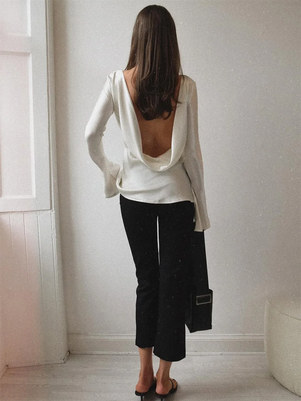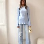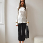 Smooth, fluid, and quietly striking. The satin finish catches the light beautifully while the slim cut and soft bell sleeves create a refined look that works just as well for daytime polish as evening plans.