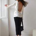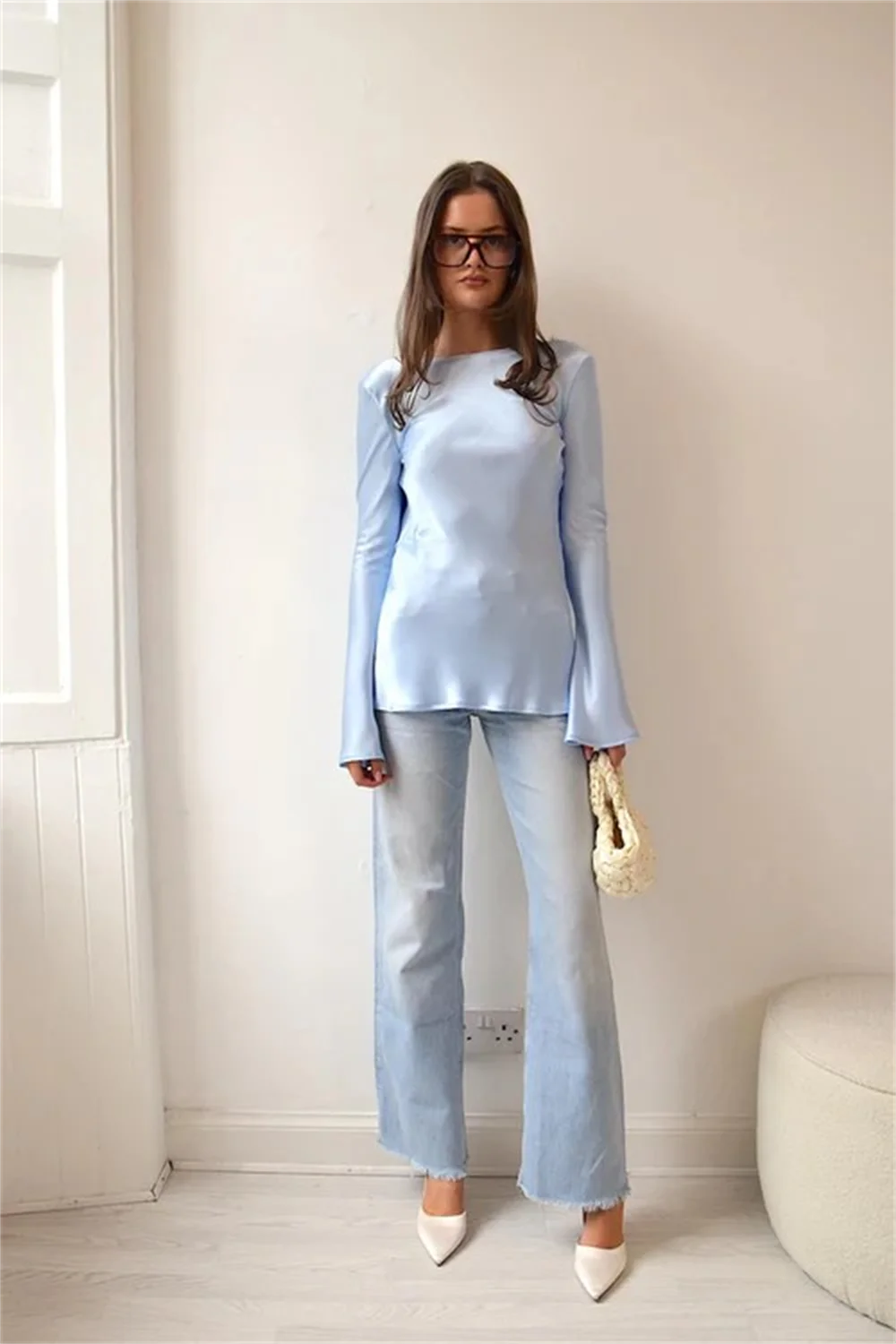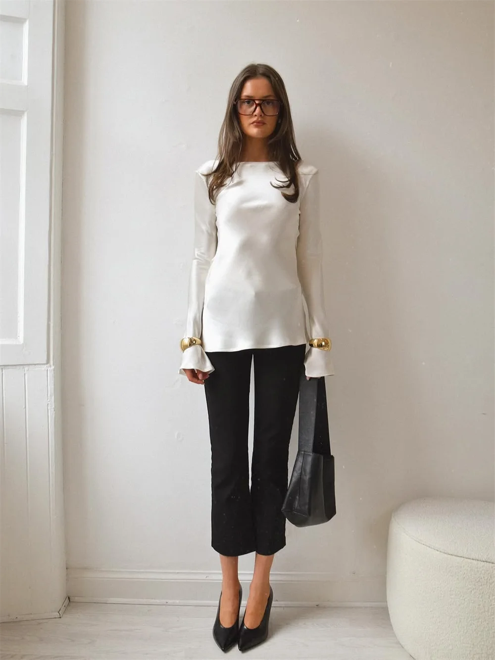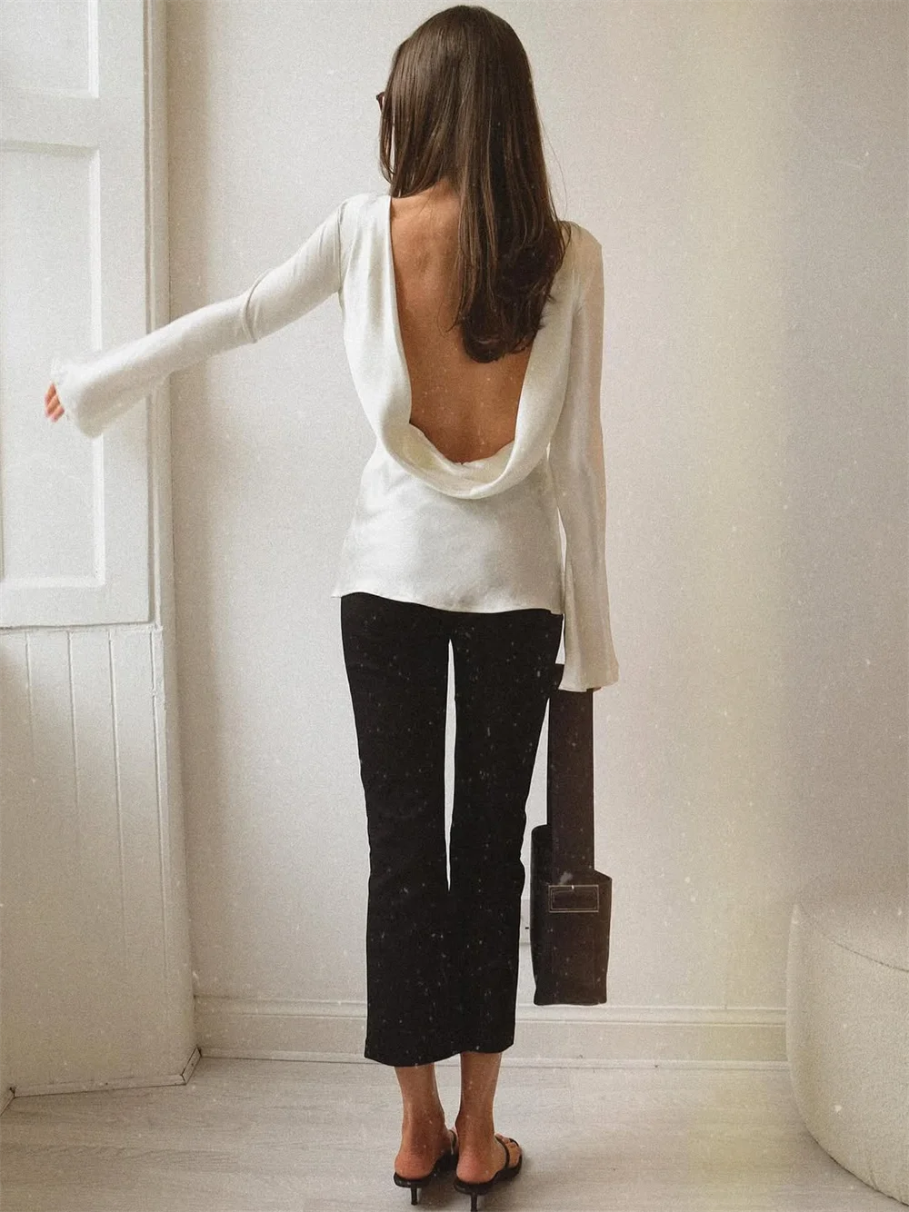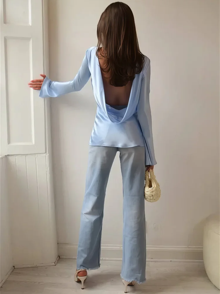 Smooth, fluid, and quietly striking. The satin finish catches the light beautifully while the slim cut and soft bell sleeves create a refined look that works just as well for daytime polish as evening plans.