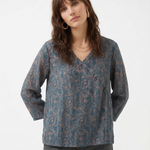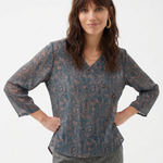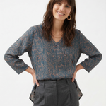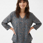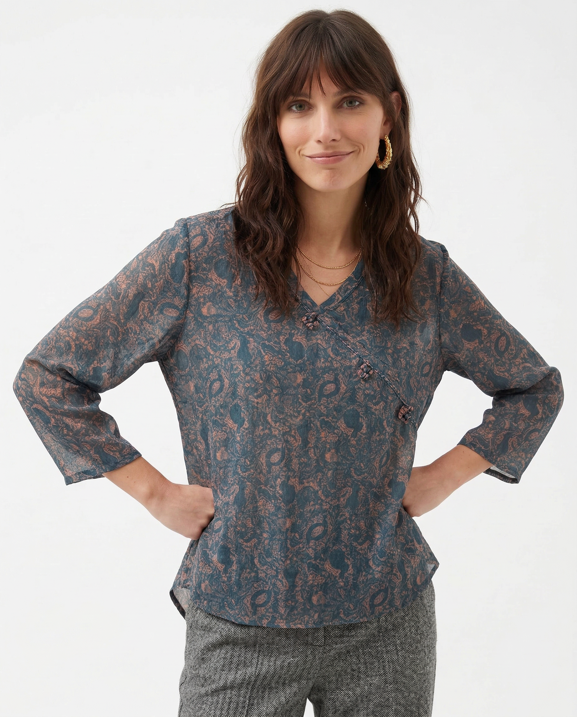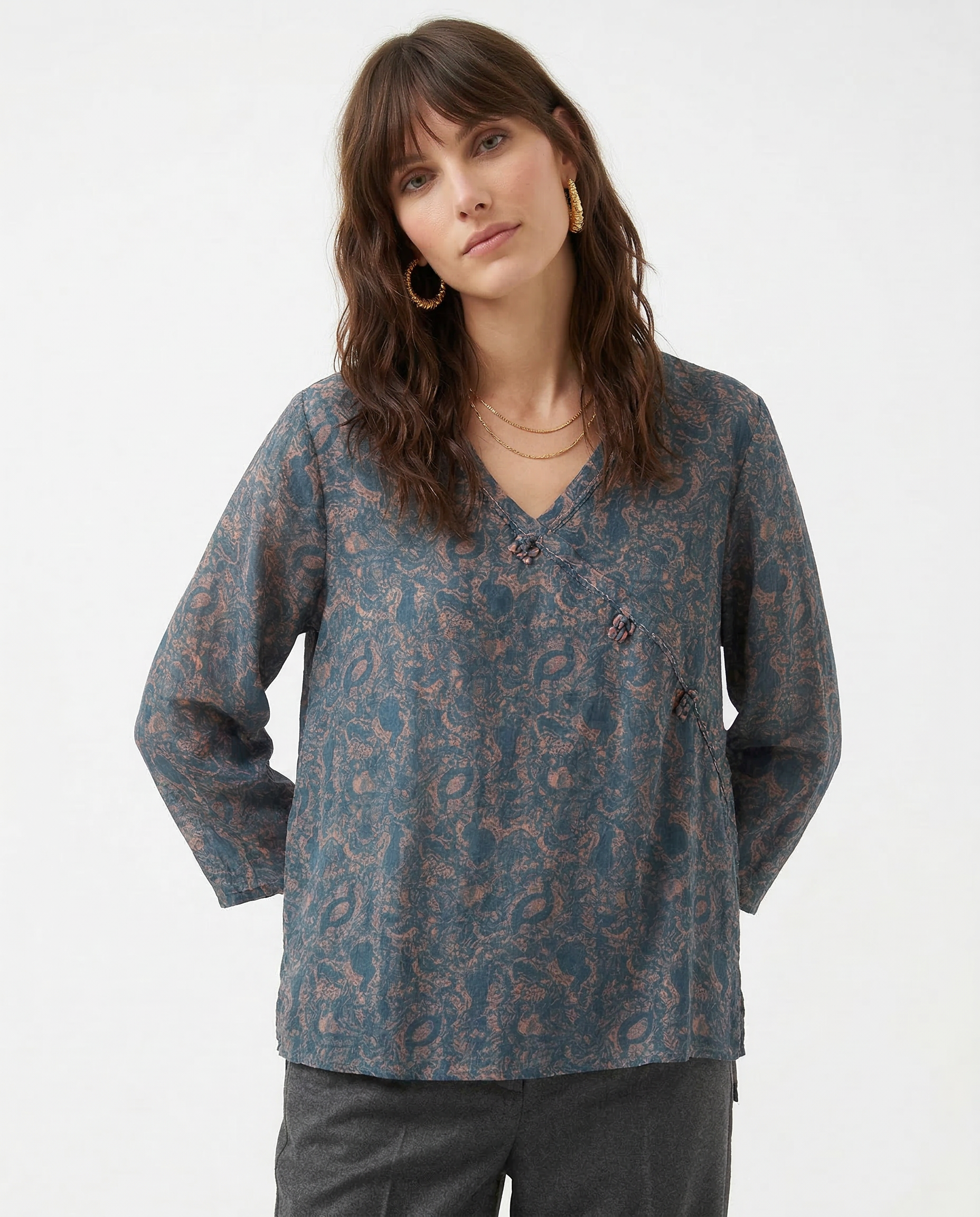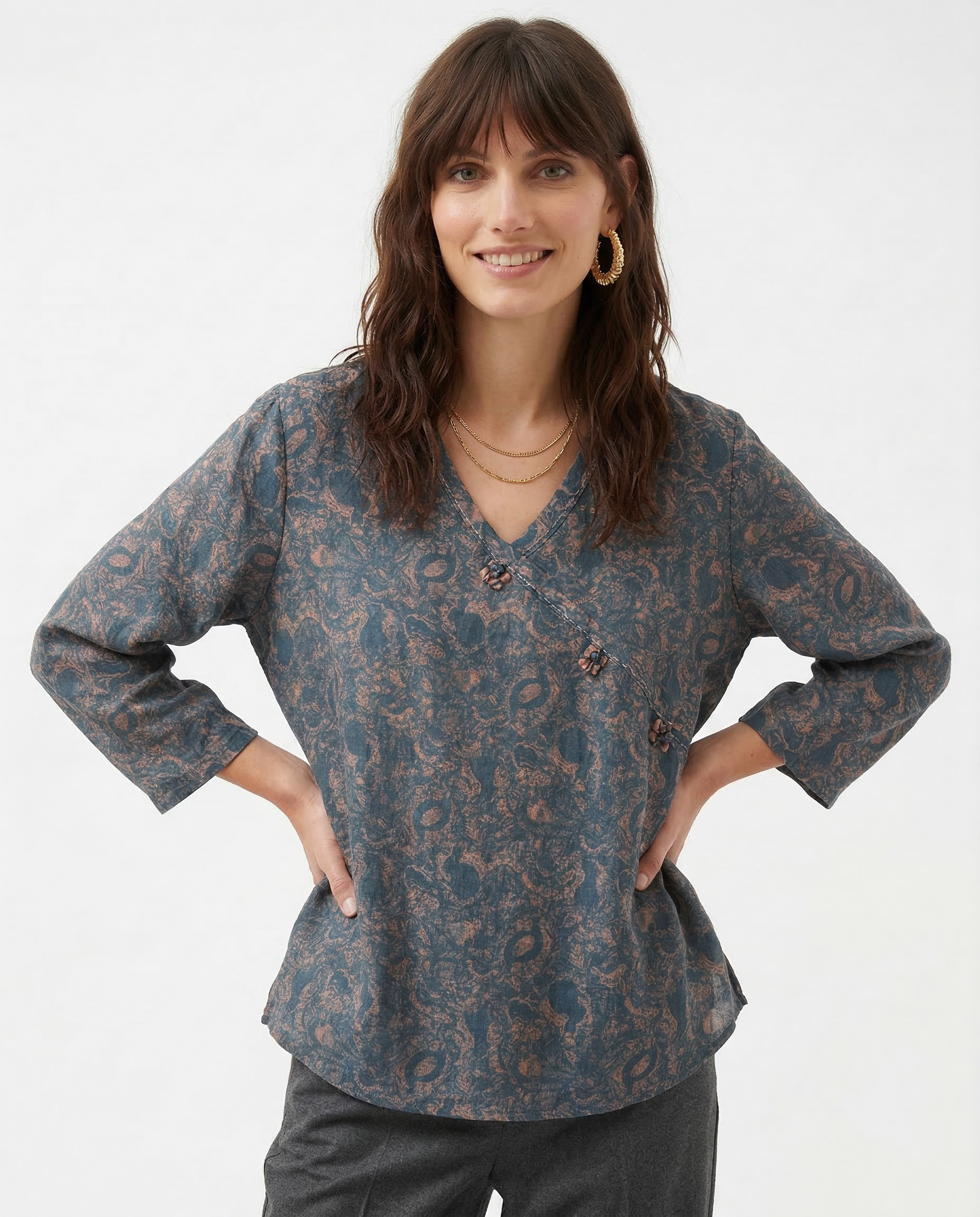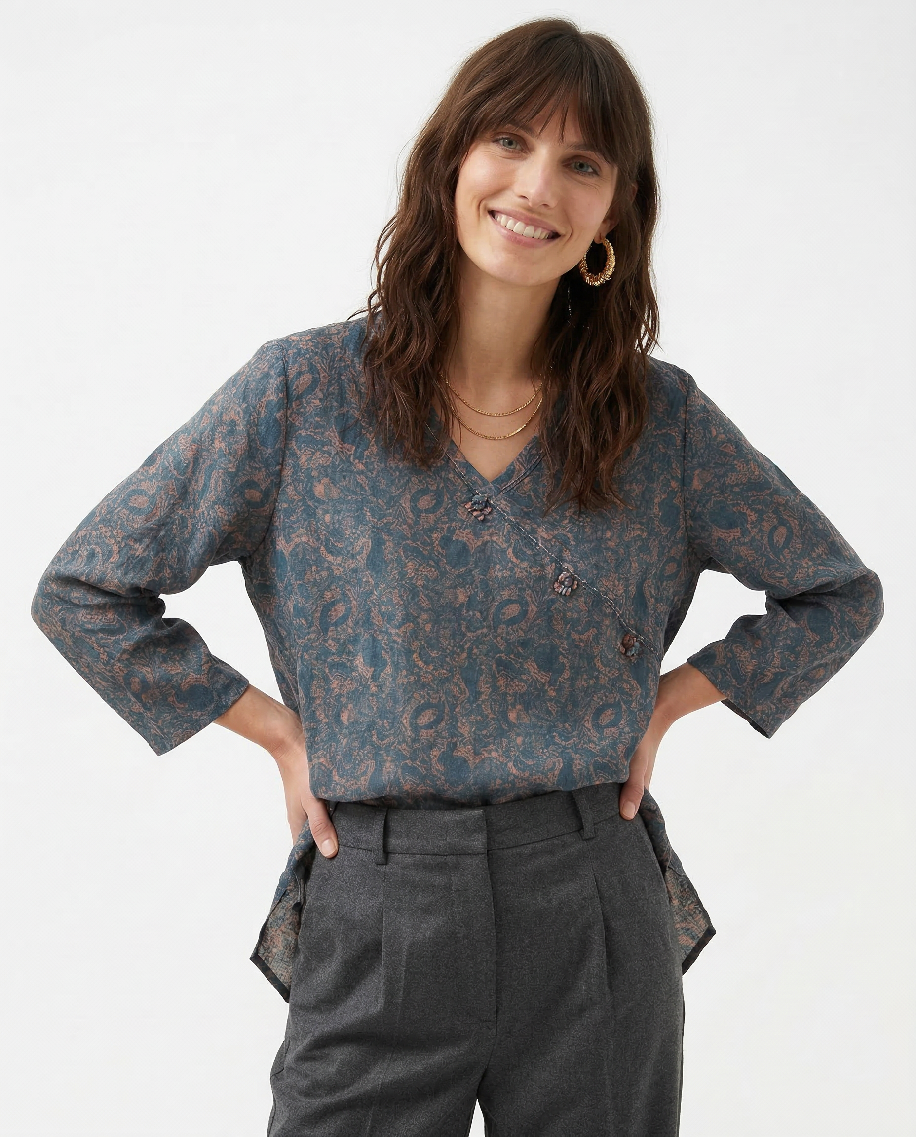 Bathed in earthy hues and rich texture, this crossover blouse brings a quiet strength to any day. Its asymmetrical wrap design and painterly print whisper stories of tradition and freedom.