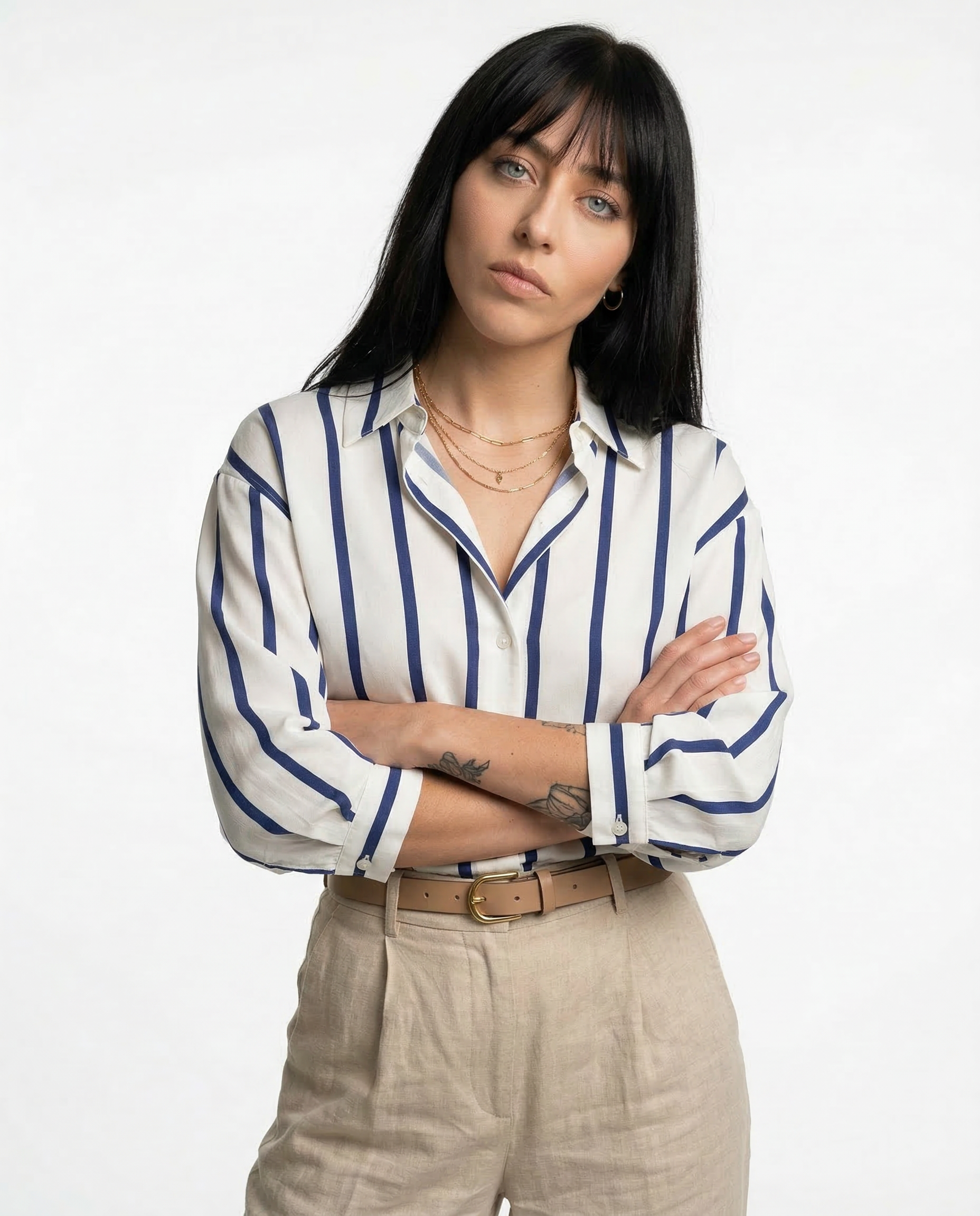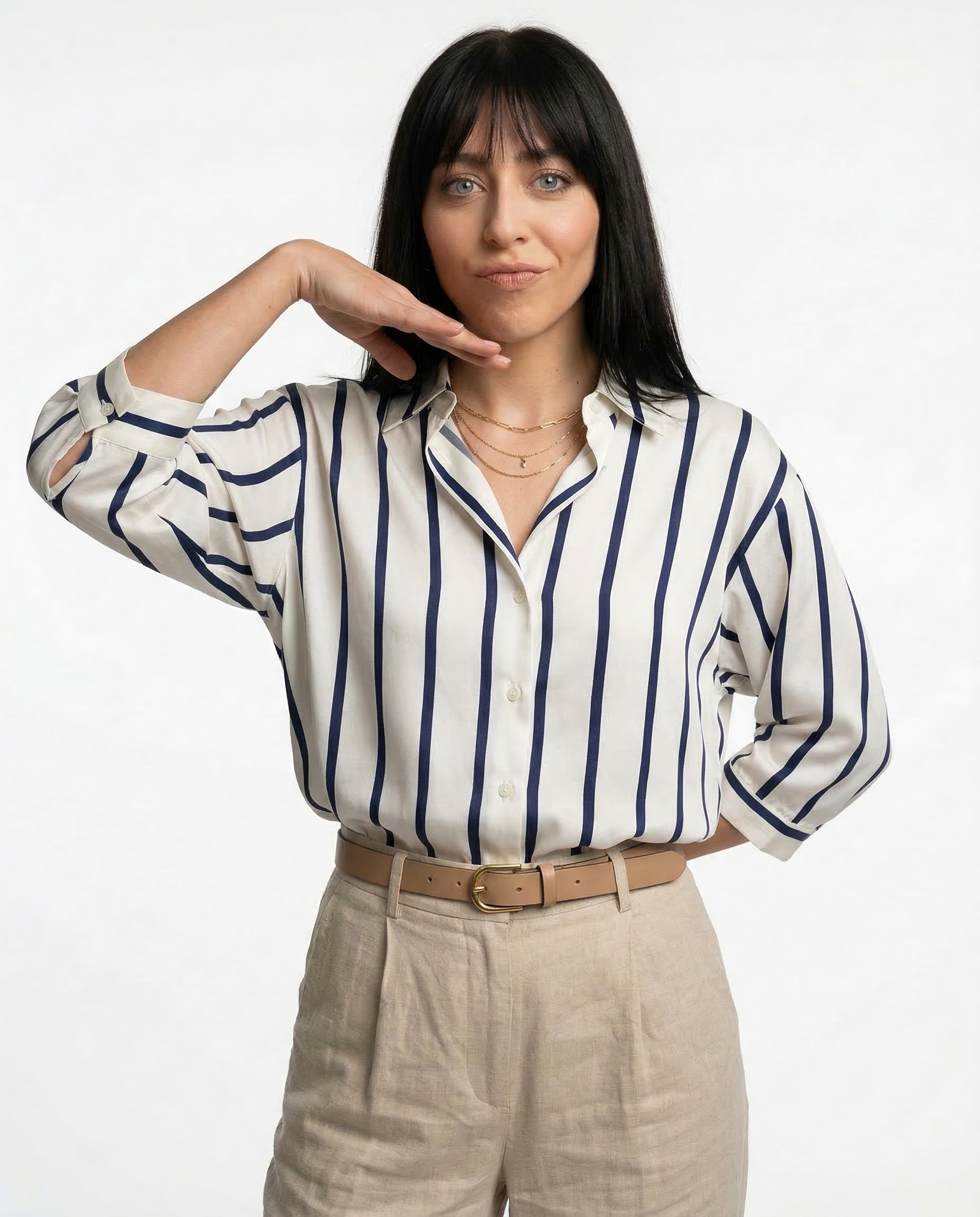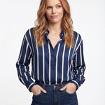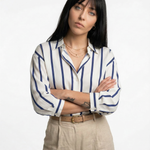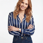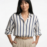 Power moves never looked this smooth. With bold stripes, a silky drape, and just enough slouch to feel effortless, this blouse owns every room—boardroom or bar.