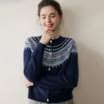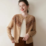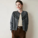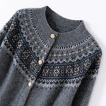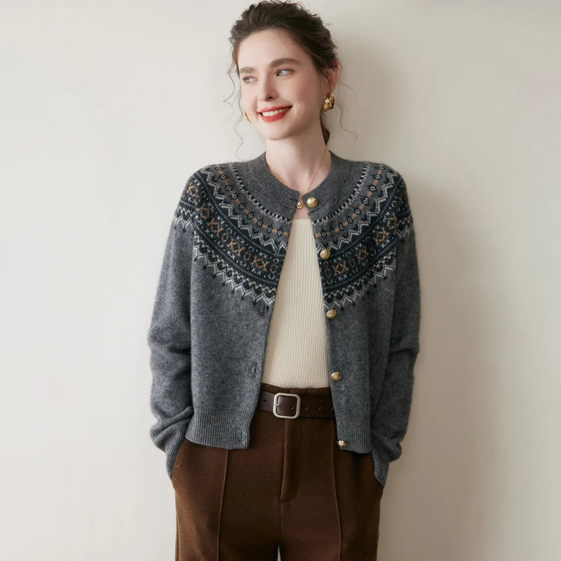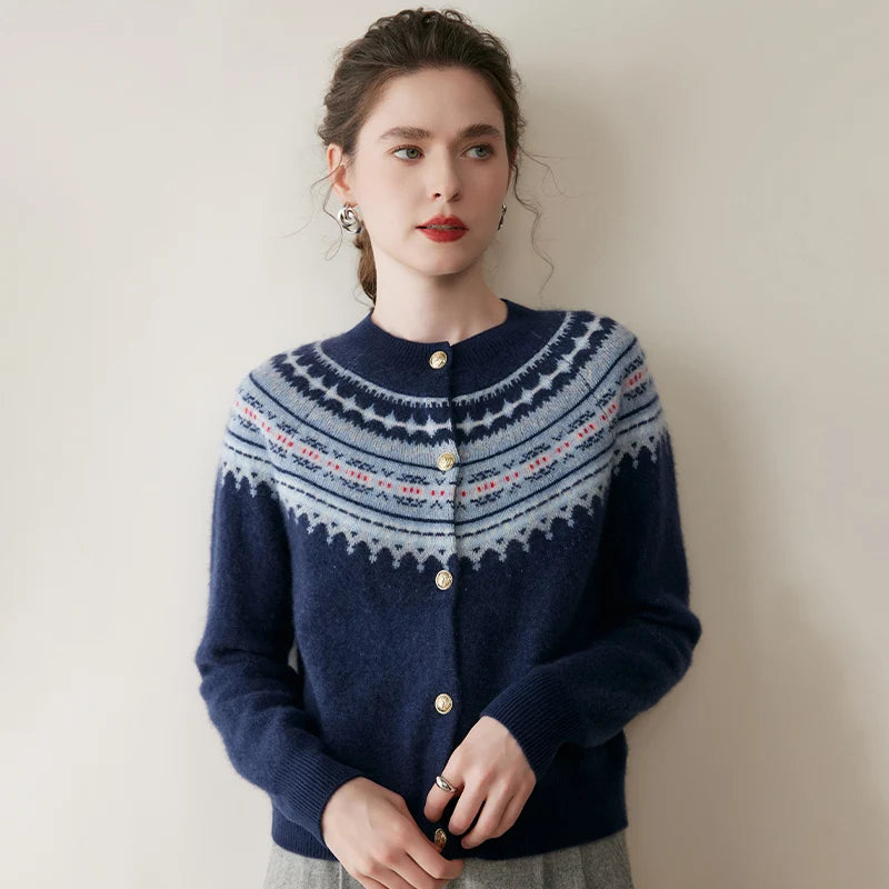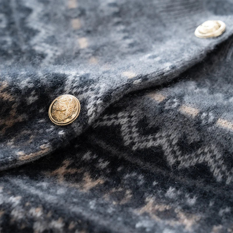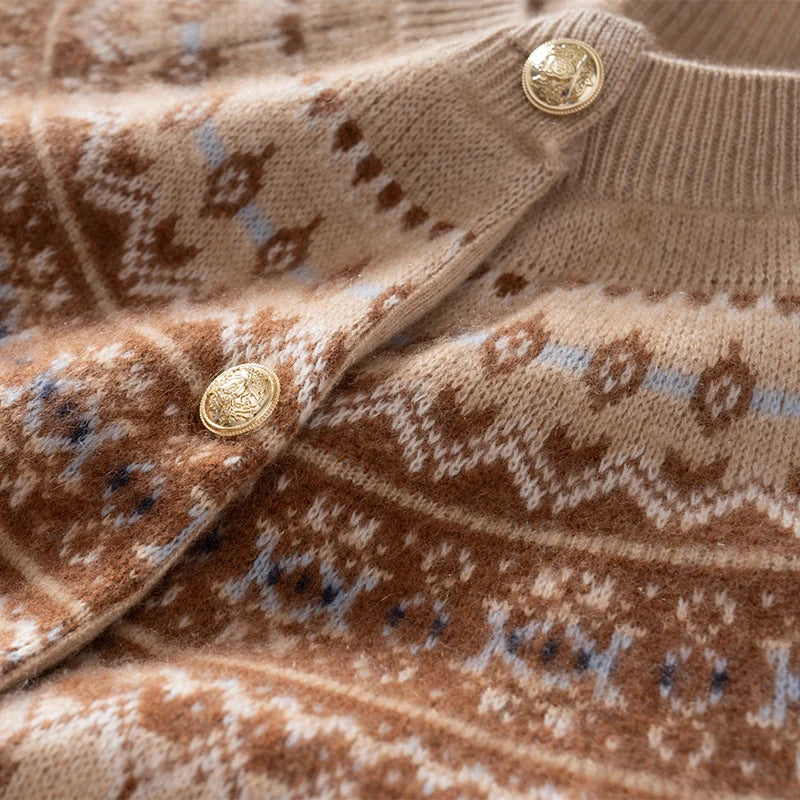 Soft warmth meets quiet charm in this Fair Isle cashmere cardigan — the kind of knit that feels nostalgic and refined all at once. The thick cashmere and gentle drape make it the piece you reach for on cold mornings when you still want to look composed.