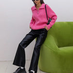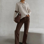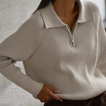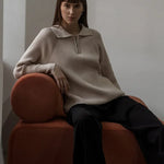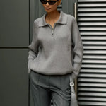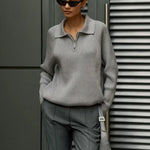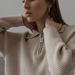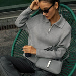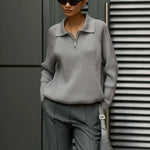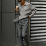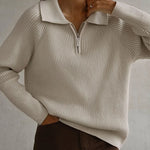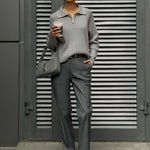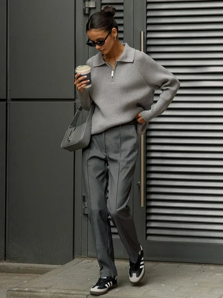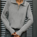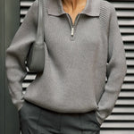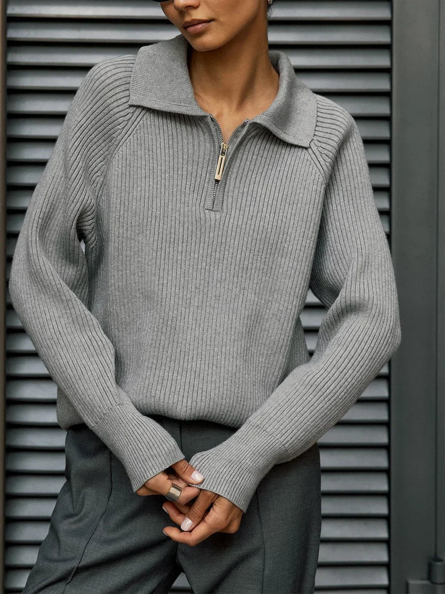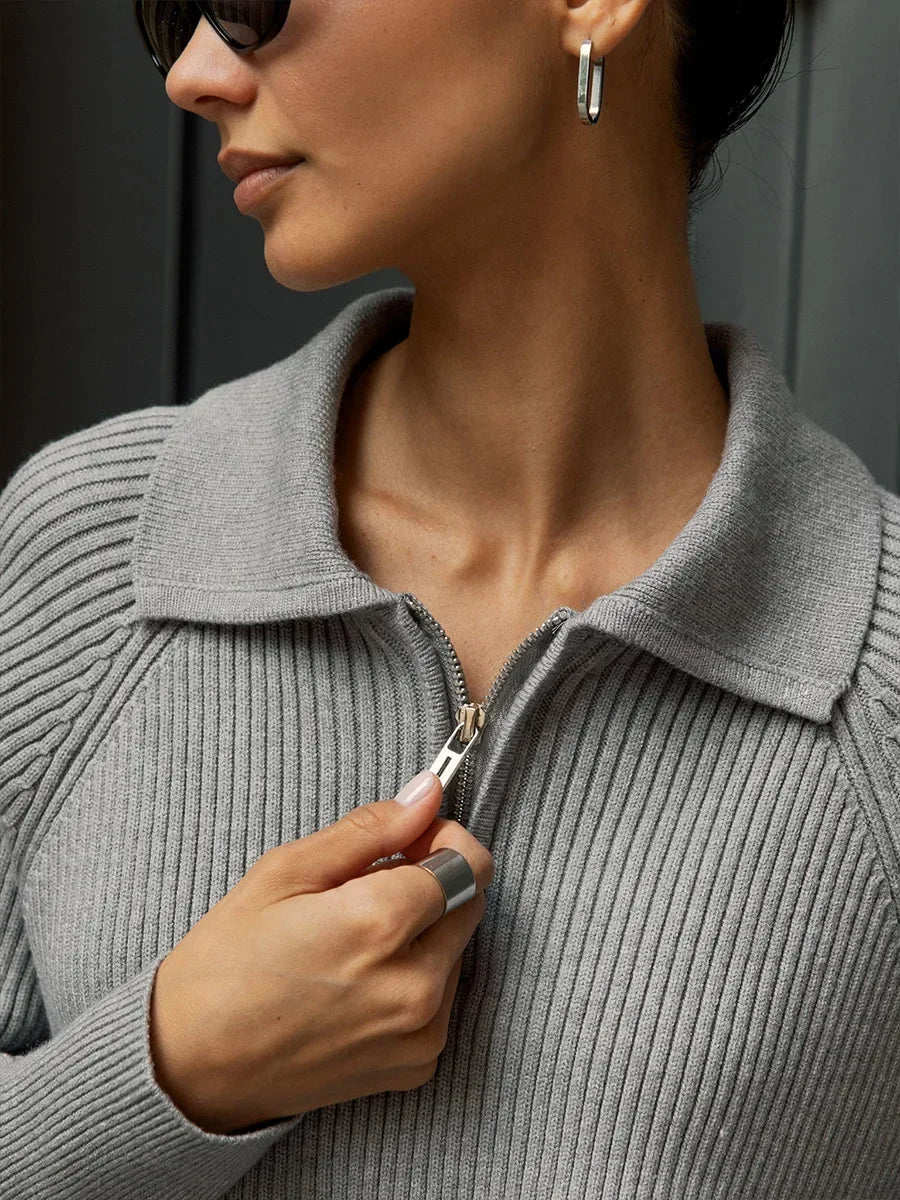 Understated and refined, this ribbed half-zip sweater blends modern minimalism with all-day comfort. Its soft grey hue and tailored polo collar make it perfect from office hours to evening plans.