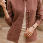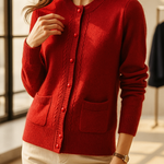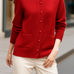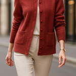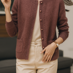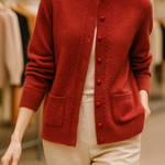 With a refined knit finish and pearl-detailed buttons, this cardigan blends everyday ease with polished charm. Its soft texture and front pockets make it as practical as it is graceful.
