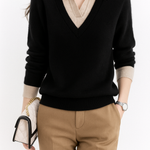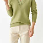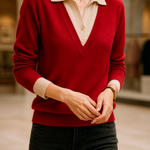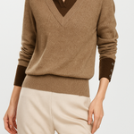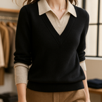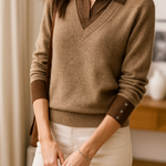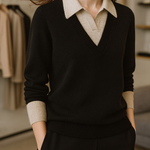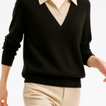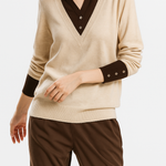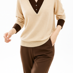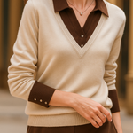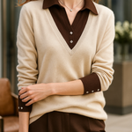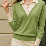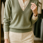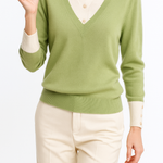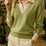 A clever patchwork knit that creates the illusion of layered elegance in one effortless piece. Soft sage green pairs with cream details and delicate buttons for a refined yet easy-to-wear pullover.