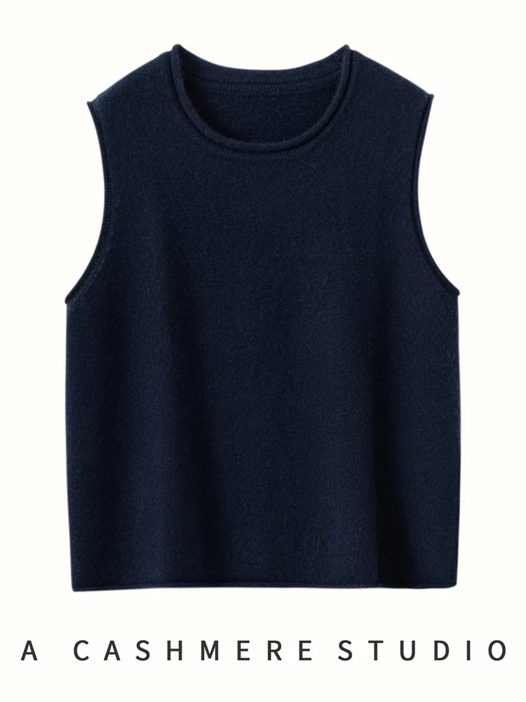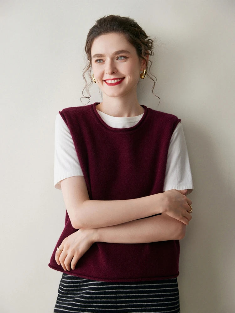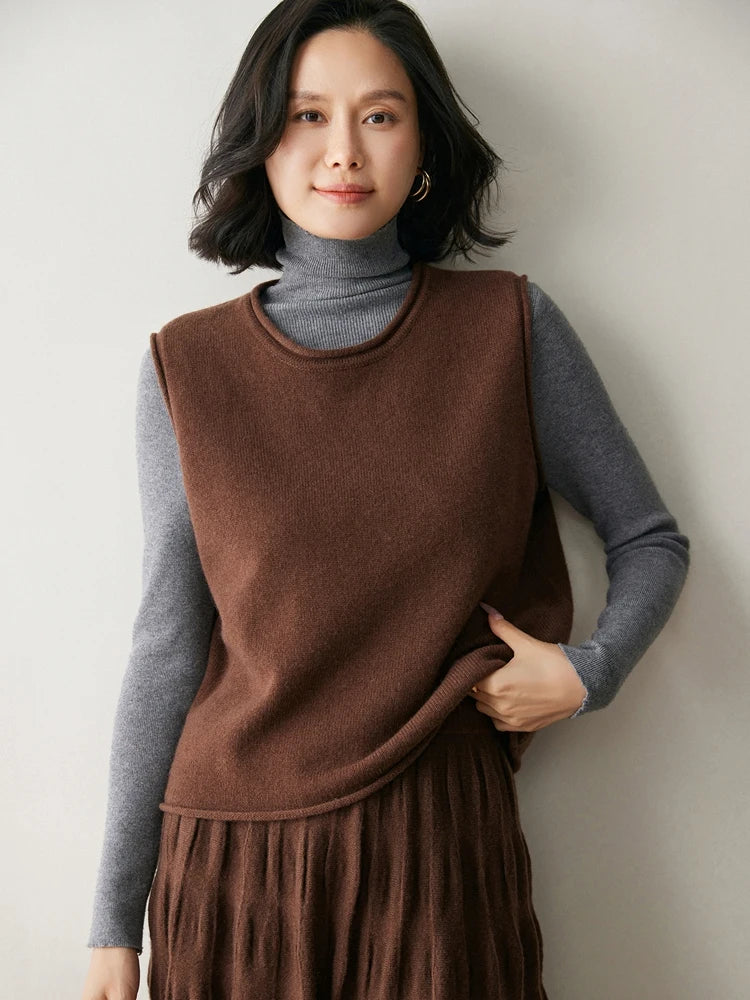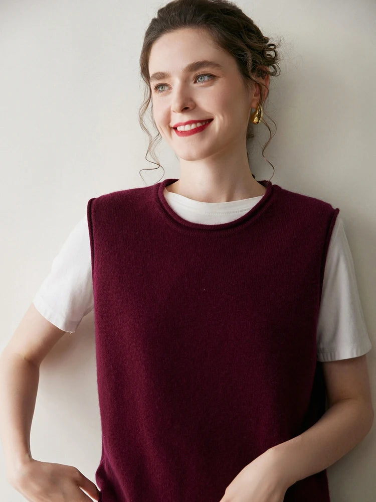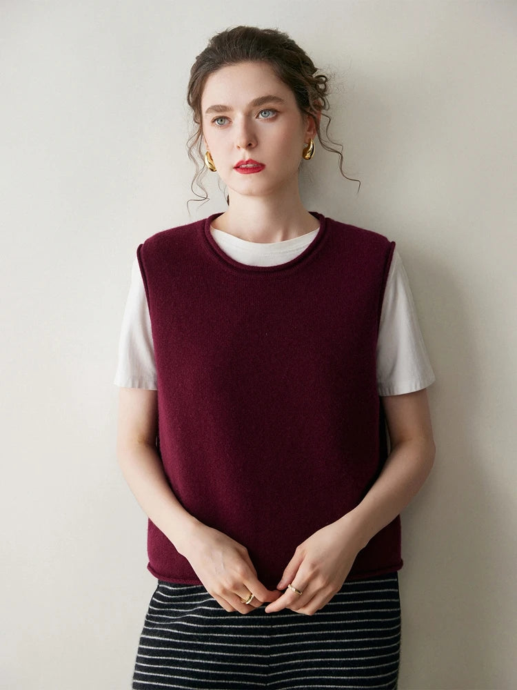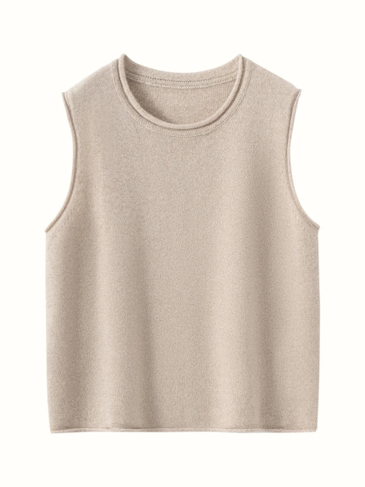 A refined sleeveless layer crafted from pure cashmere, this vest offers both warmth and versatility. Its clean lines and curled hem make it a staple for effortless autumn and winter dressing.