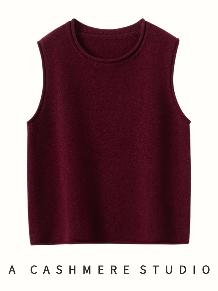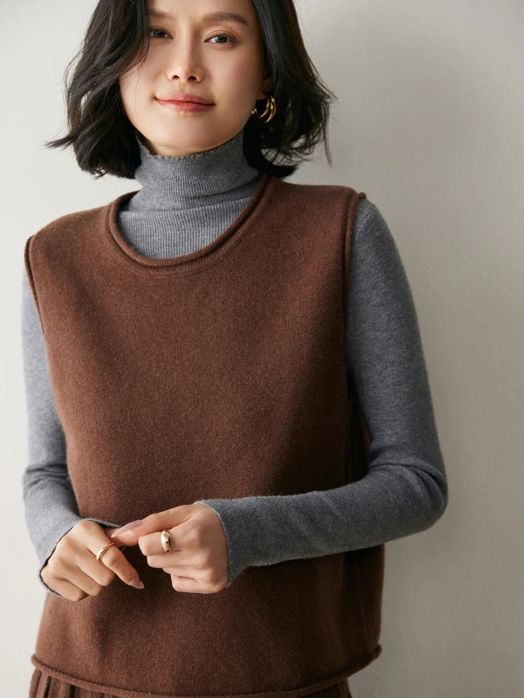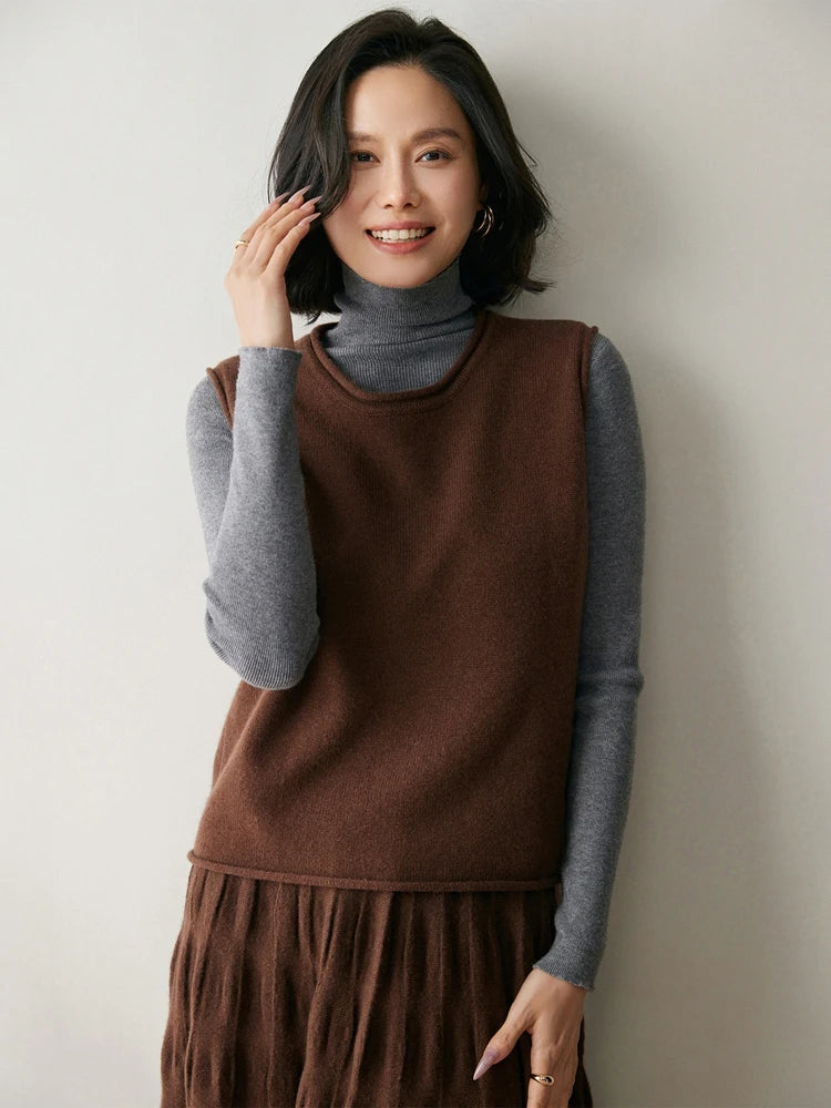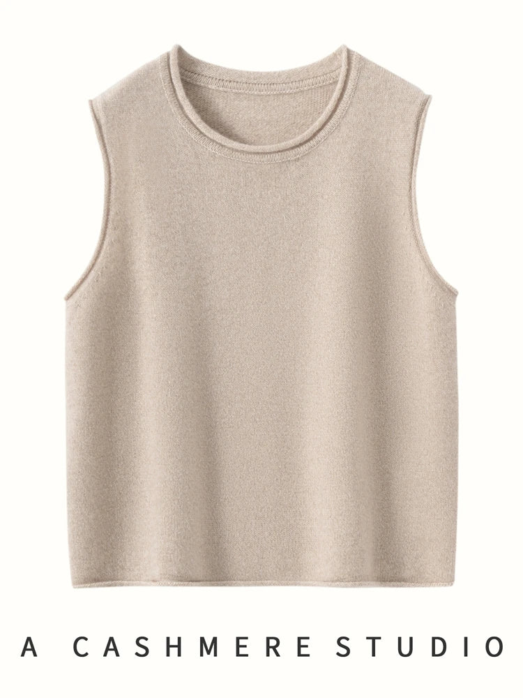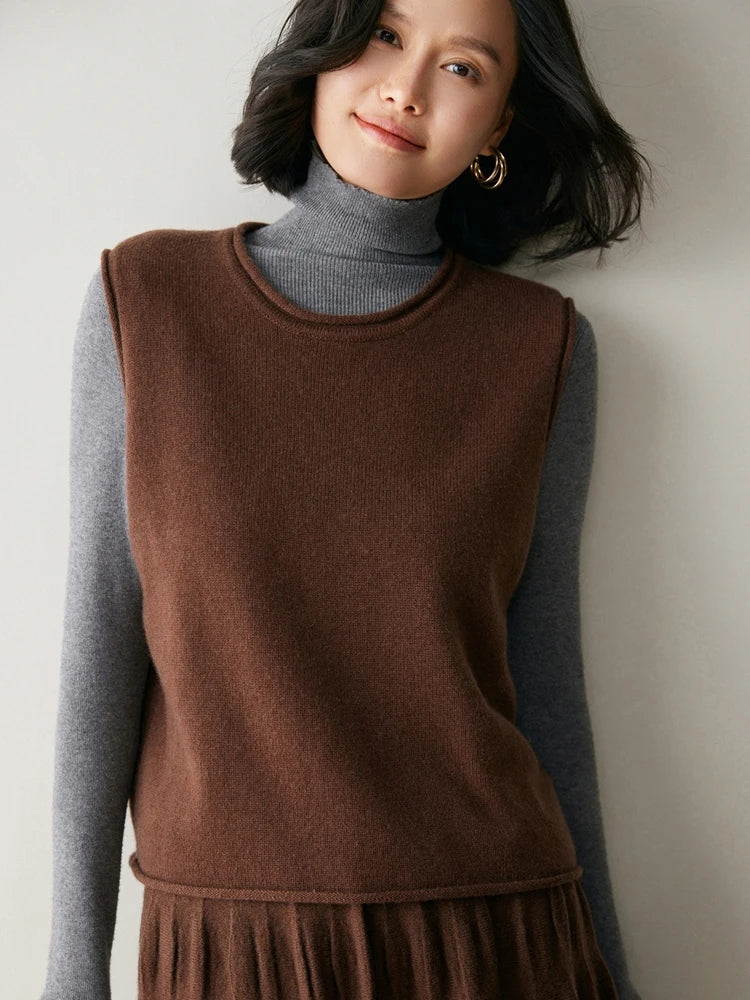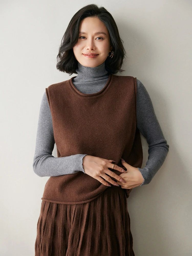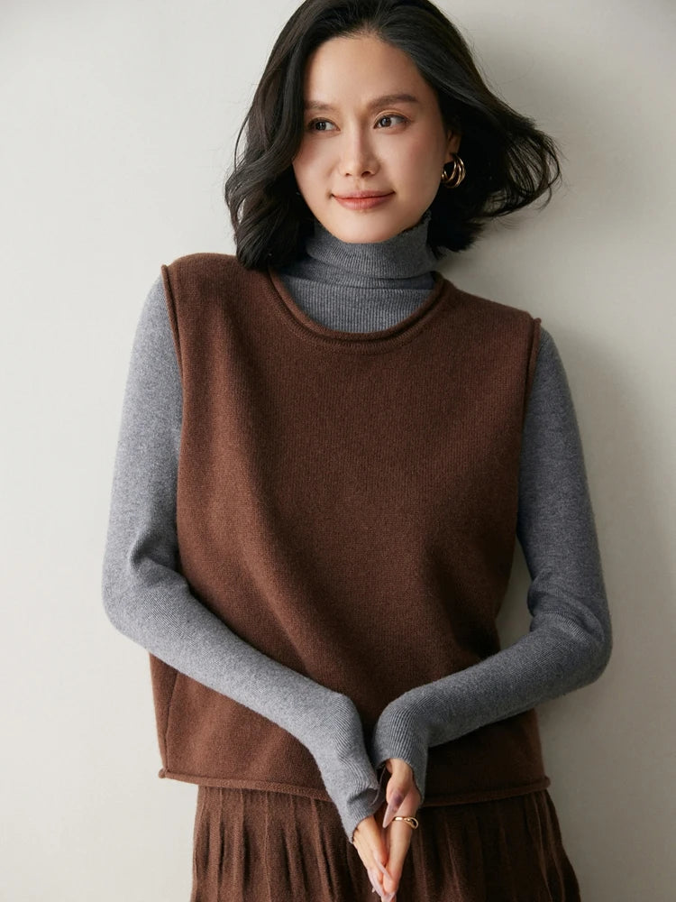 A refined sleeveless layer crafted from pure cashmere, this vest offers both warmth and versatility. Its clean lines and curled hem make it a staple for effortless autumn and winter dressing.
