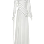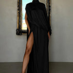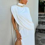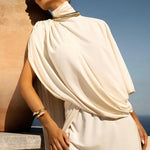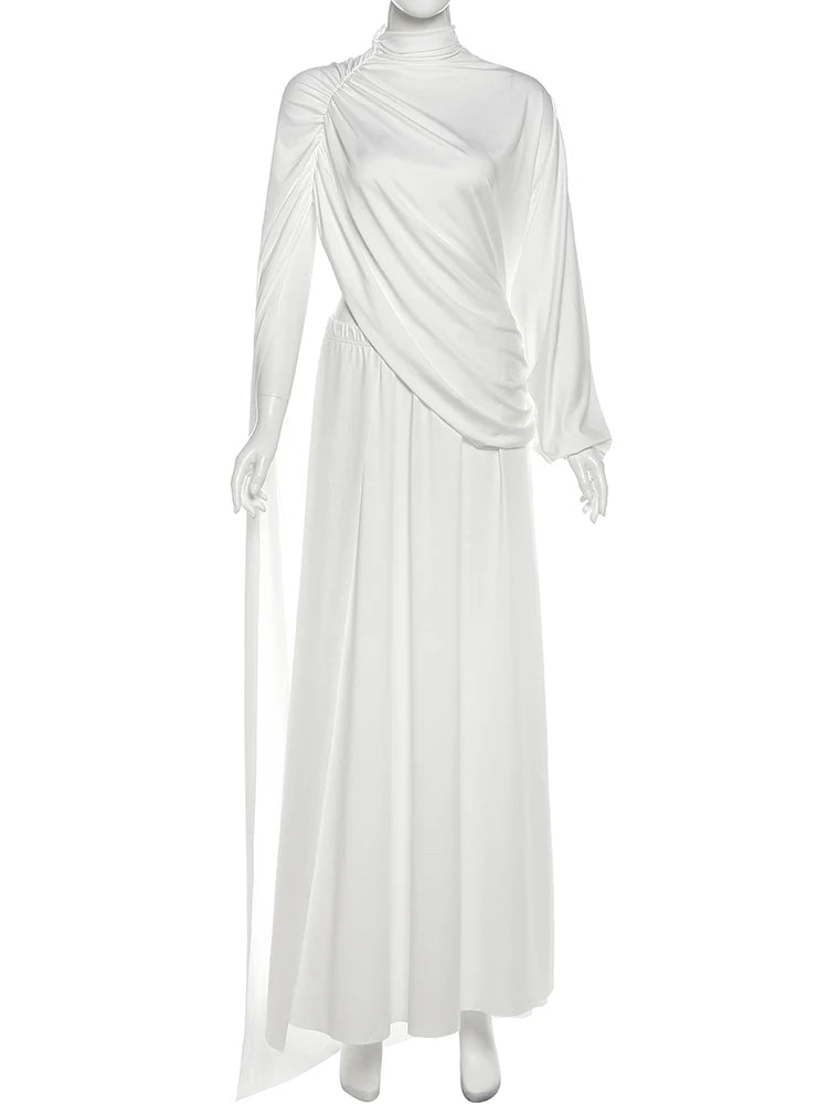 Fluid, sculptural, and quietly powerful. The asymmetric top falls with natural drama while the high-waist skirt skims the body, creating that goddess-energy look that feels effortless but unforgettable.