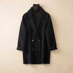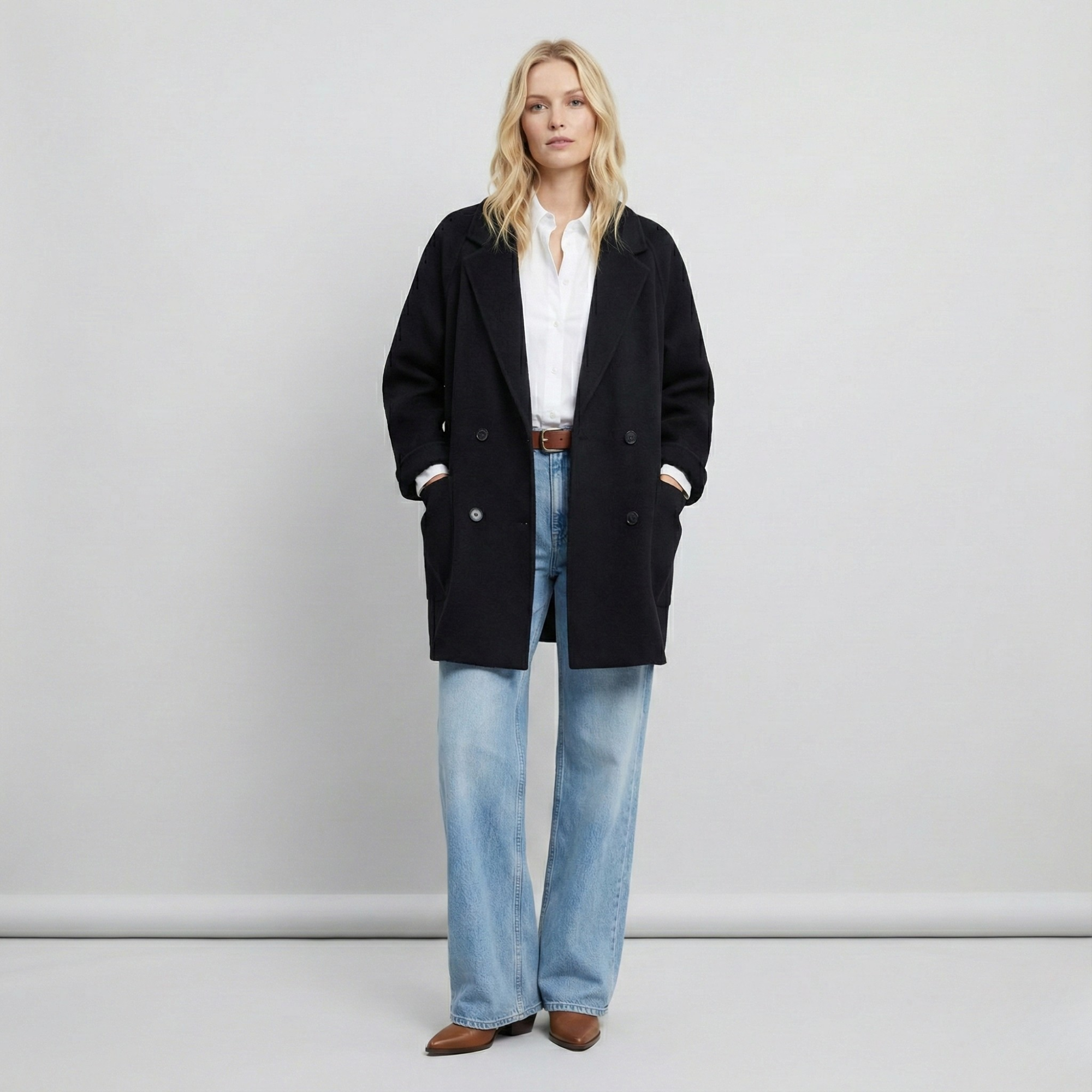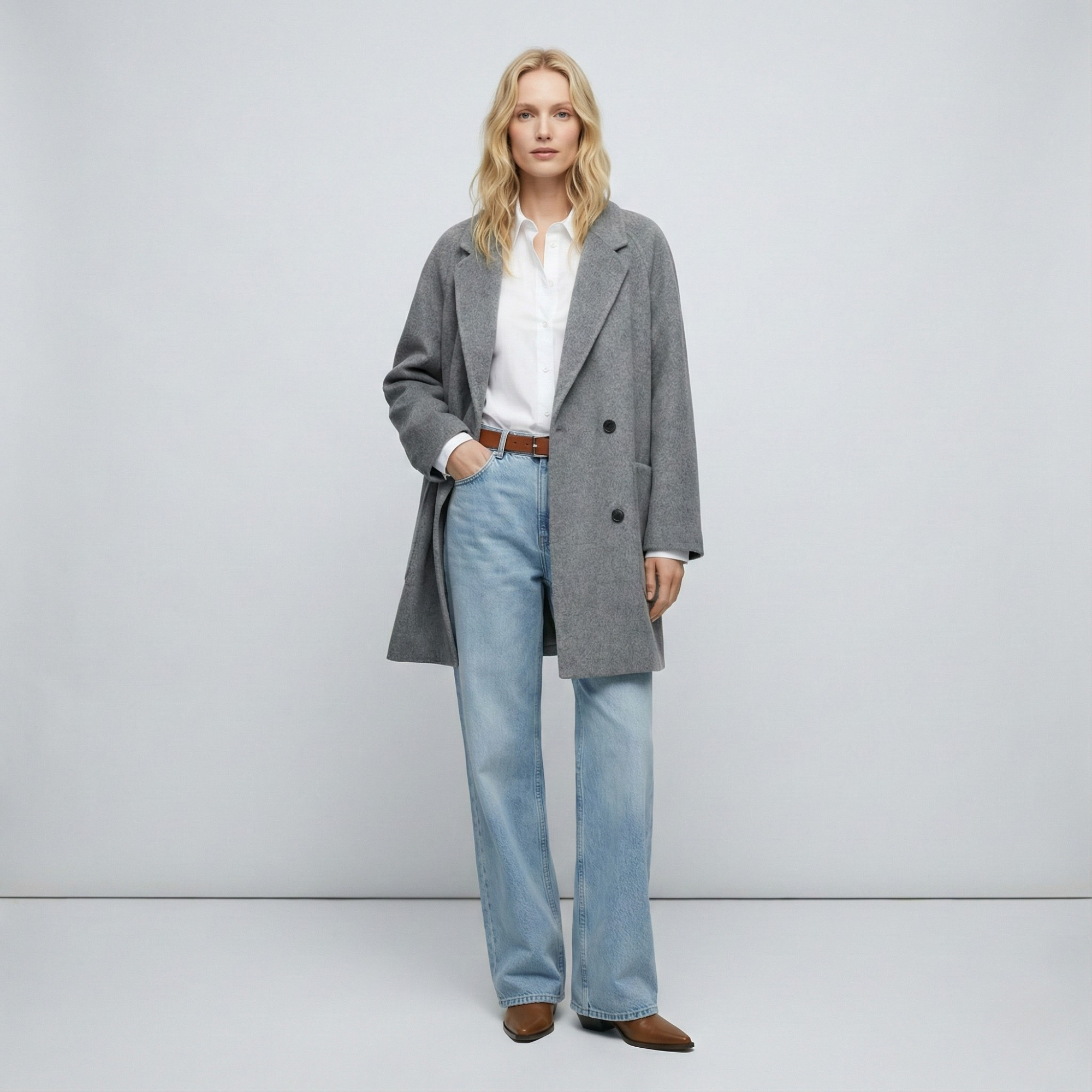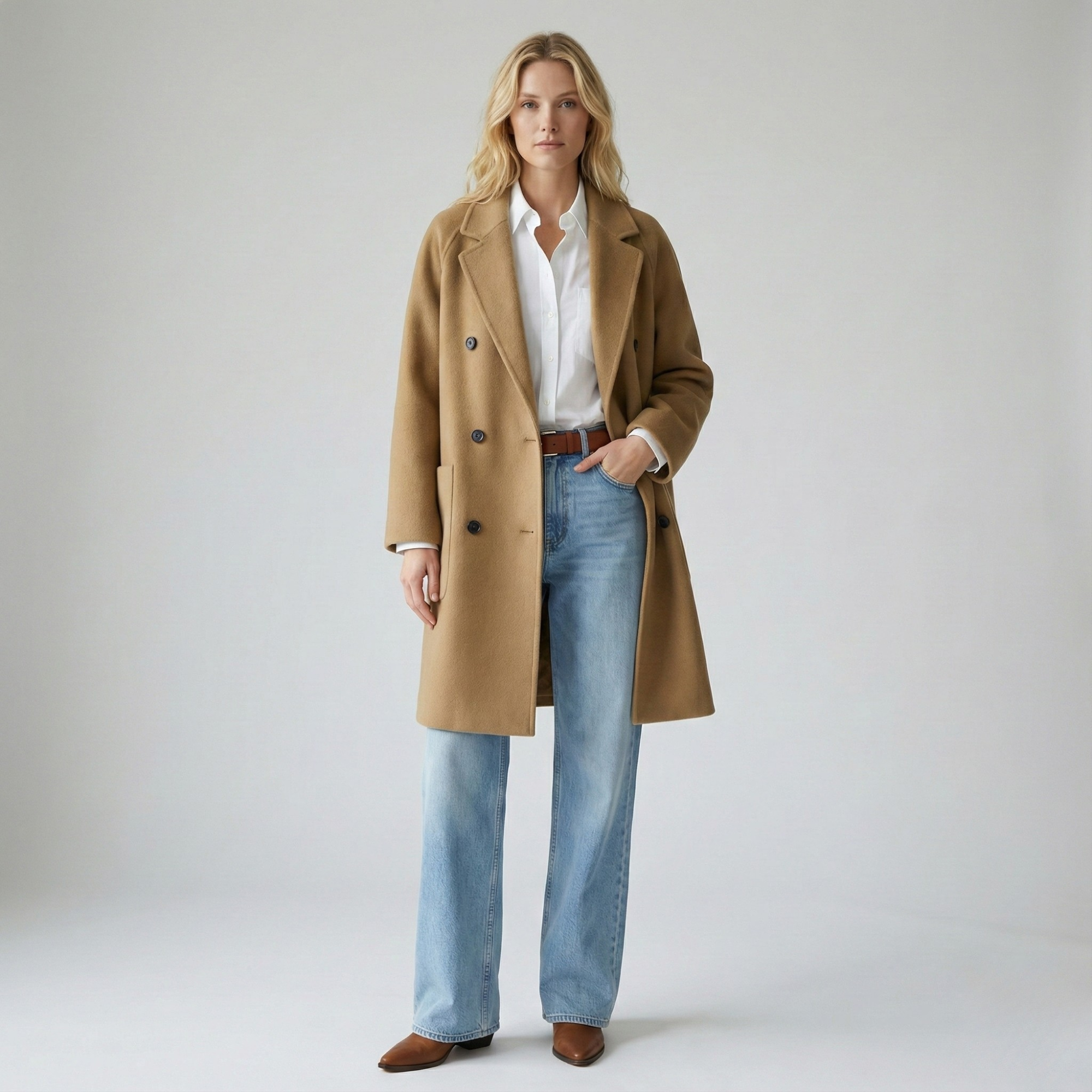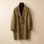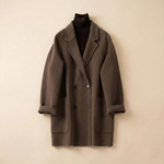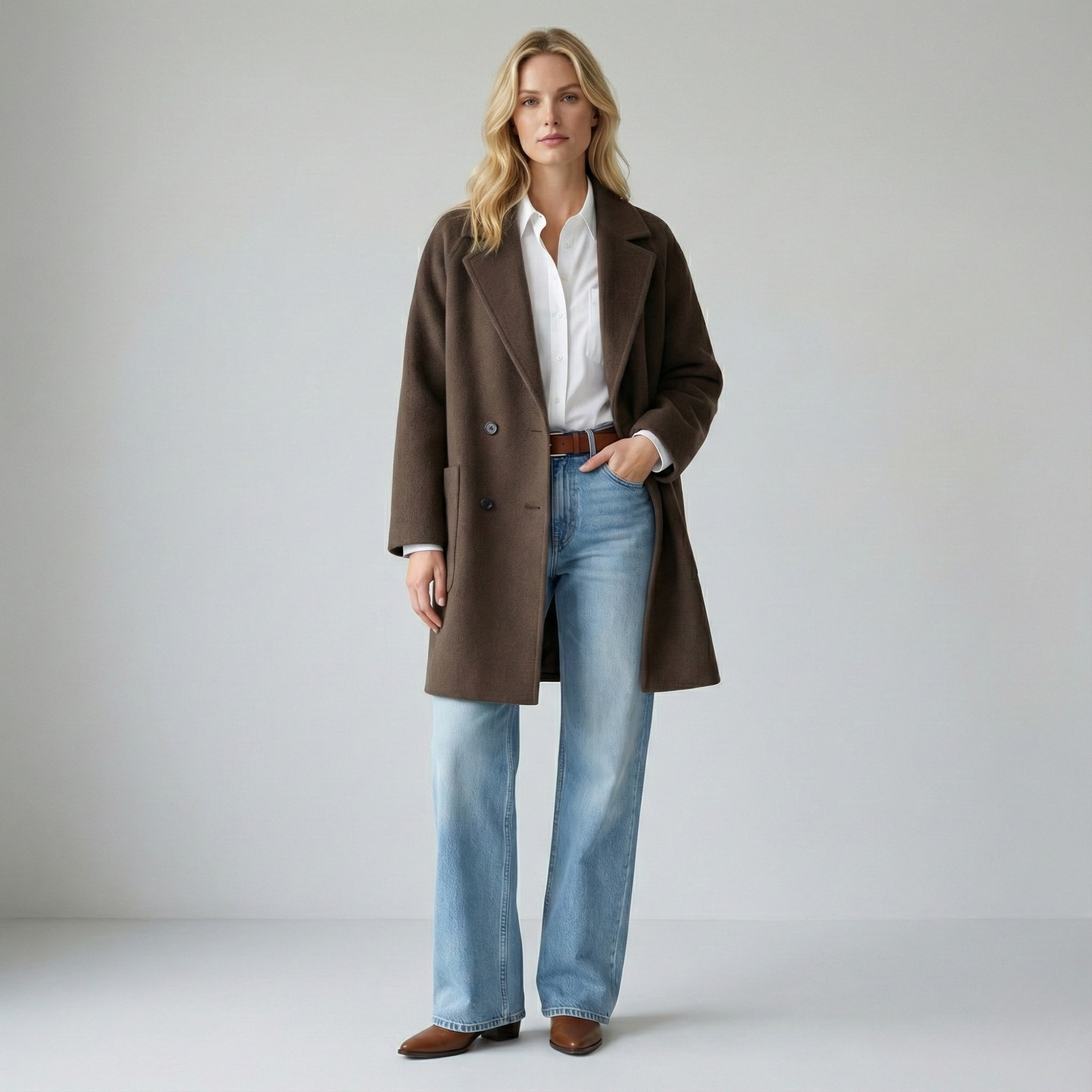 This coat brings that composed, winter-ready energy the moment it slips on — warm, structured, and quietly confident in its deep cocoa tone. It layers effortlessly over knits and adds instant polish to whatever you pair it with.