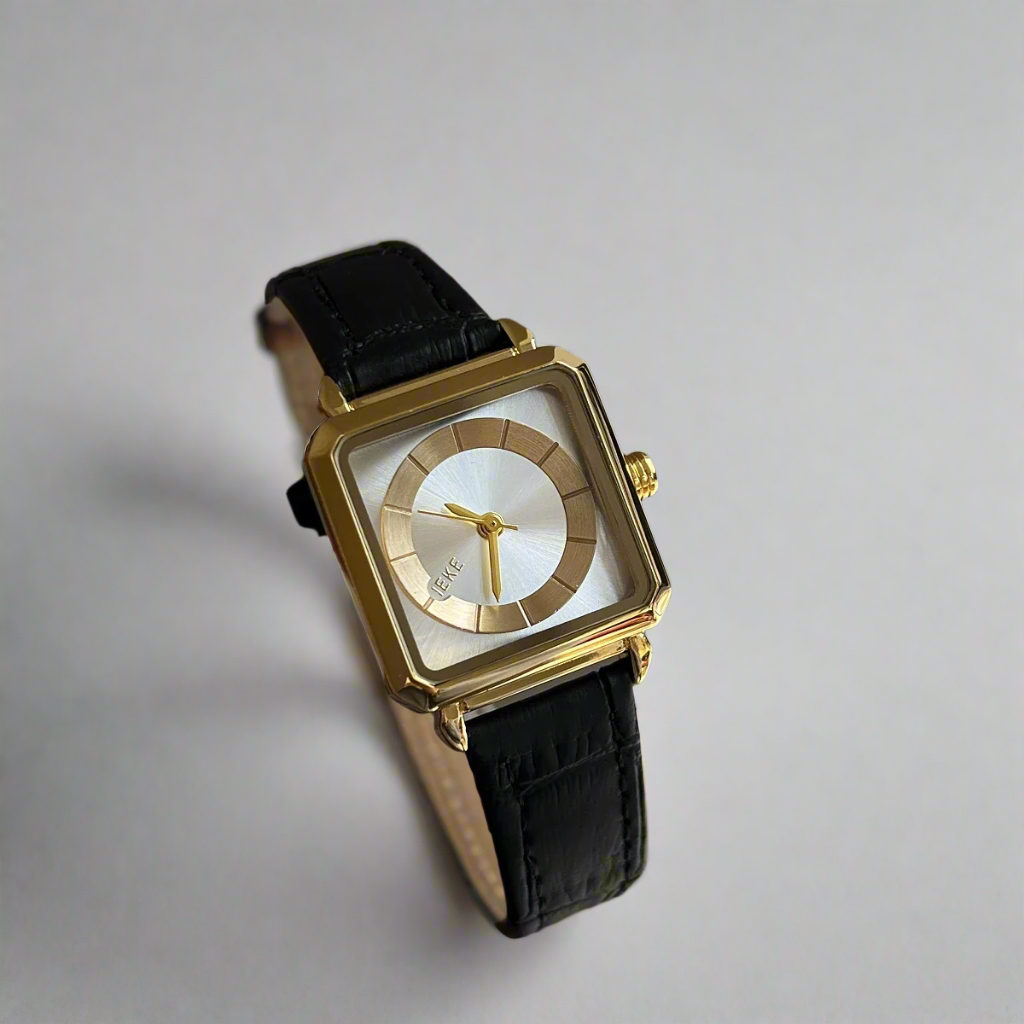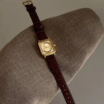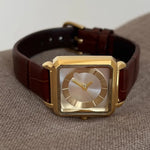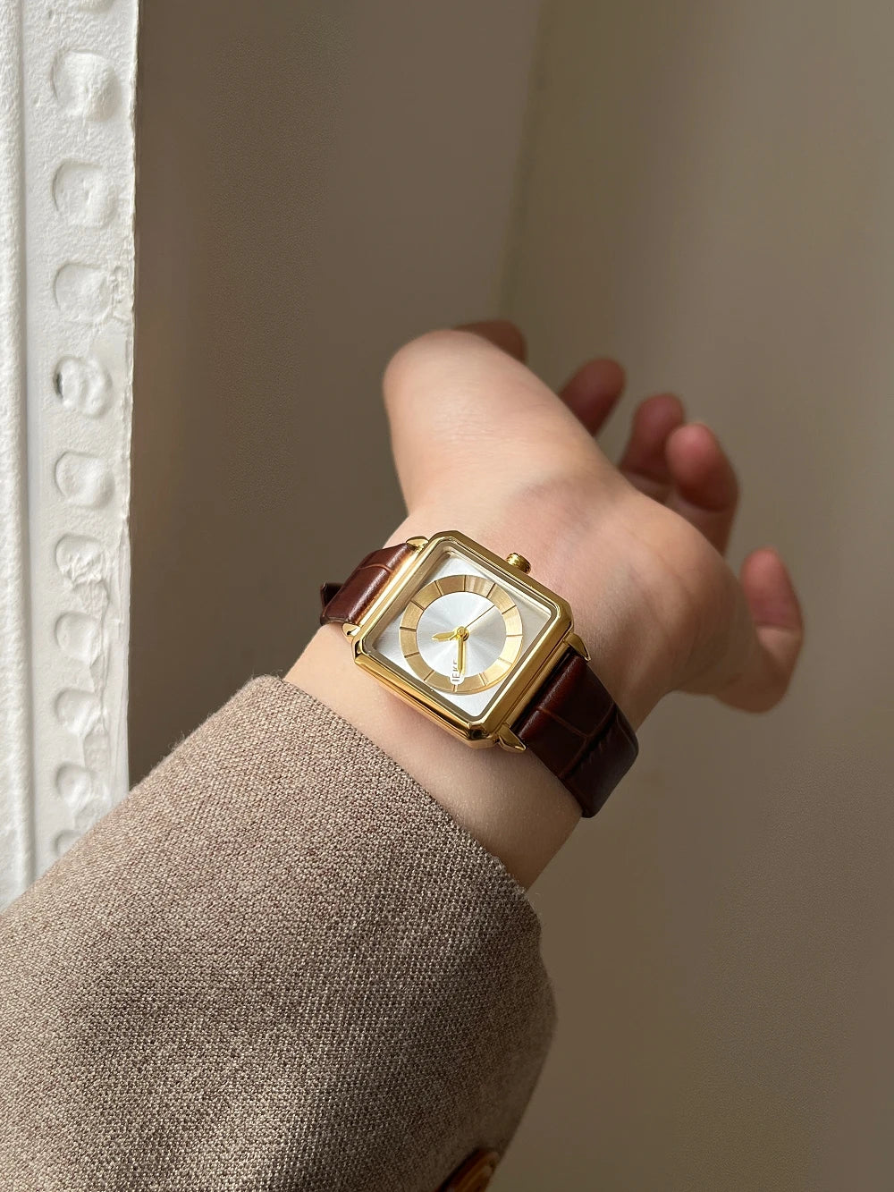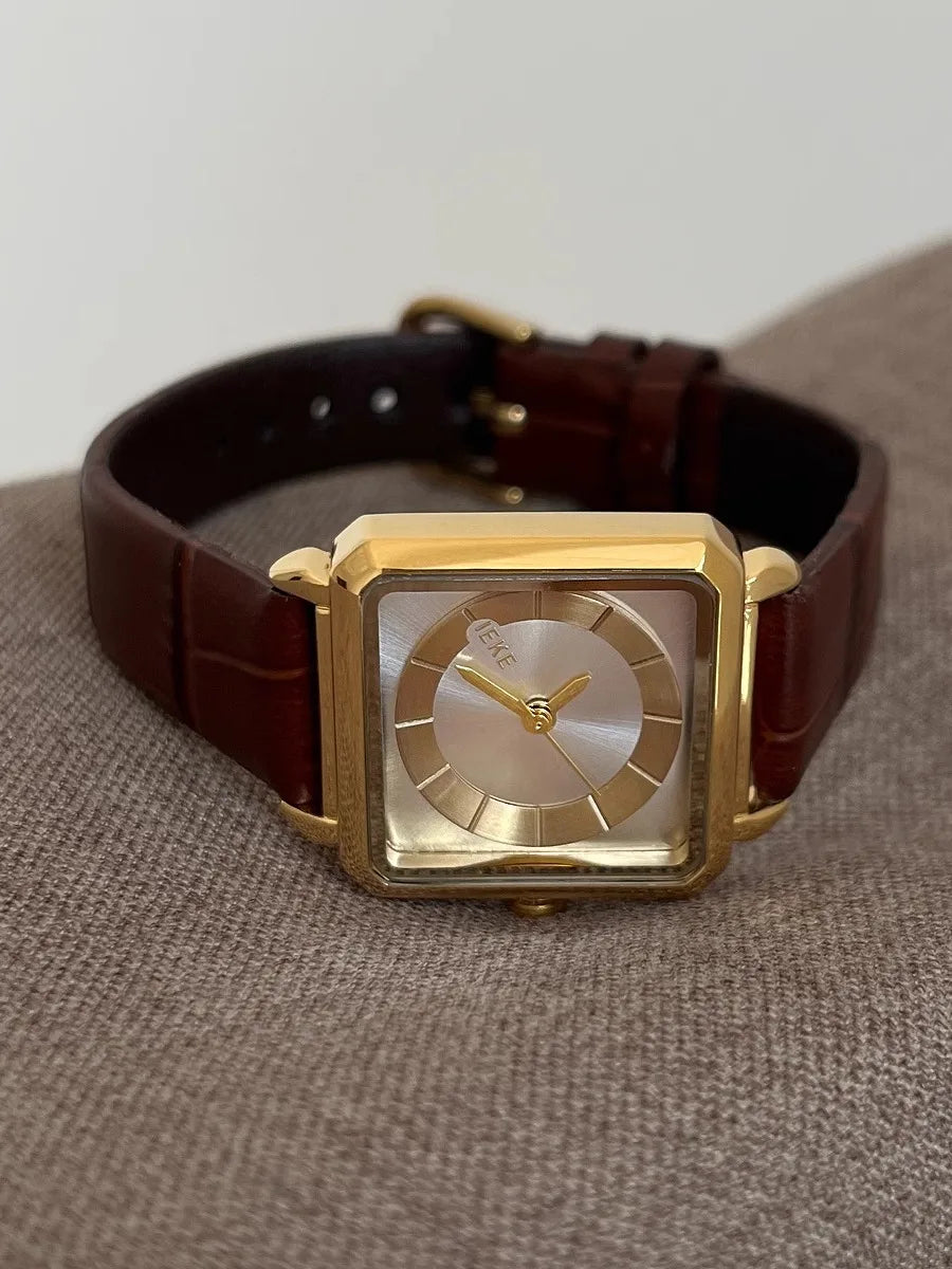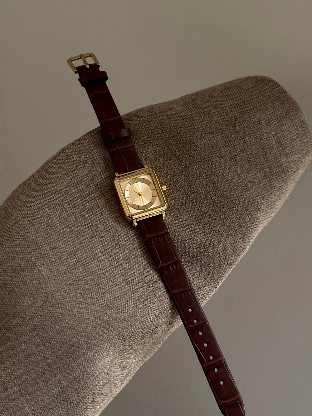 A modern nod to mid-century design, this gold-tone square watch features a clean dial framed by subtle geometric detailing. Paired with a supple leather strap, it’s the definition of understated elegance.