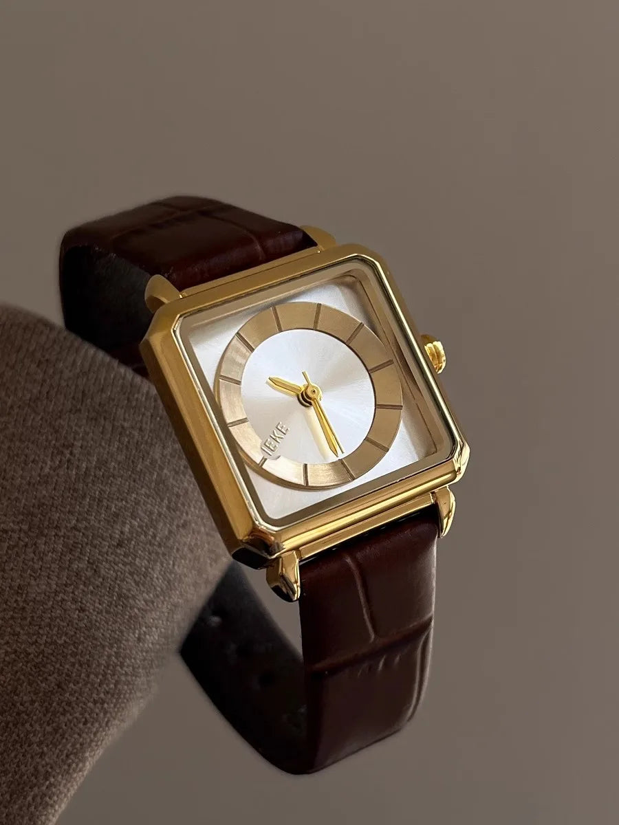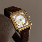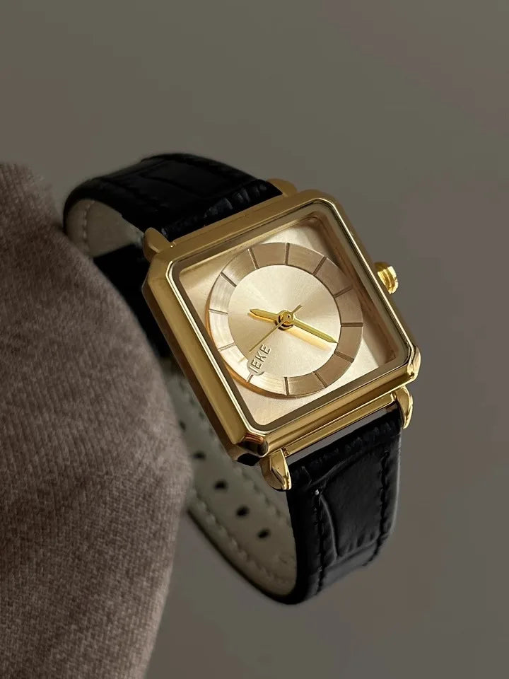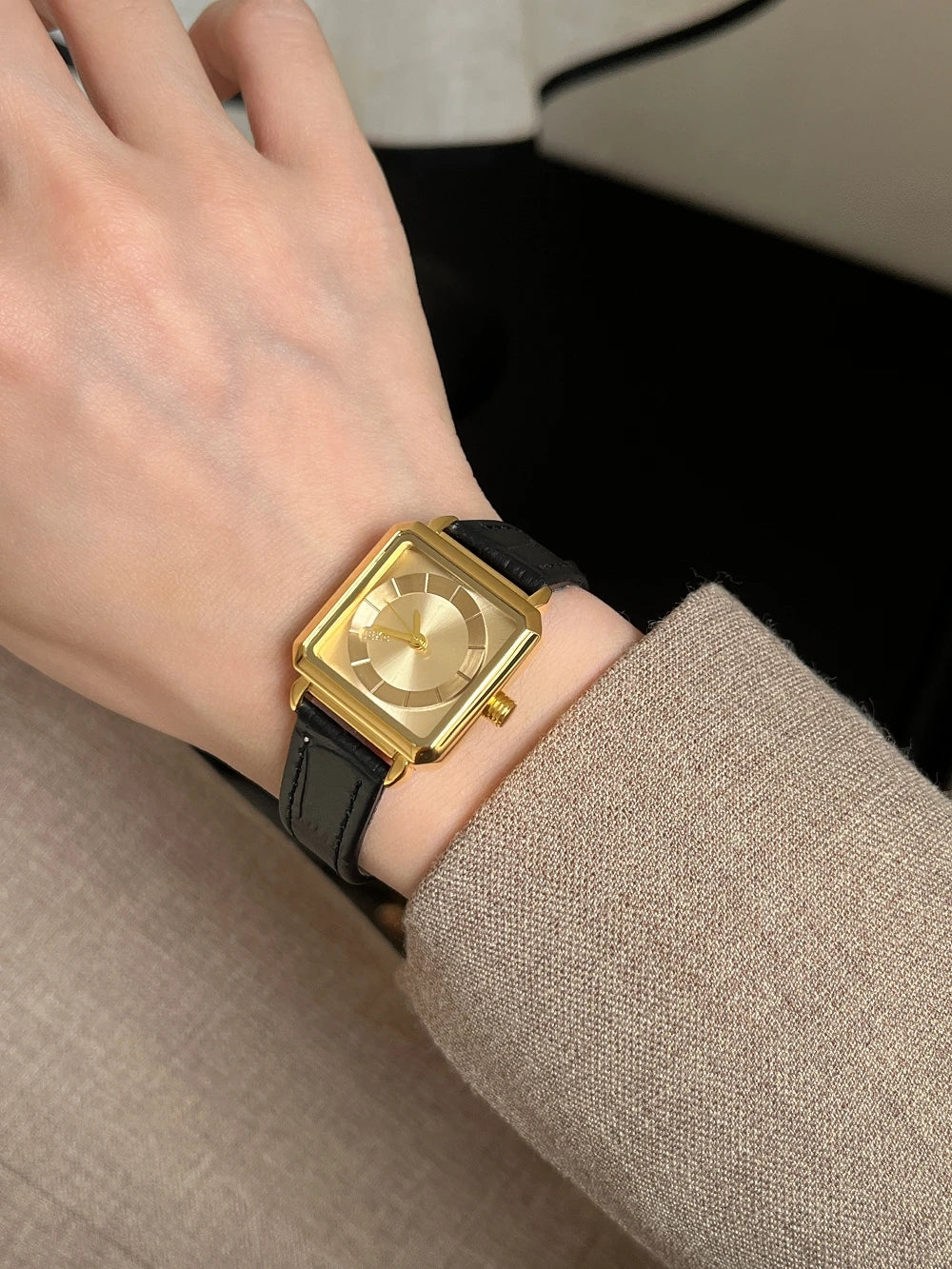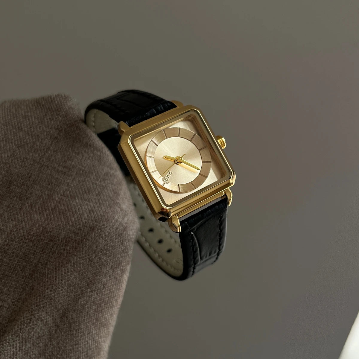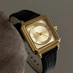 A modern nod to mid-century design, this gold-tone square watch features a clean dial framed by subtle geometric detailing. Paired with a supple leather strap, it’s the definition of understated elegance.