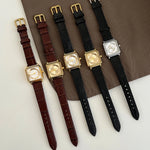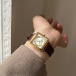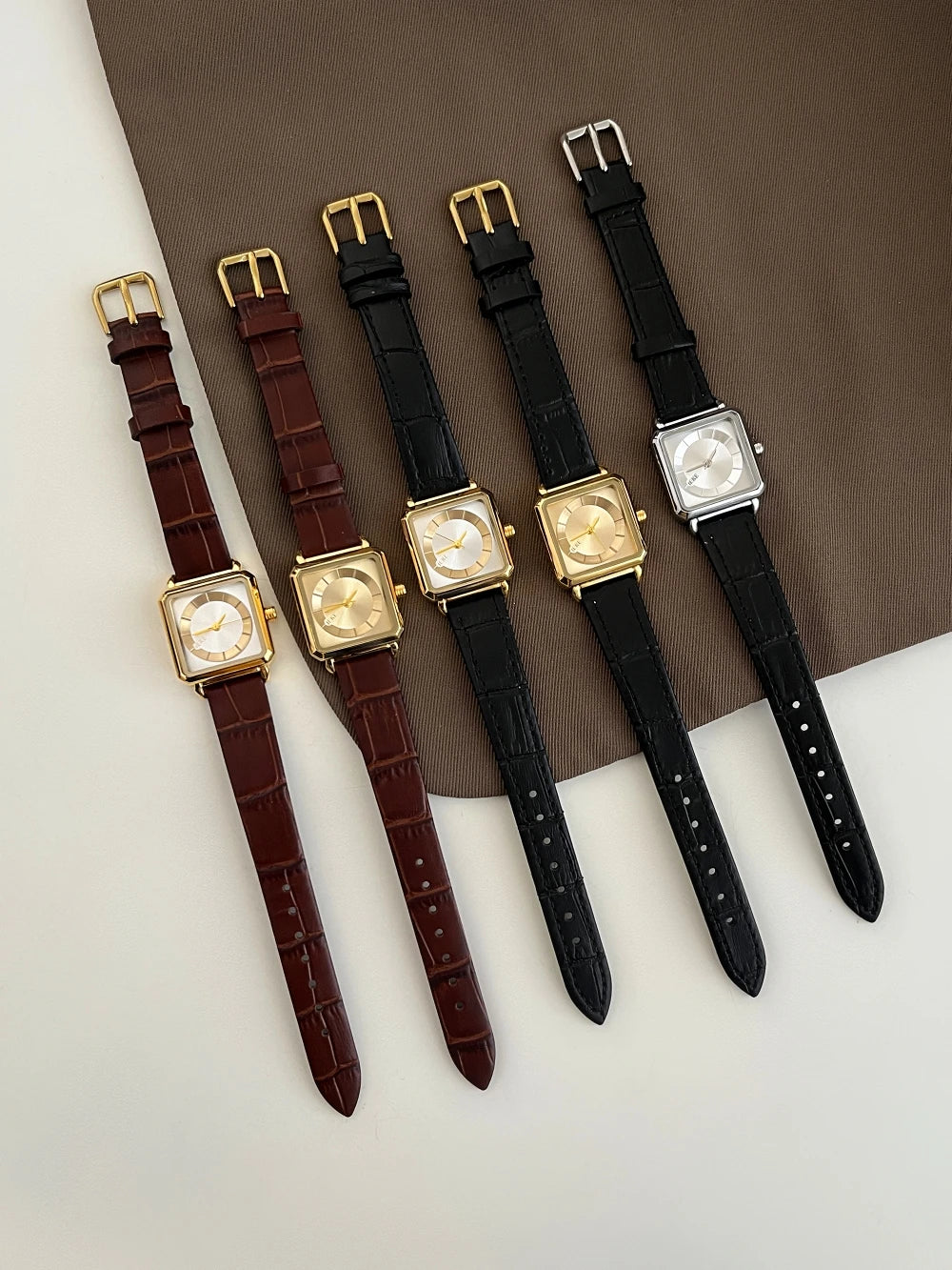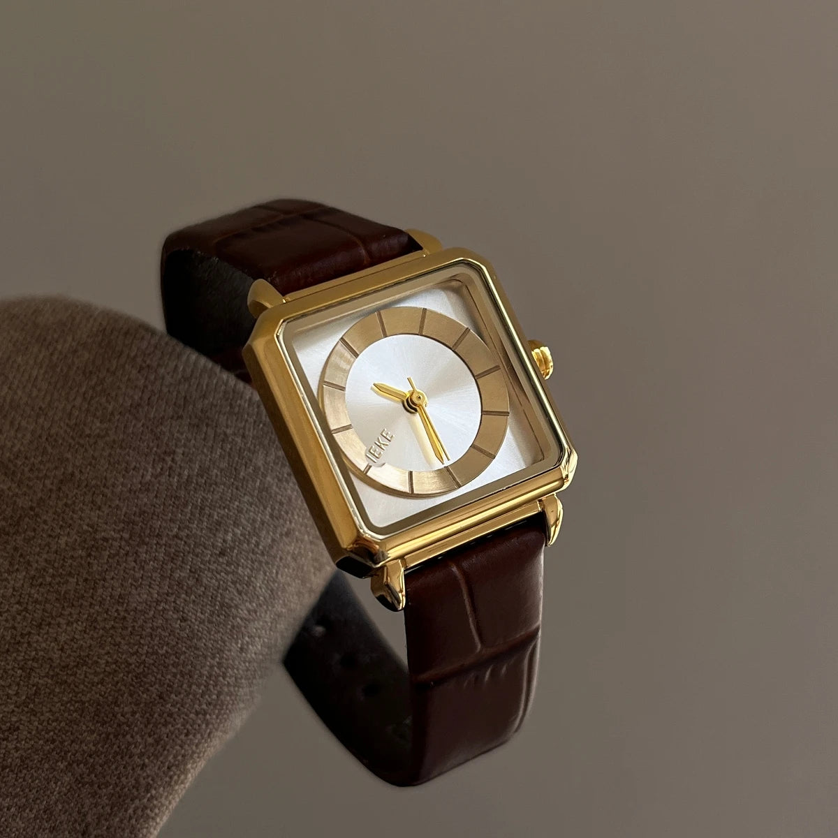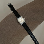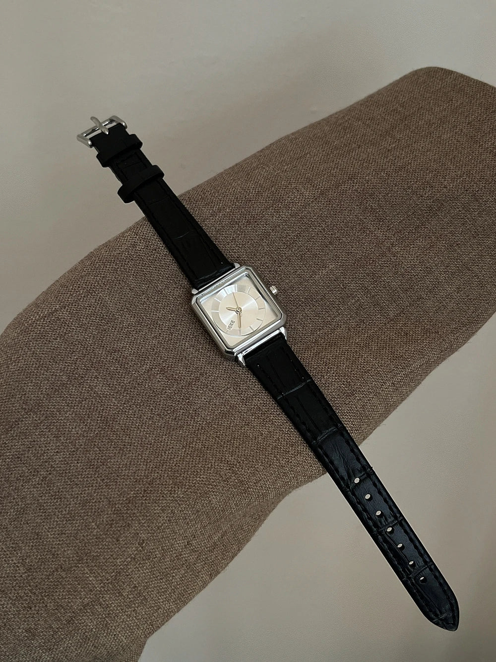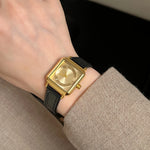 A modern nod to mid-century design, this gold-tone square watch features a clean dial framed by subtle geometric detailing. Paired with a supple leather strap, it’s the definition of understated elegance.