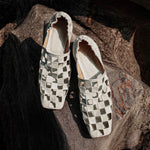 The kind of mules so unique people will be thinking you came off the runway with them. With our ultrasoft custom soles, and elastic back strap, these checkered leather mules will have head turning and your feet sleeping.