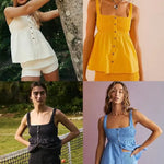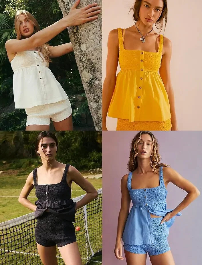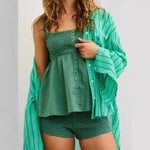 Sunshine-ready and effortlessly flattering—this smocked short set features a button-front cami with a breezy flare and stretch-fit shorts to match. Wear it for slow mornings, beach days, or golden hour strolls.