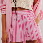 Shine freely all summer long with these lightweight & breezy shorts, featuring a playful striped knit and comfortable elastic waistband. Perfect for casual outings or beach days, these loose-fit shorts with pockets combine comfort and style for your sunny adventures.