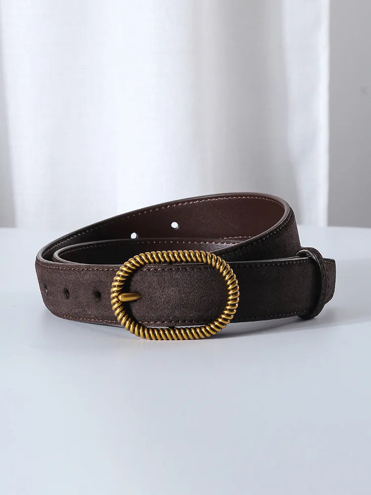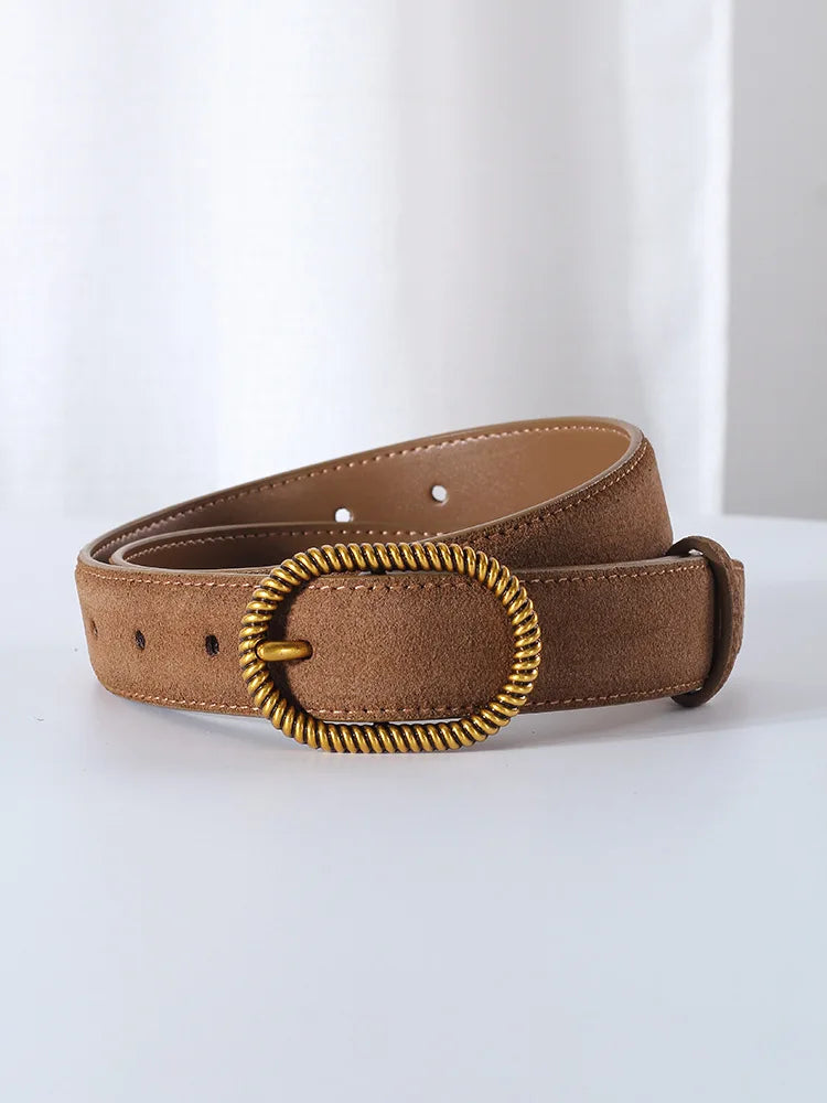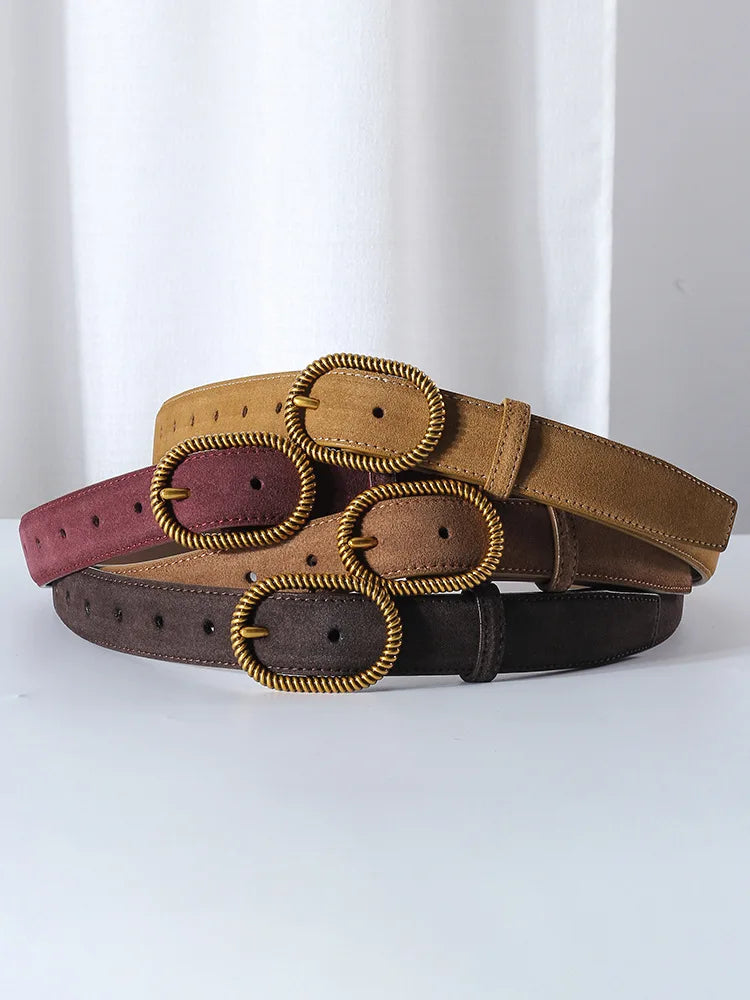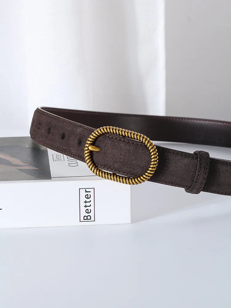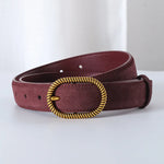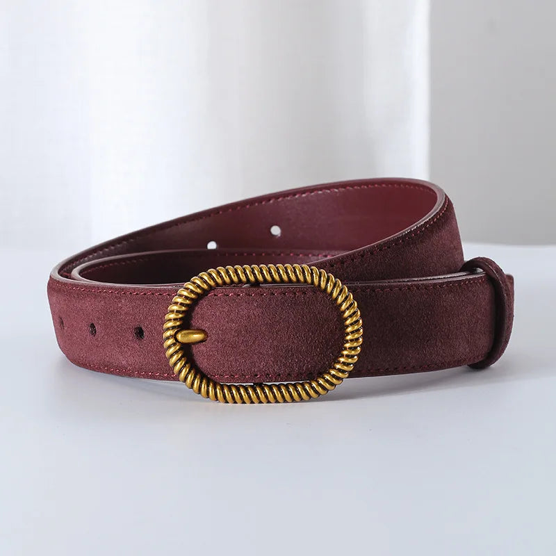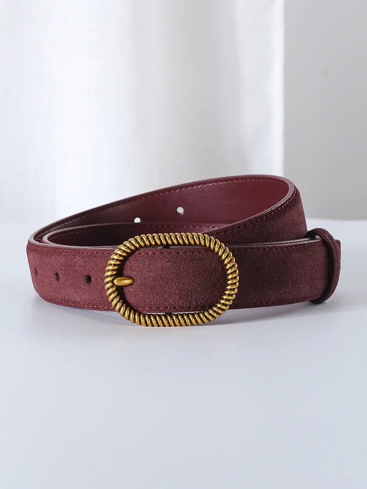 Rich suede meets vintage flair in this soft burgundy belt, finished with a twisted gold oval buckle that adds a whisper of Western charm to any look. It’s made to cinch, define, and draw just the right amount of attention.