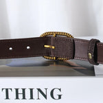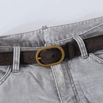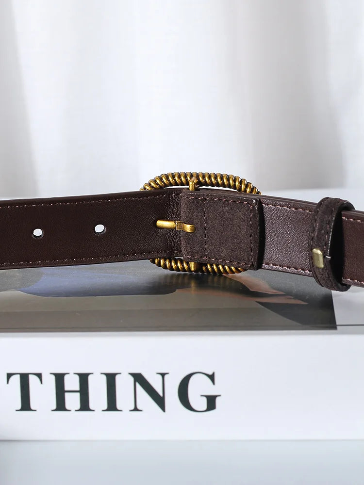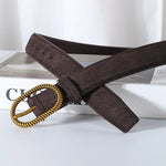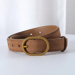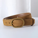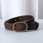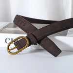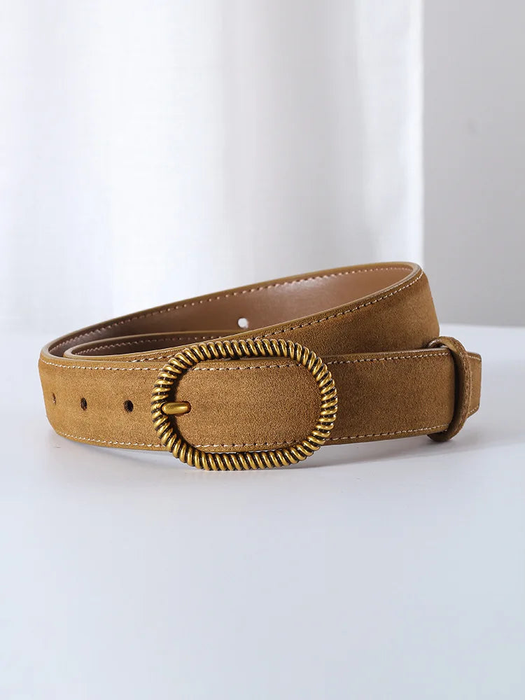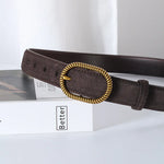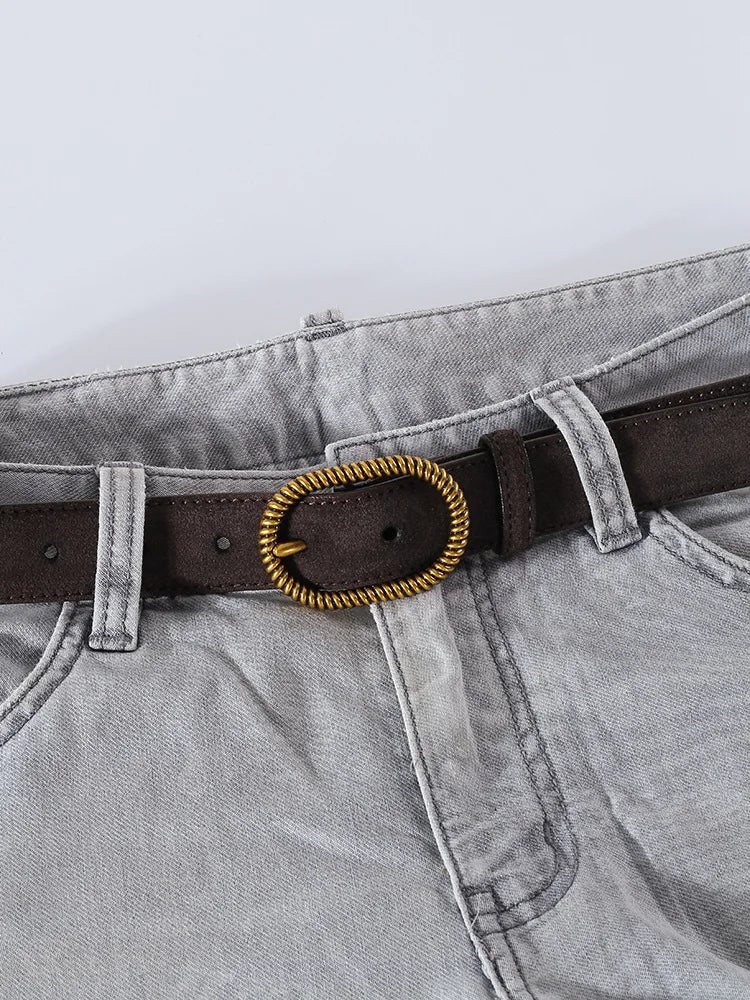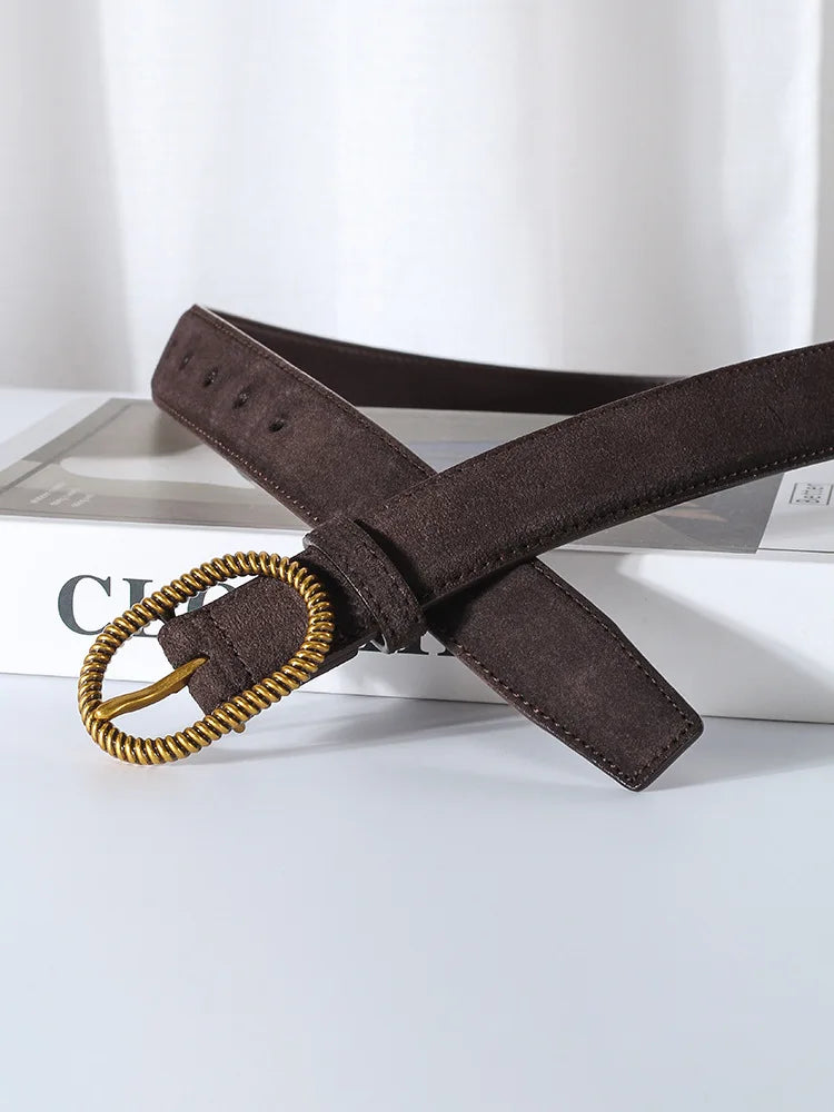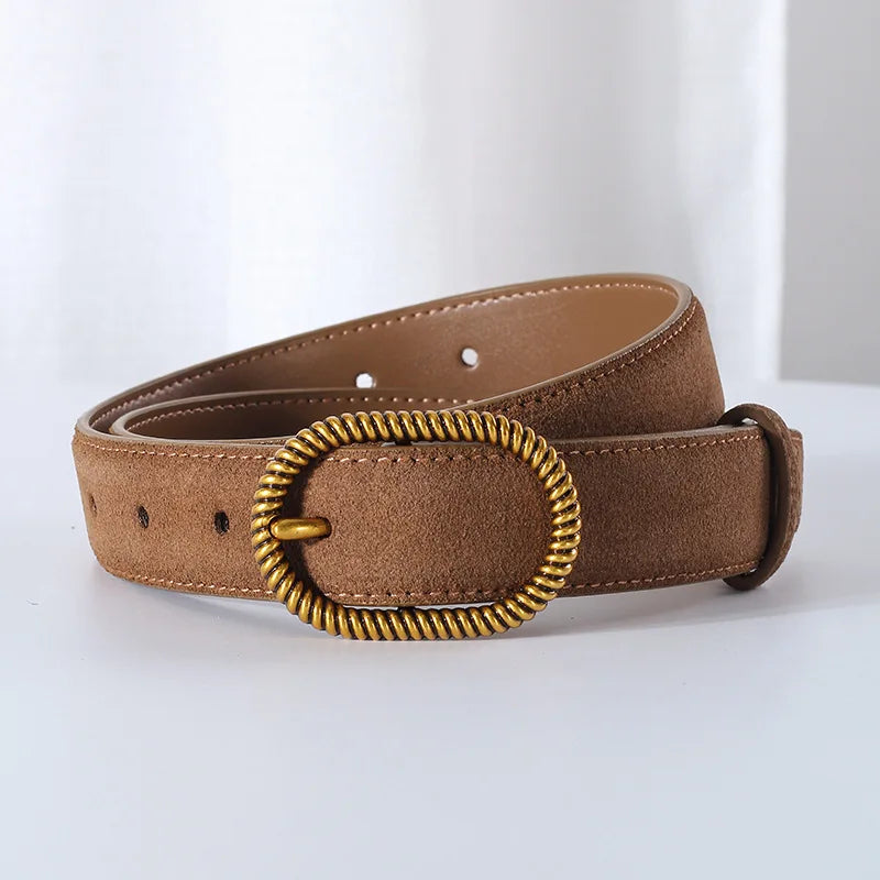Rich suede meets vintage flair in this soft burgundy belt, finished with a twisted gold oval buckle that adds a whisper of Western charm to any look. It’s made to cinch, define, and draw just the right amount of attention.