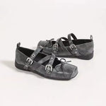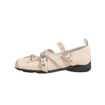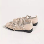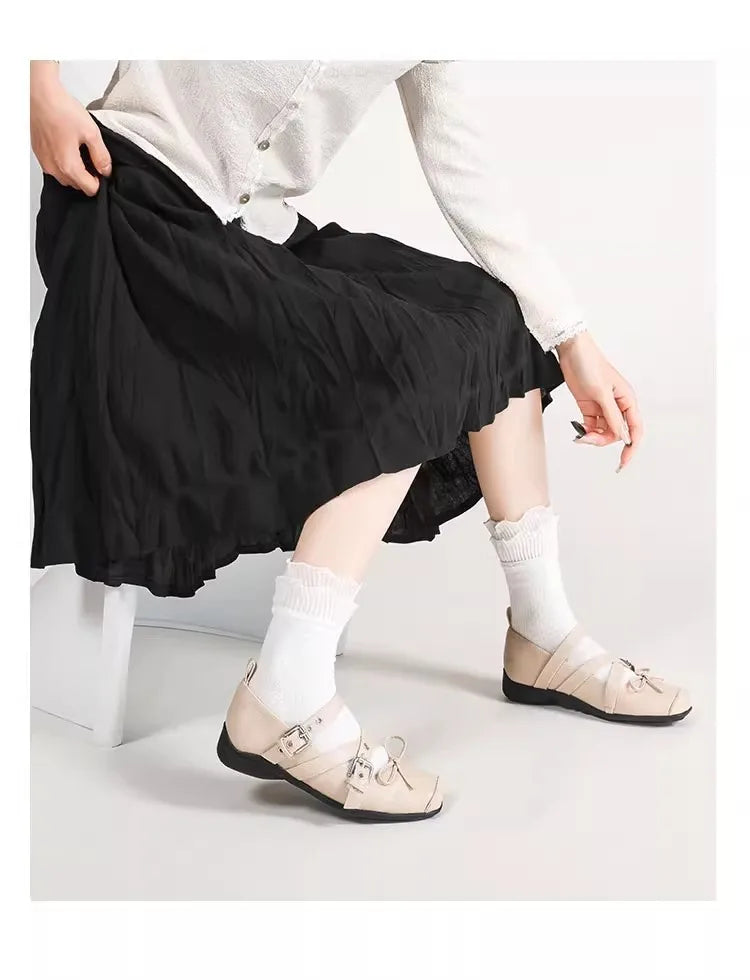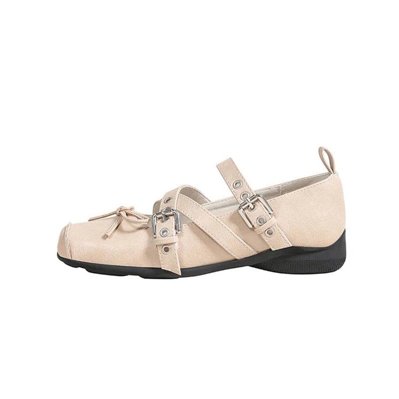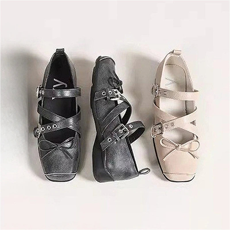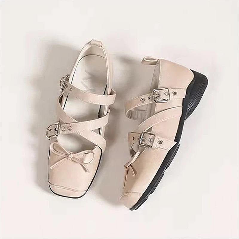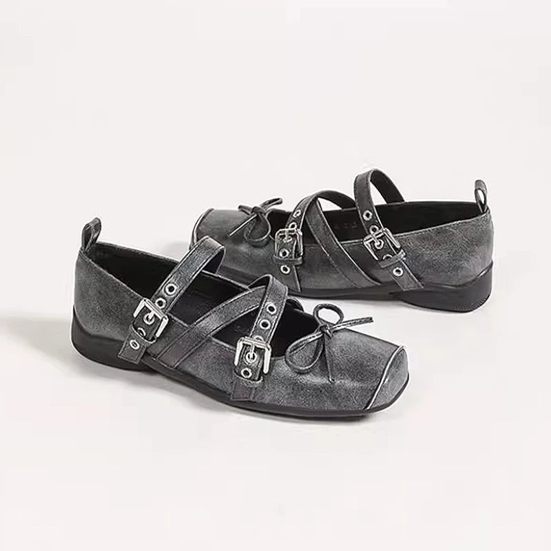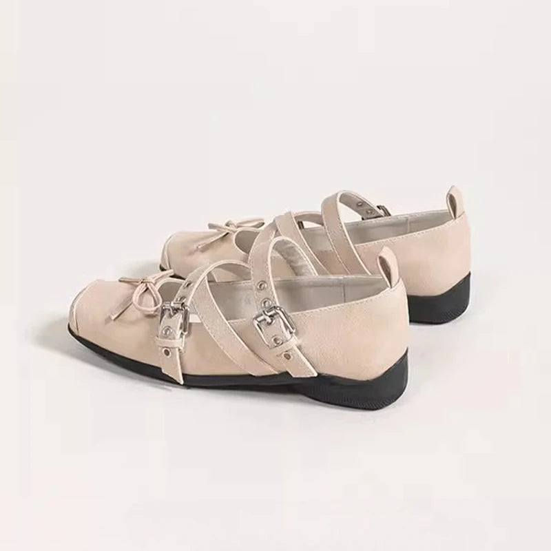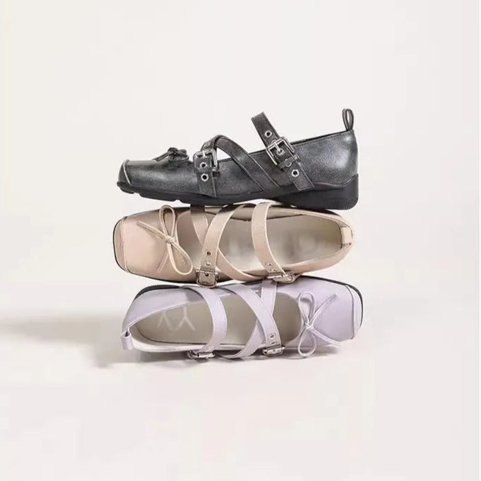 Bold and ballet-inspired, these flats mix soft bows with tough straps for an unexpected twist. Finished in a matte textured finish that feels both vintage and vanguard.