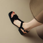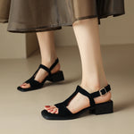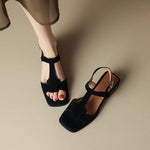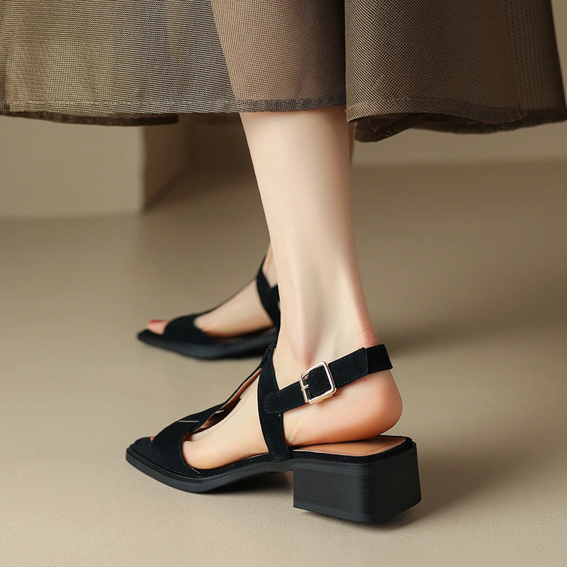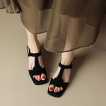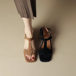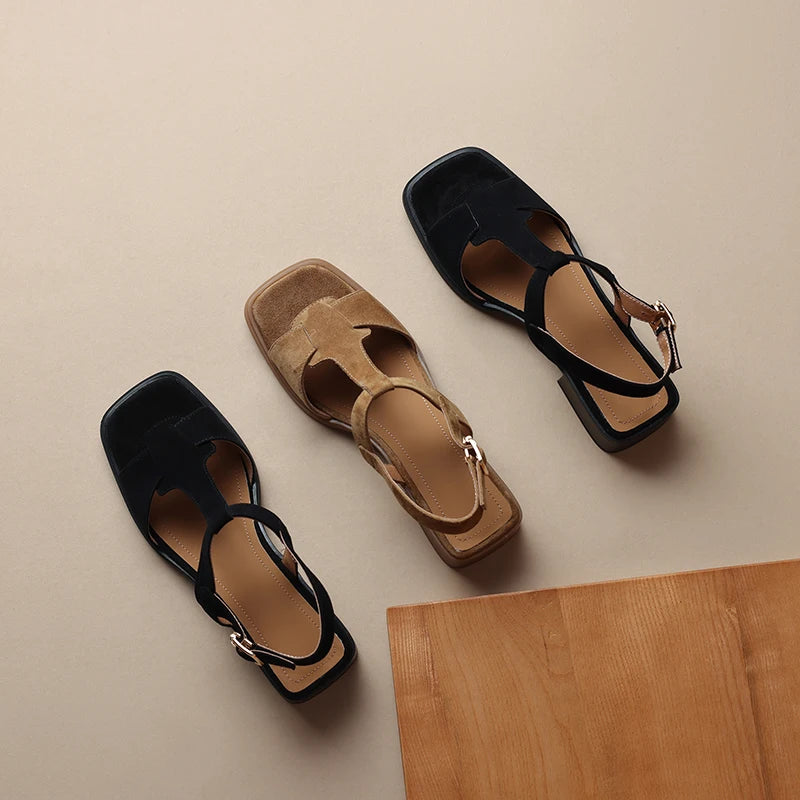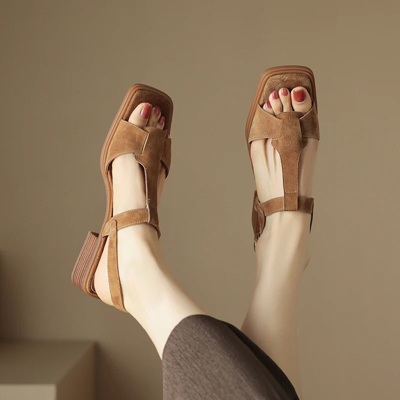 Vintage charm with modern ease—these suede sandals feature a soft T-strap silhouette, cushioned mid-heel, and a squared toe for a refined finish. Designed to move with you from café mornings to gallery nights.