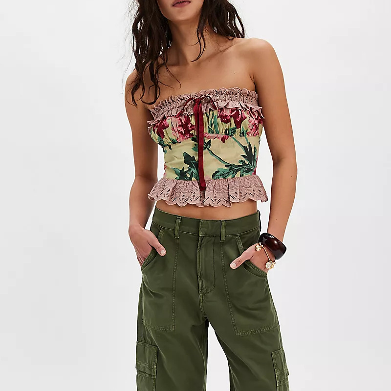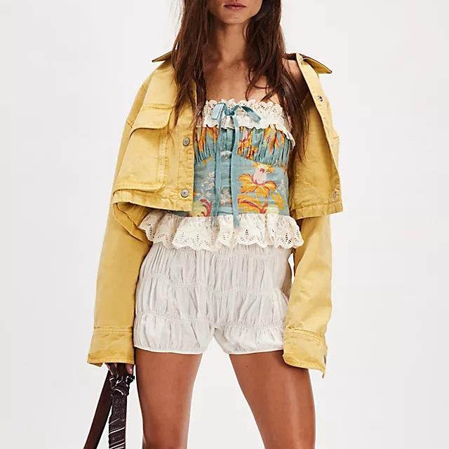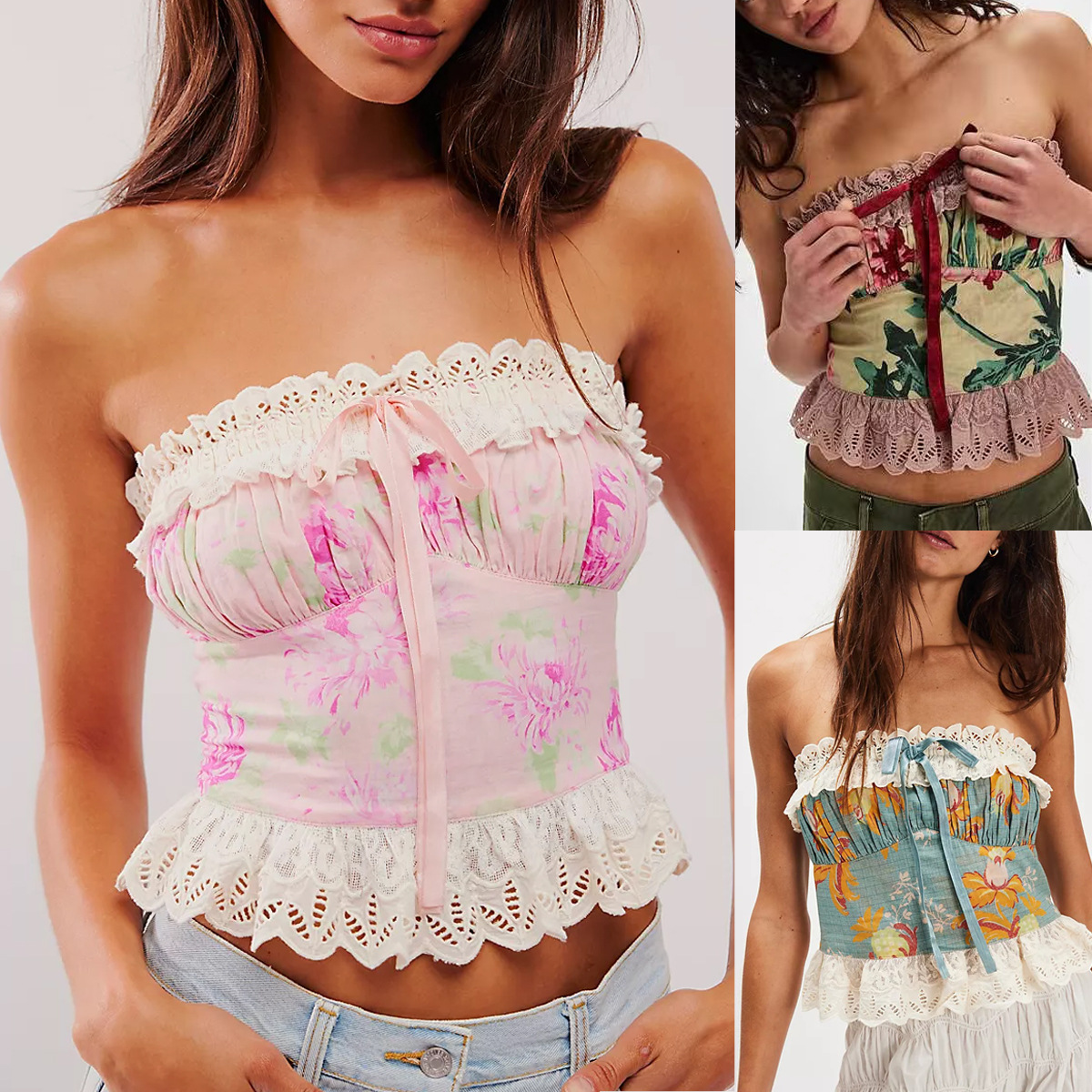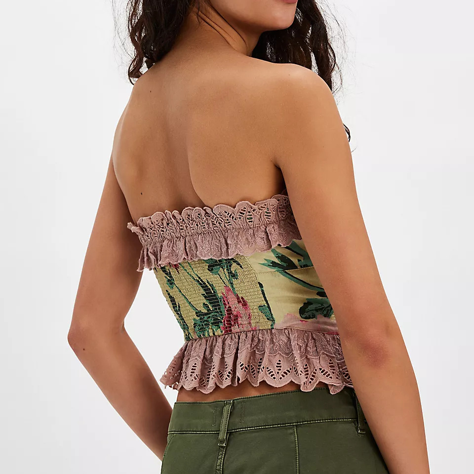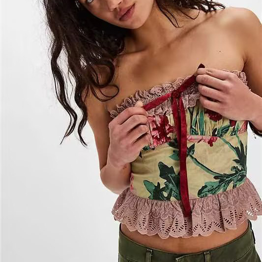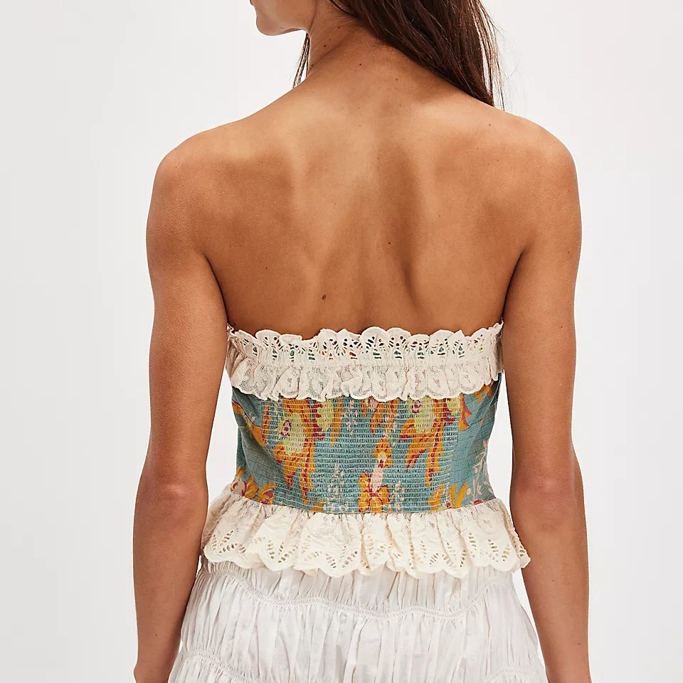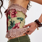 Whimsical charm meets vintage flair in this soft corset-style piece trimmed with delicate lace and summer florals. The smocked fit and ribbon tie seal it with romance and ease.