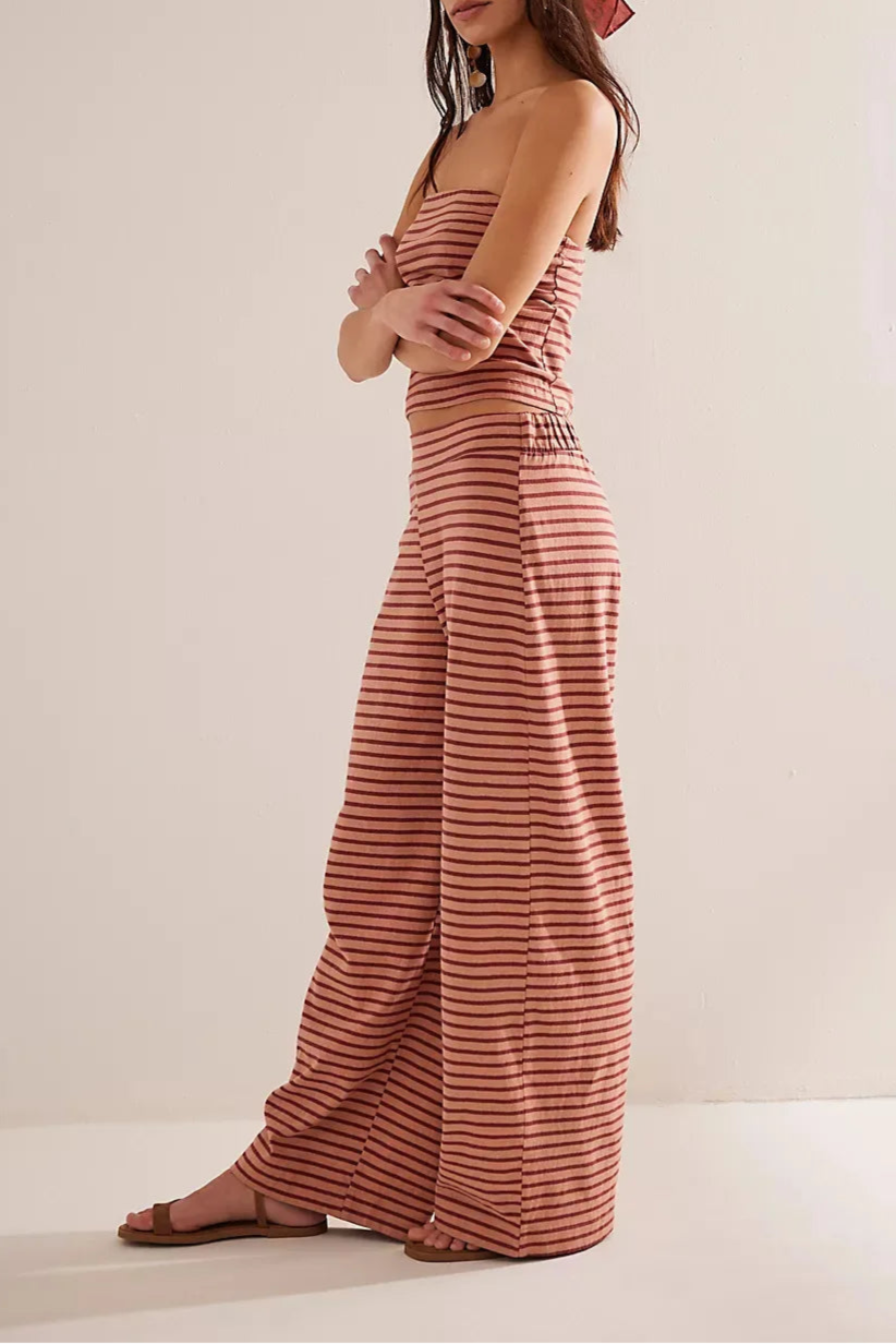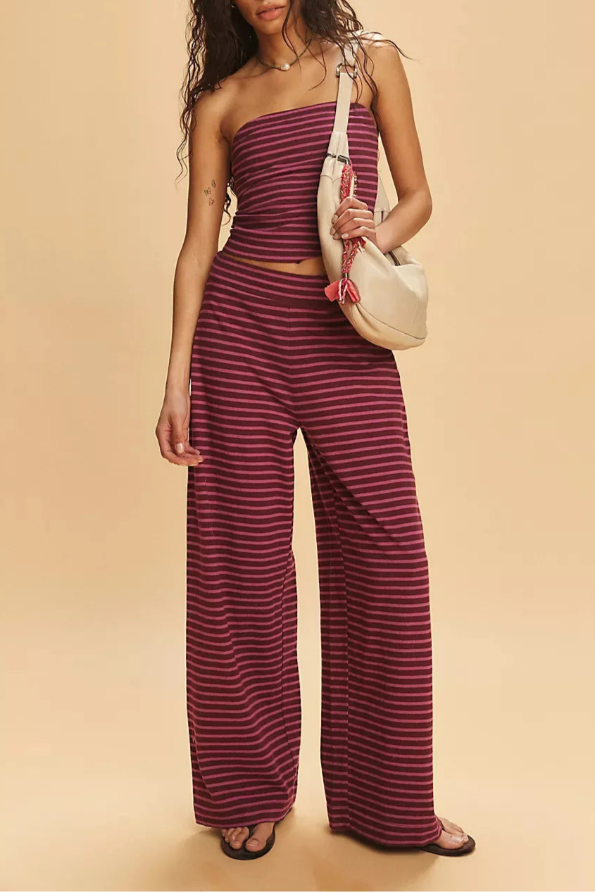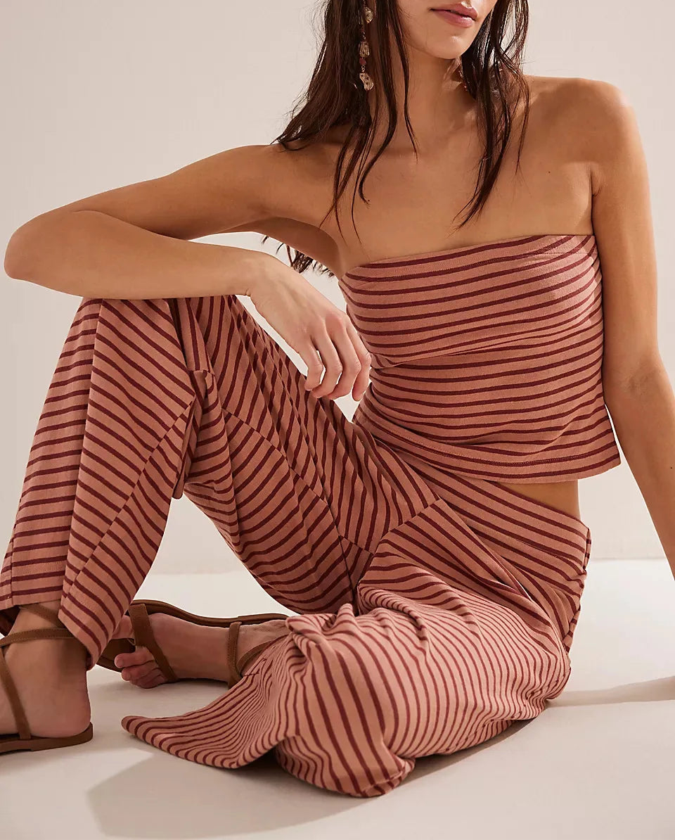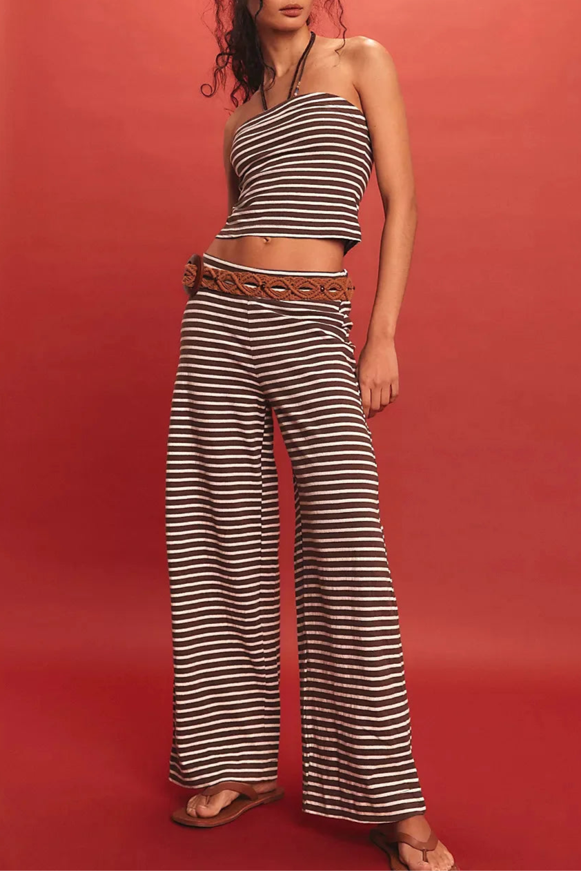 Laidback never looked this good—this striped two-piece set pairs a fitted bandeau with flowy wide-leg pants for an effortlessly put-together vibe. A day-to-night essential with just the right edge.