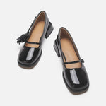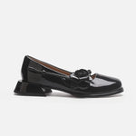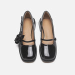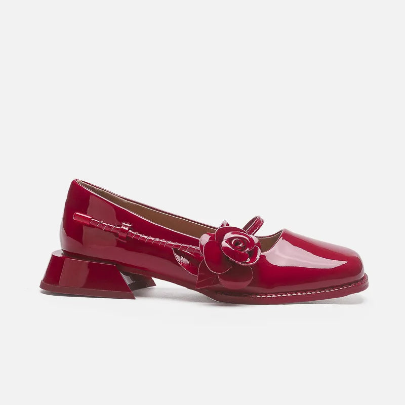 Bold and romantic, these glossy Mary Janes bloom with a sculpted rose accent and a futuristic flared heel. Designed for comfort with a flair for the dramatic.