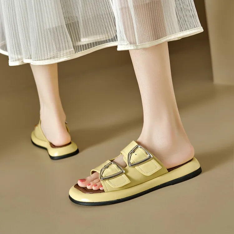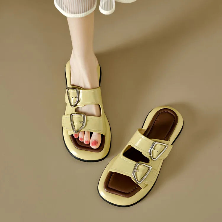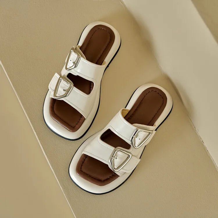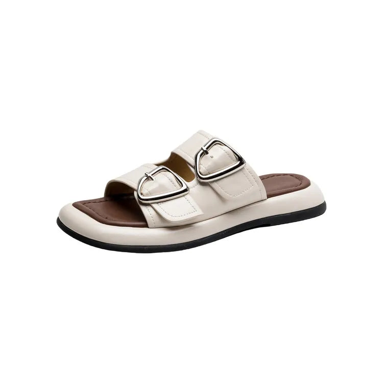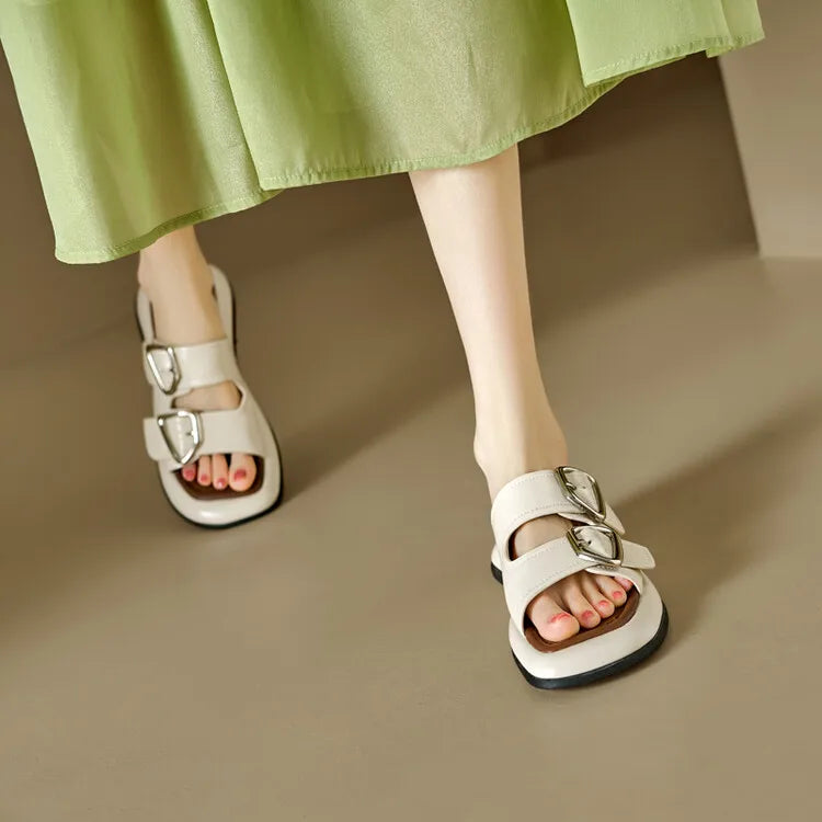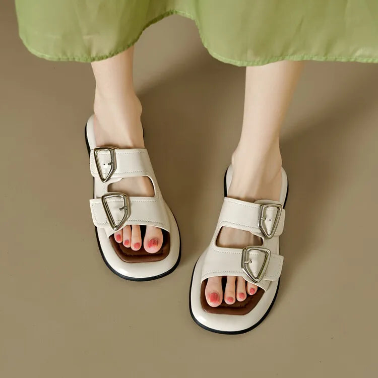 With a structured square toe and sleek metal buckles, these slip-on sandals bring sharp form to easy function. A cushioned sole and low-profile design make them a staple for effortless everyday wear.