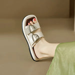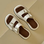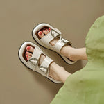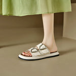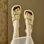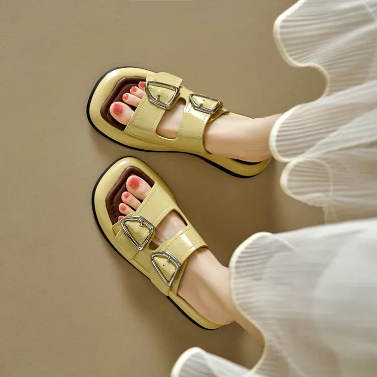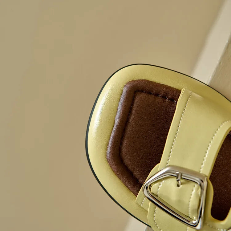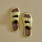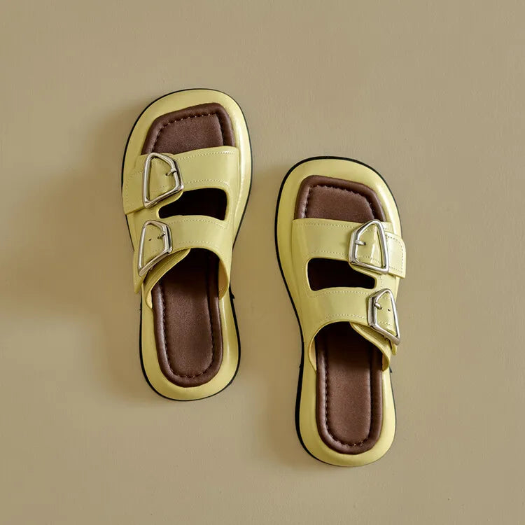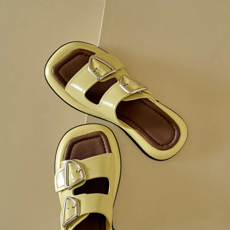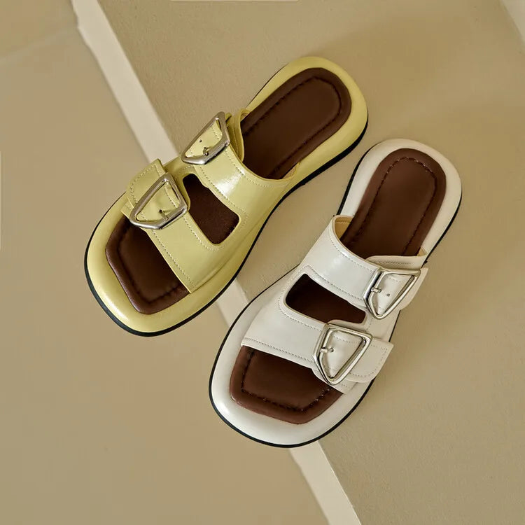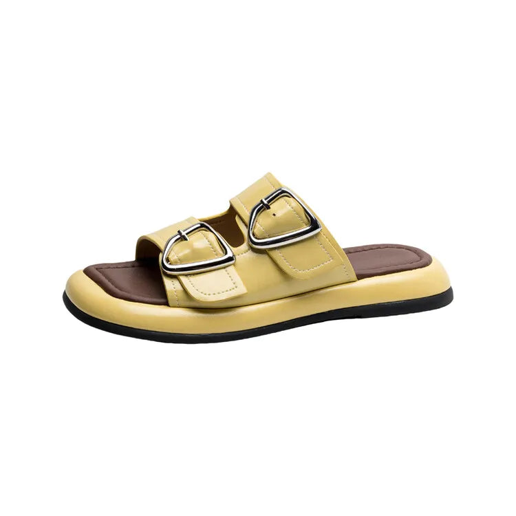 With a structured square toe and sleek metal buckles, these slip-on sandals bring sharp form to easy function. A cushioned sole and low-profile design make them a staple for effortless everyday wear.