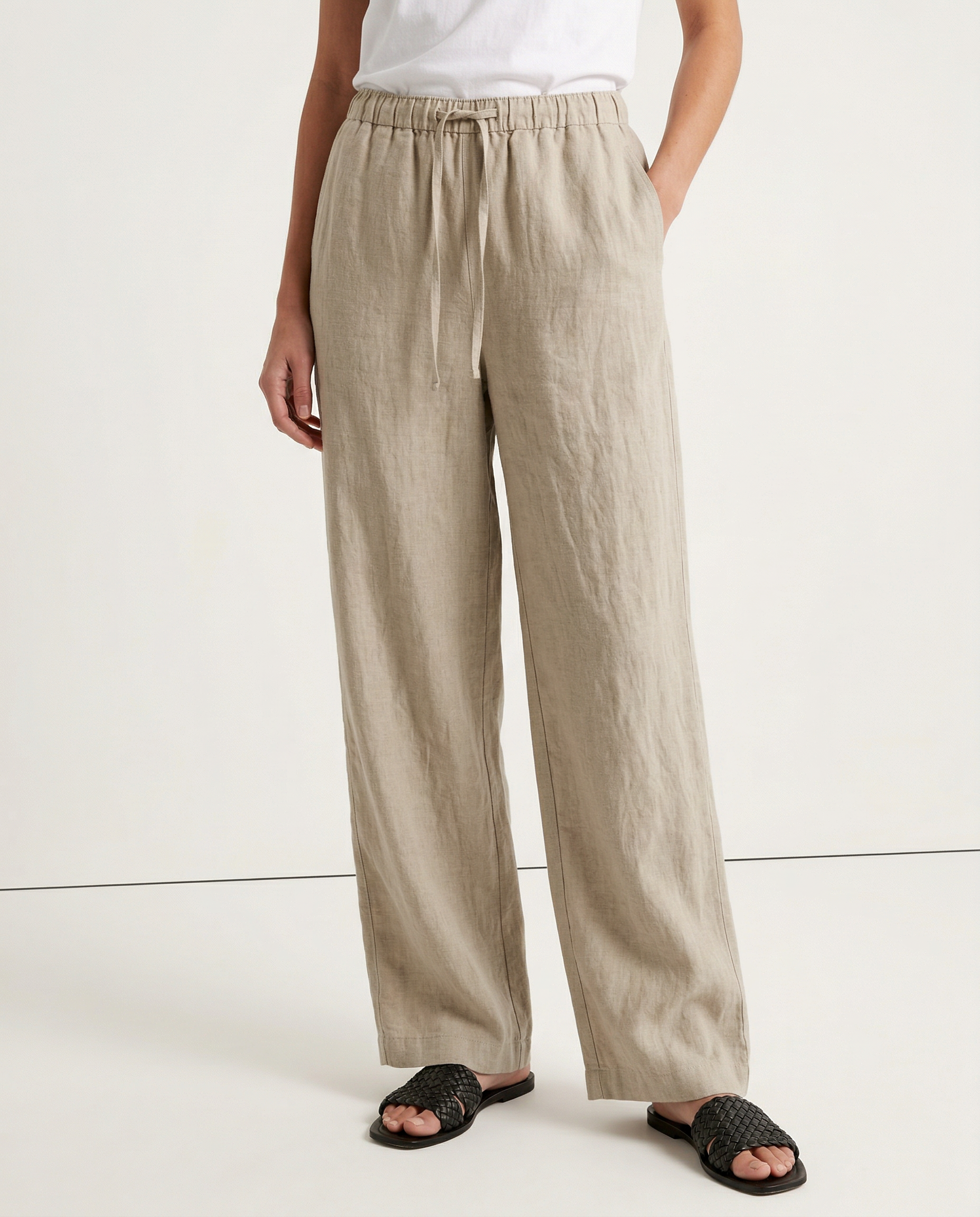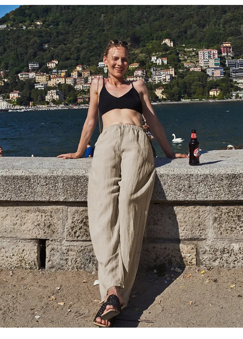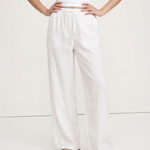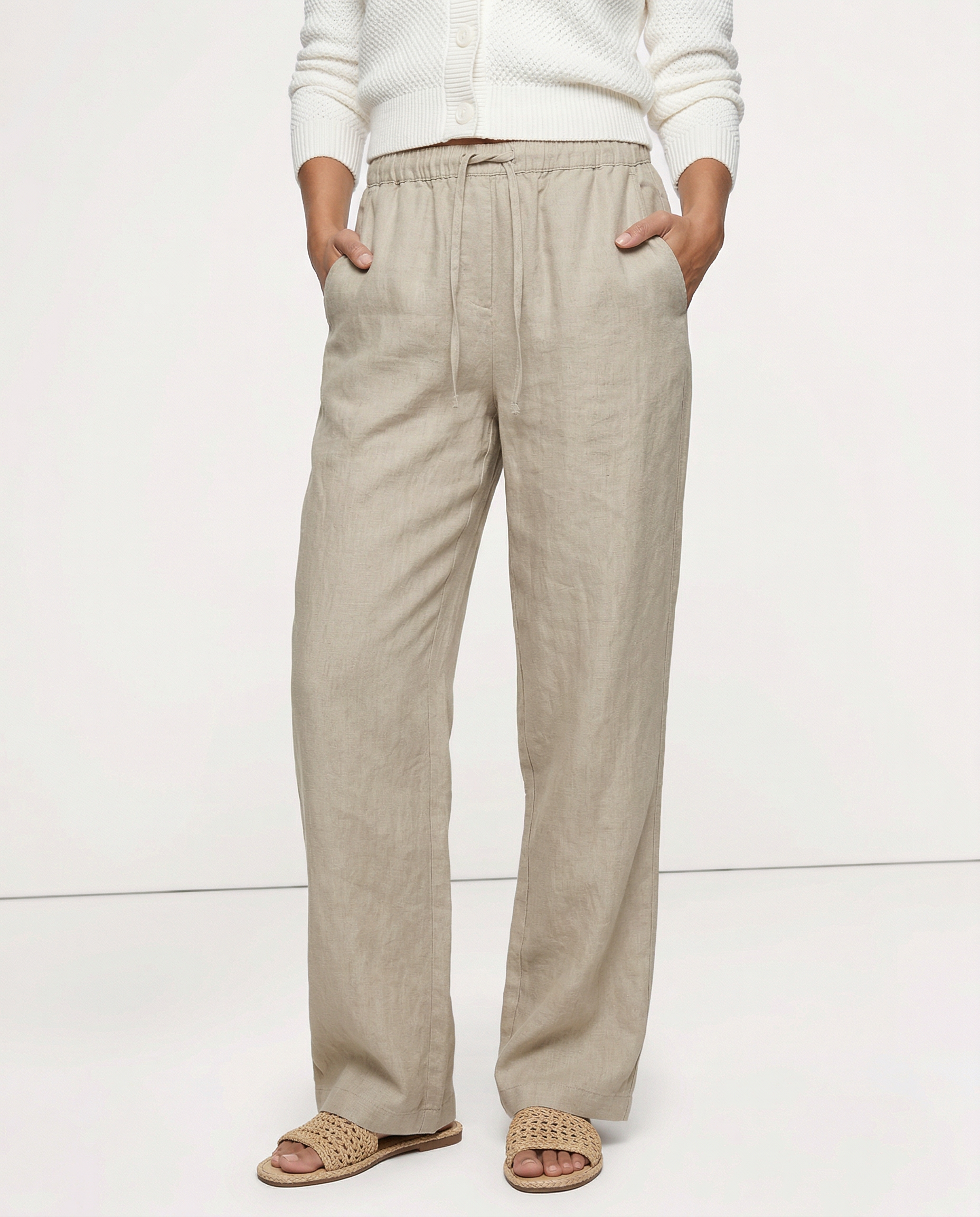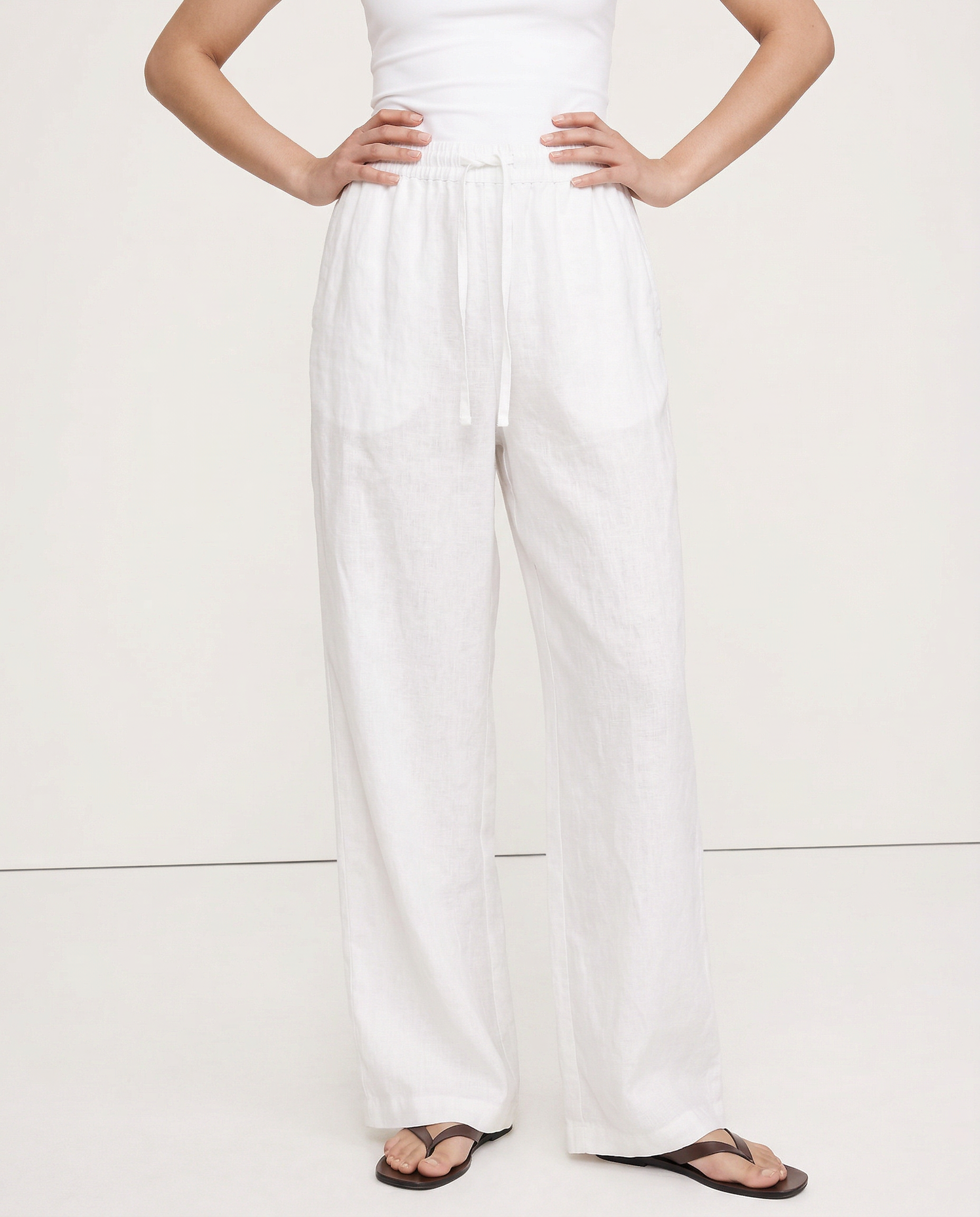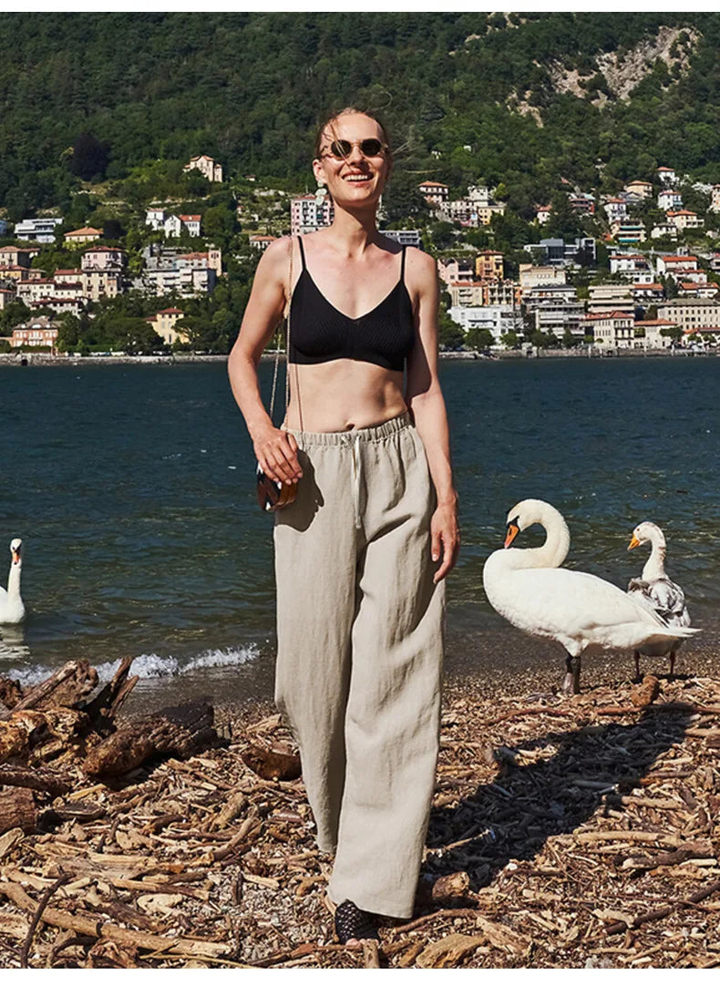 Made for wherever the water is. Lightweight linen with a barely-there drape that moves with every step and a low-rise elastic waistband that keeps everything comfortable without trying. Wide leg, full length, a drawstring that stays put — the pant that goes over a swimsuit, under a knit cover-up, or straight into dinner without changing.