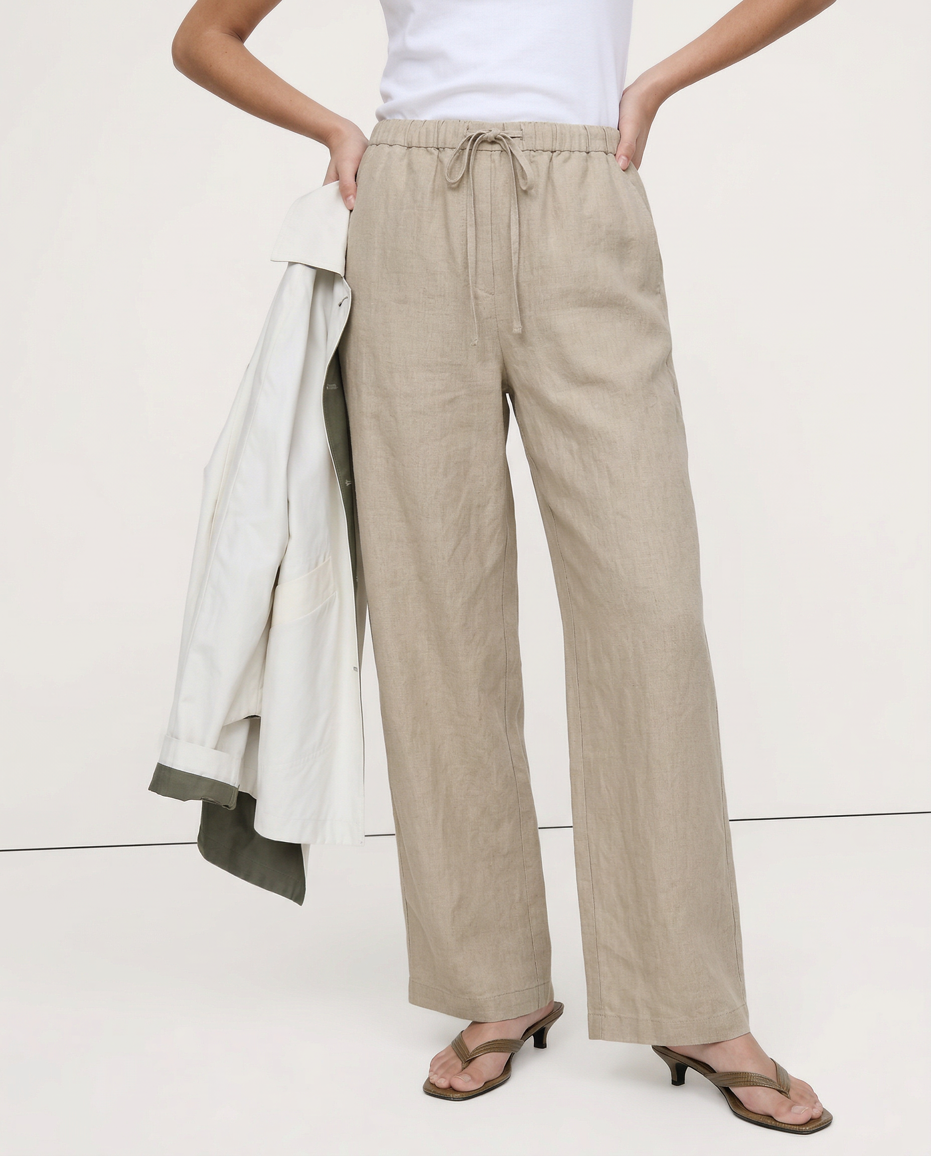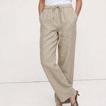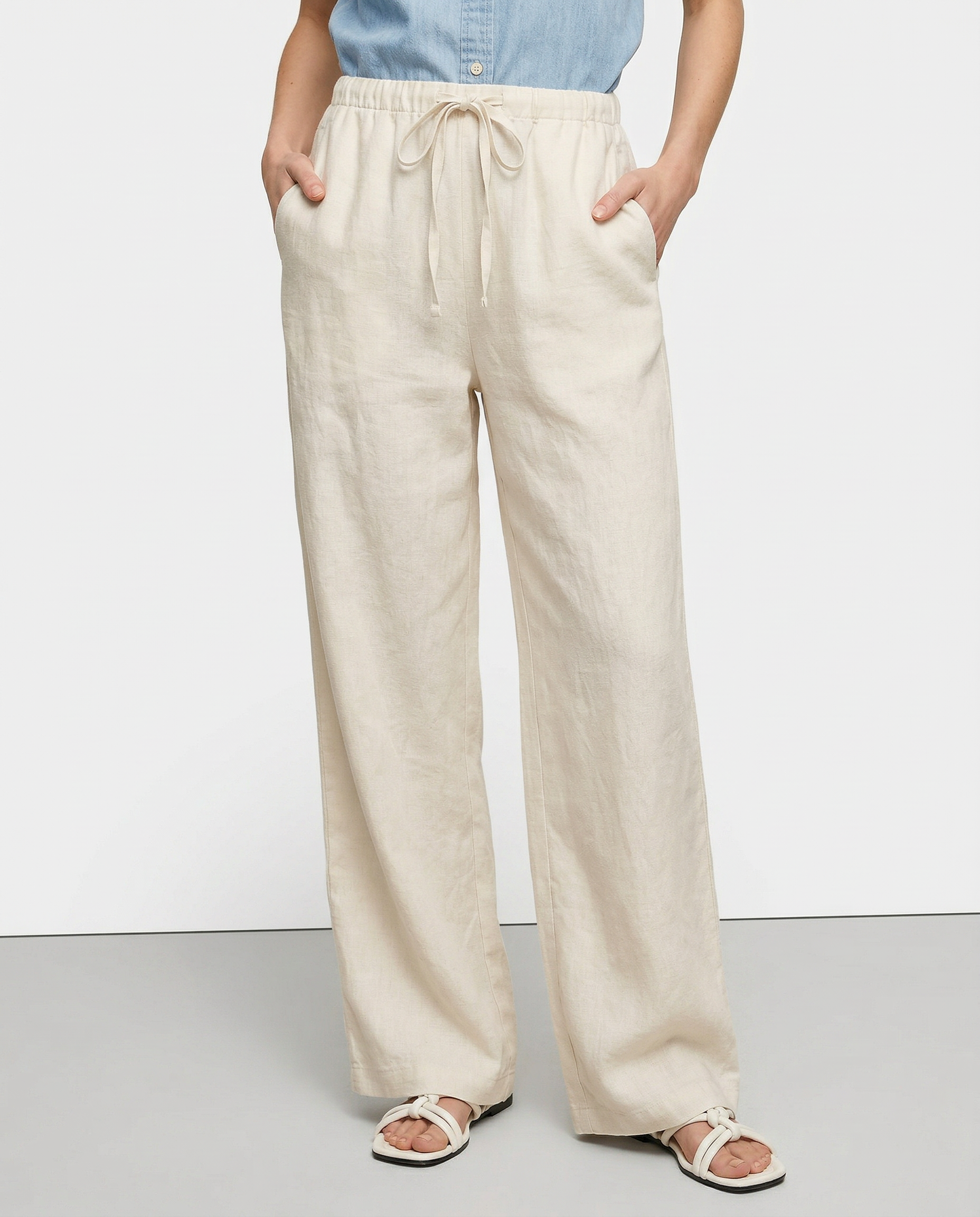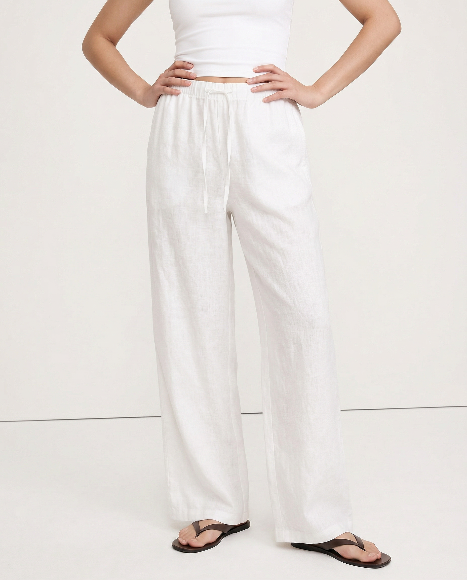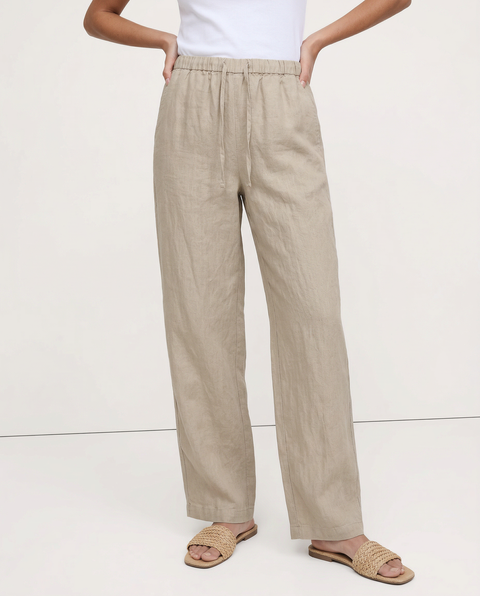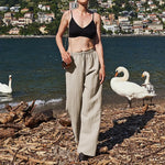 Made for wherever the water is. Lightweight linen with a barely-there drape that moves with every step and a low-rise elastic waistband that keeps everything comfortable without trying. Wide leg, full length, a drawstring that stays put — the pant that goes over a swimsuit, under a knit cover-up, or straight into dinner without changing.
