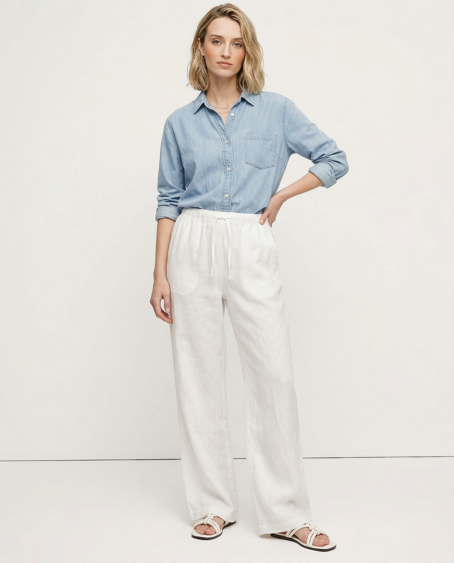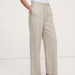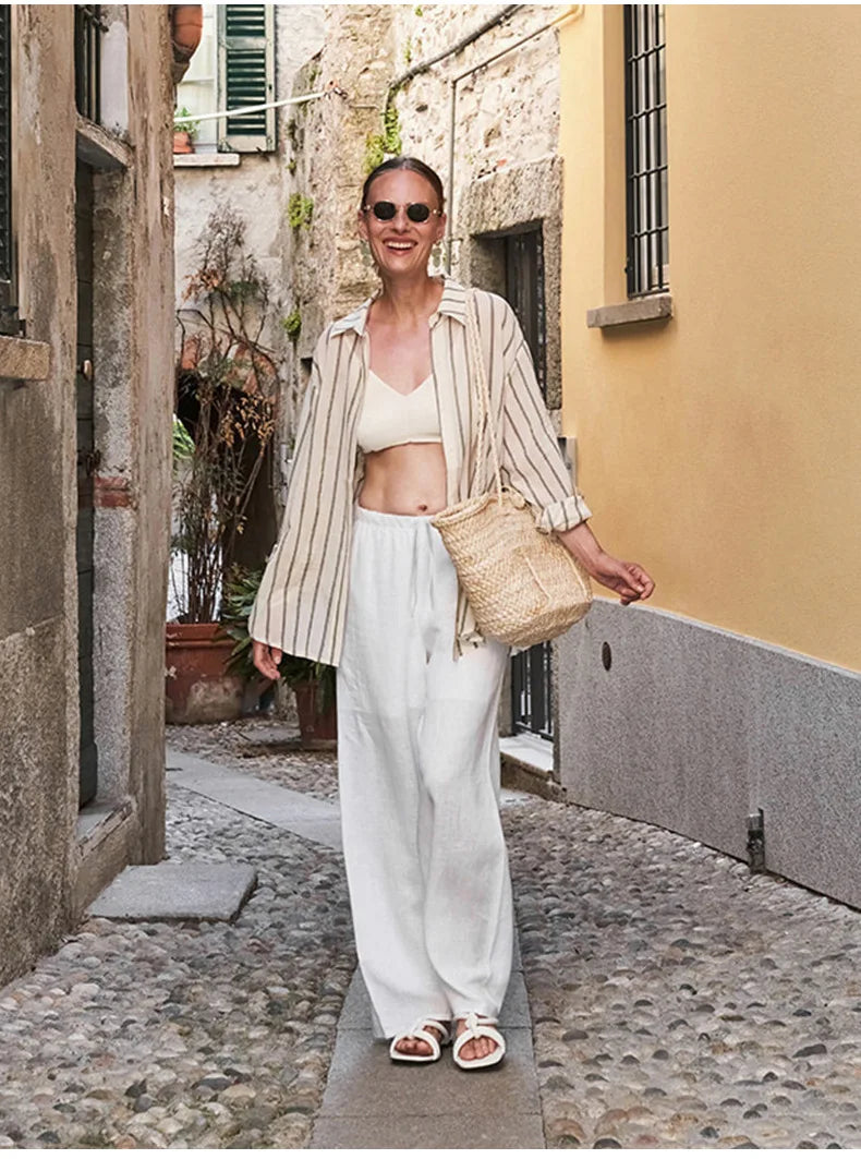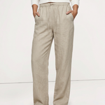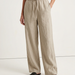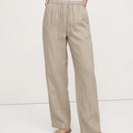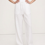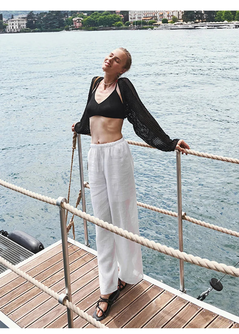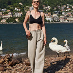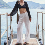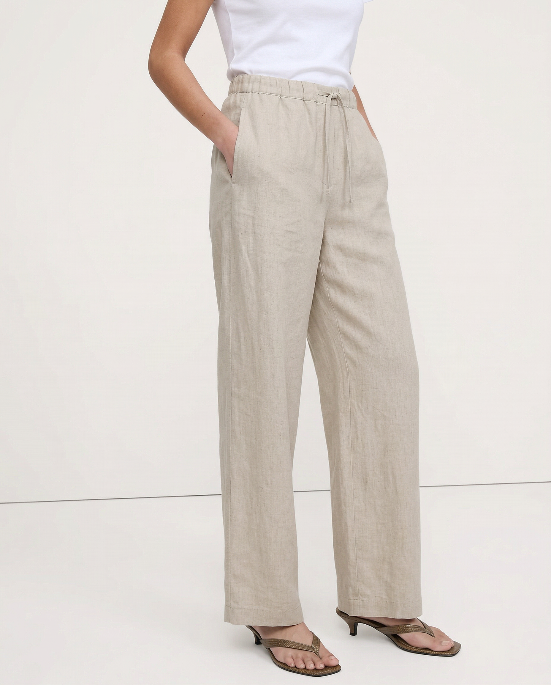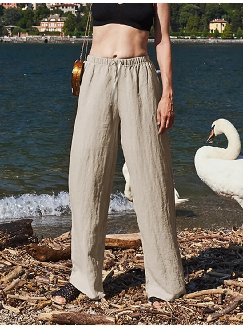 Made for wherever the water is. Lightweight linen with a barely-there drape that moves with every step and a low-rise elastic waistband that keeps everything comfortable without trying. Wide leg, full length, a drawstring that stays put — the pant that goes over a swimsuit, under a knit cover-up, or straight into dinner without changing.