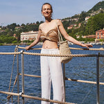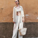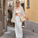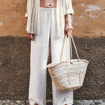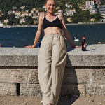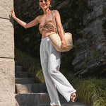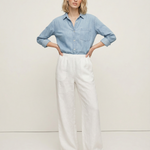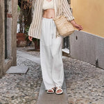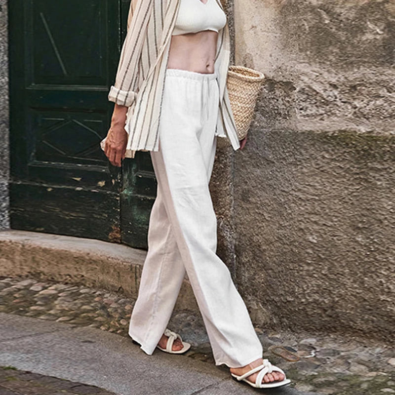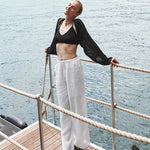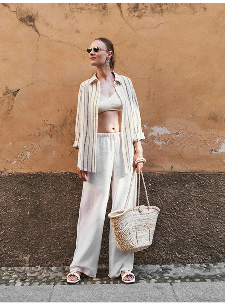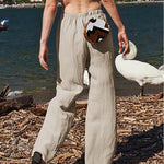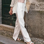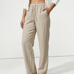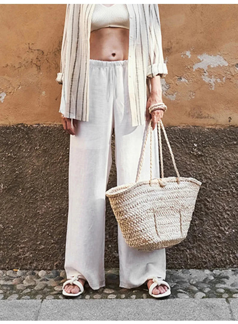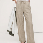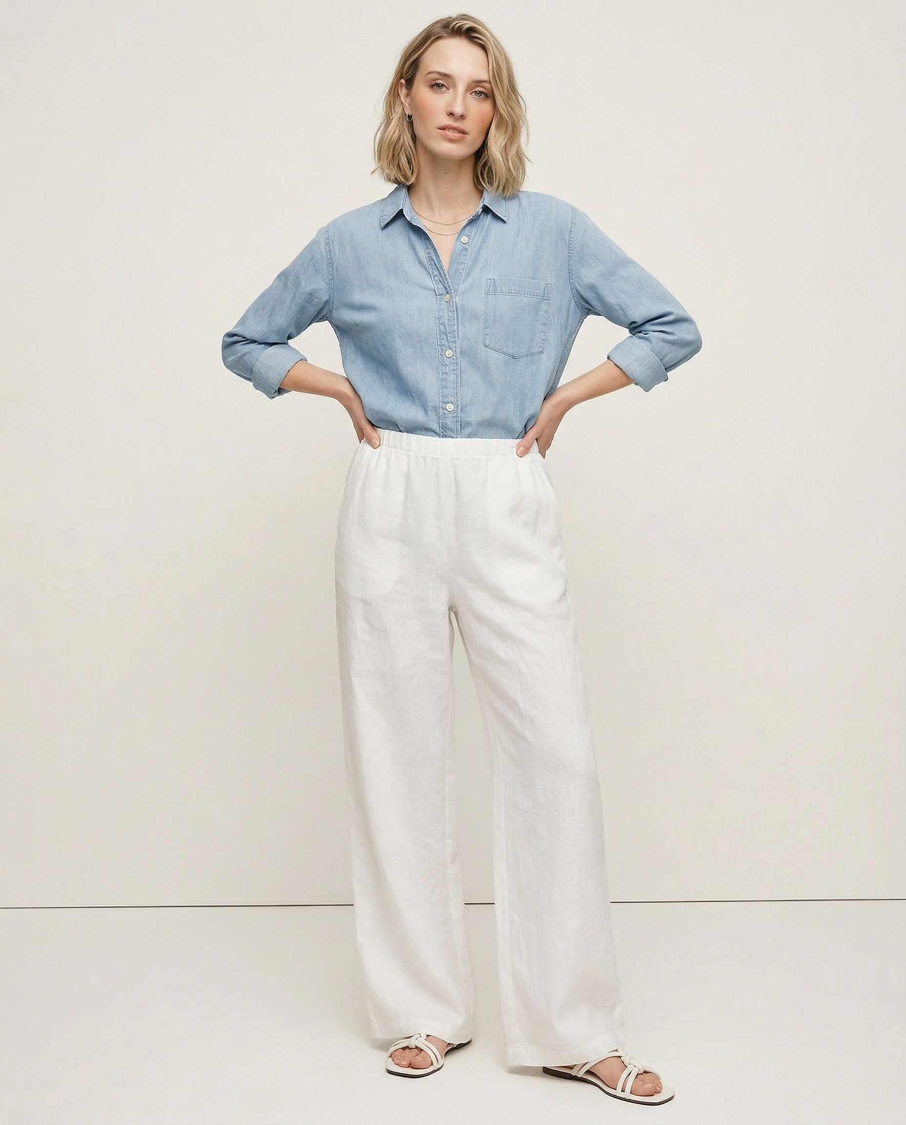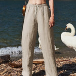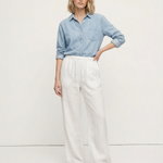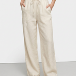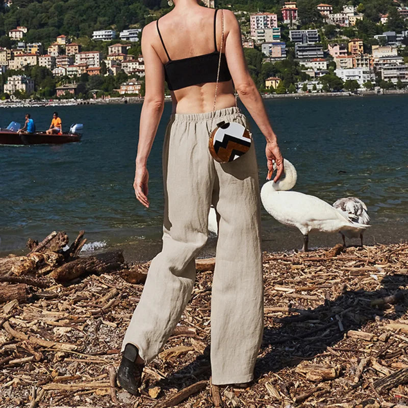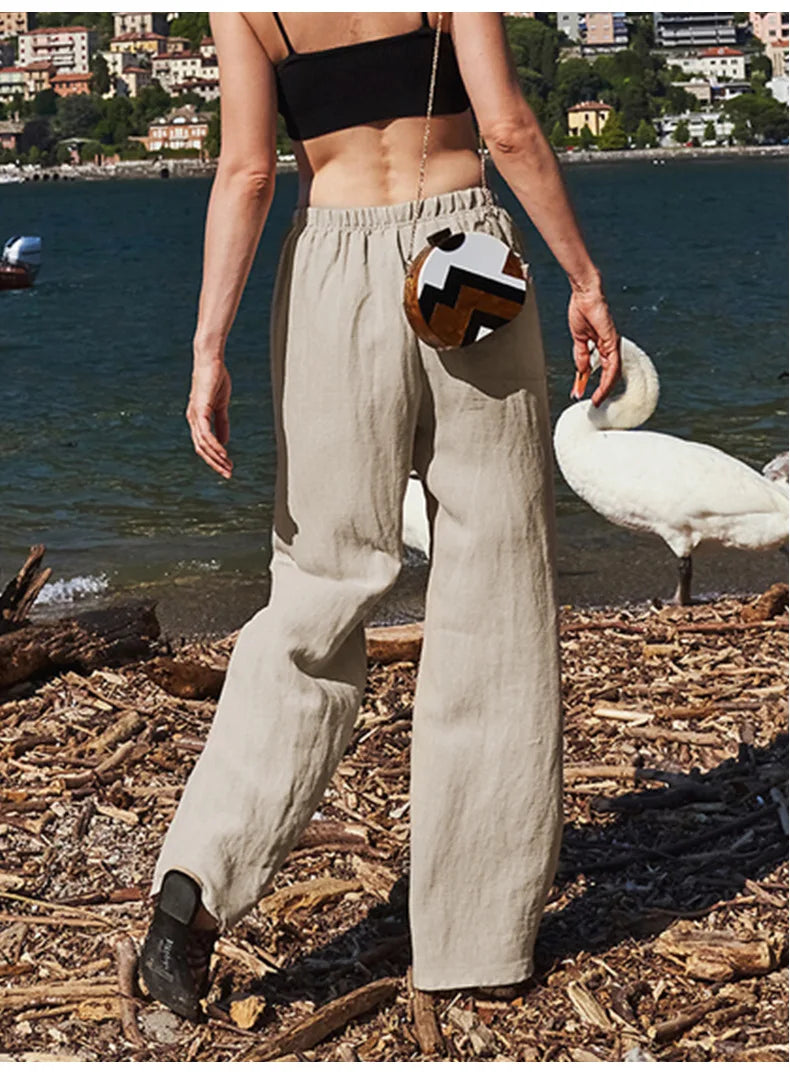 Made for wherever the water is. Lightweight linen with a barely-there drape that moves with every step and a low-rise elastic waistband that keeps everything comfortable without trying. Wide leg, full length, a drawstring that stays put — the pant that goes over a swimsuit, under a knit cover-up, or straight into dinner without changing.