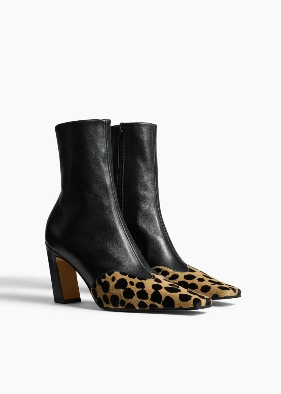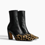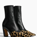 The boot that makes a simple outfit unforgettable. Smooth leather shaft, solid block heel, and then — a pony hair leopard print toe cap that changes everything. It's the detail that looks considered from across a room and even better up close. Wear it with straight-leg denim, a midi skirt, wide-leg trousers. The toe does the rest.