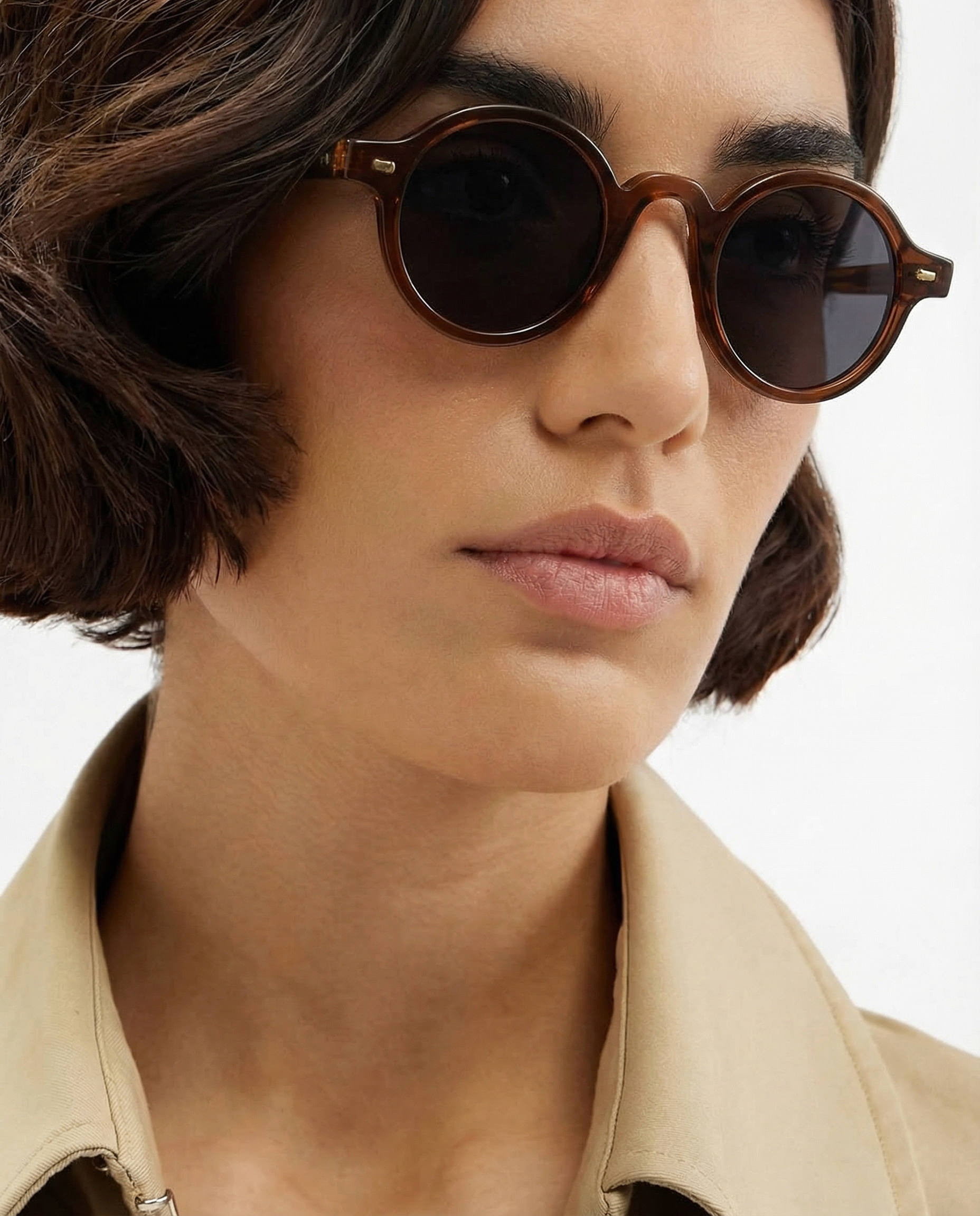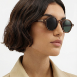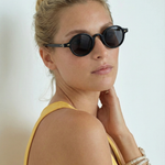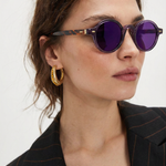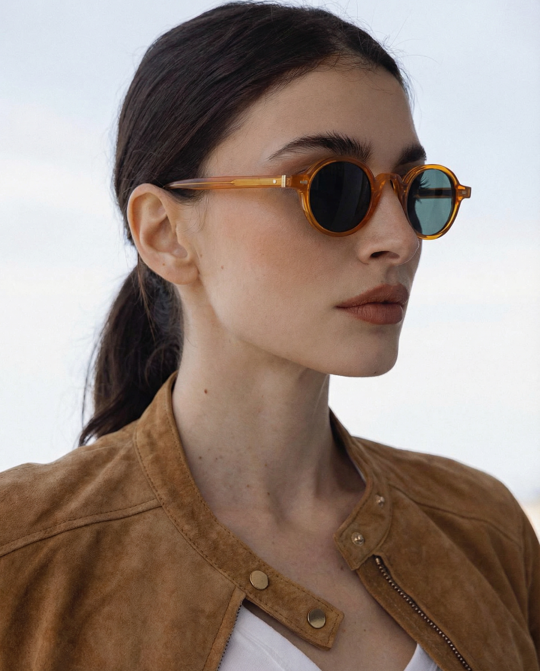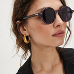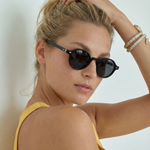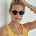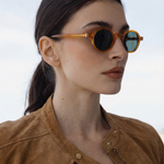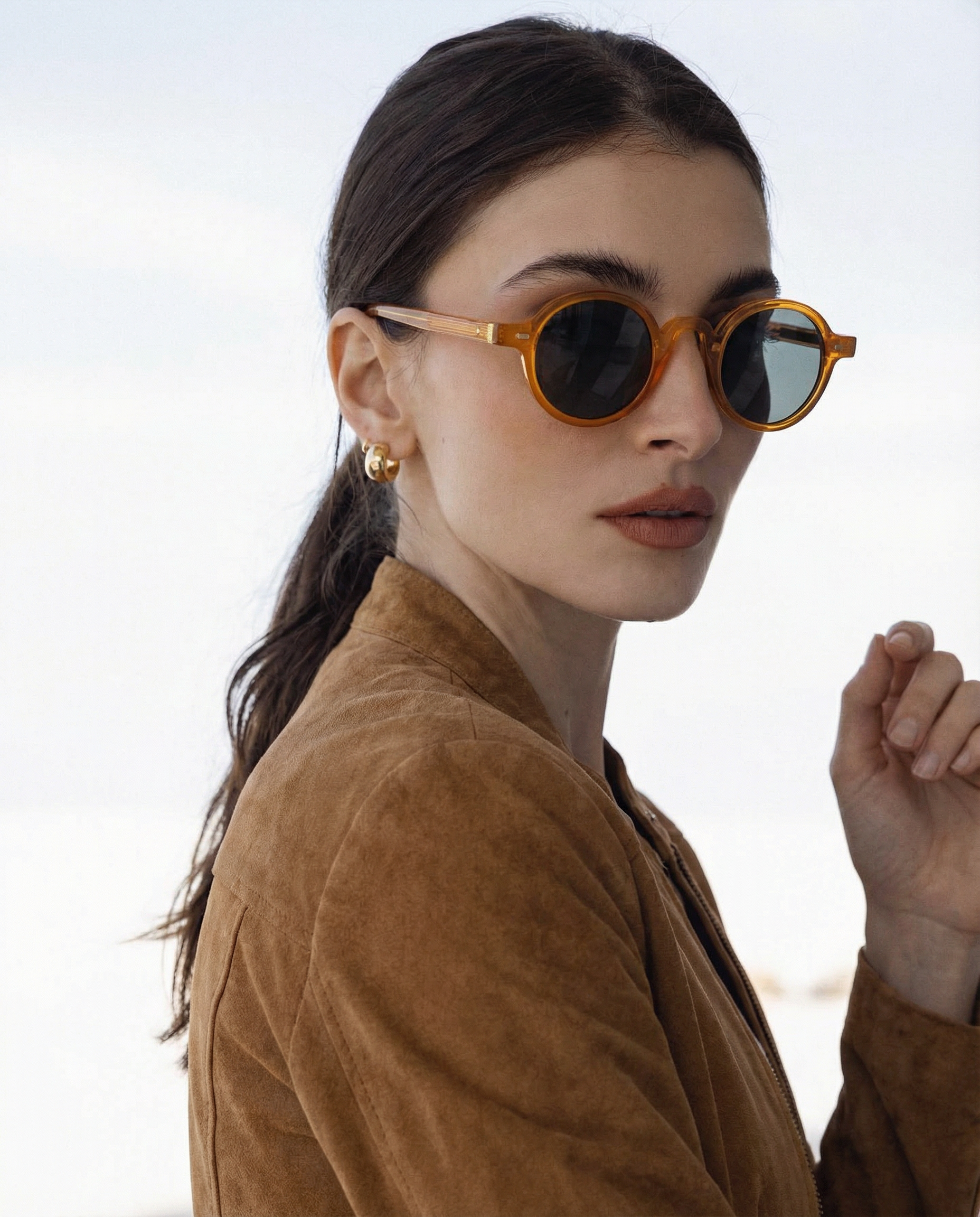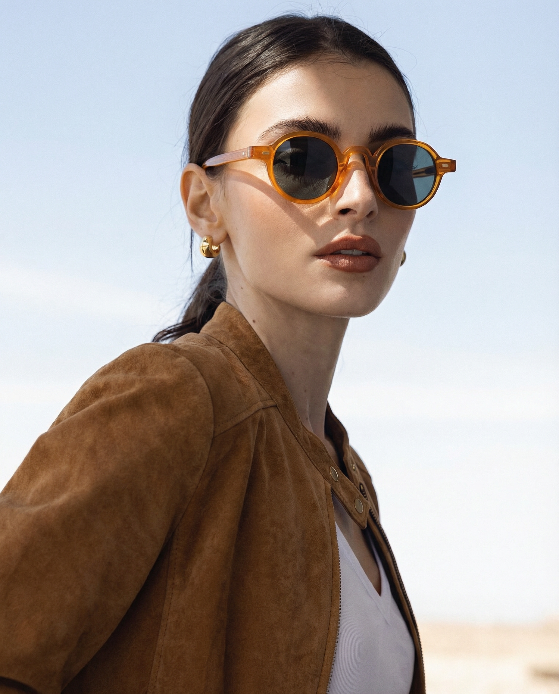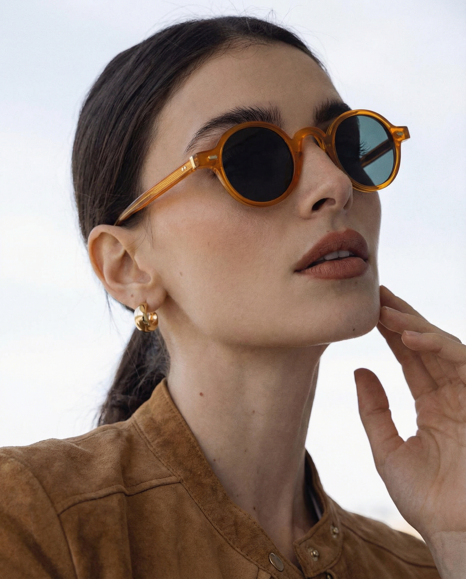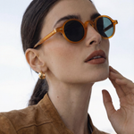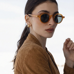 Sunlight looks better through amber. Our rounded translucent frame glows against the skin while deep contrast lenses keep the mood grounded — bold, playful, and the kind of piece that turns a simple outfit into something intentional.