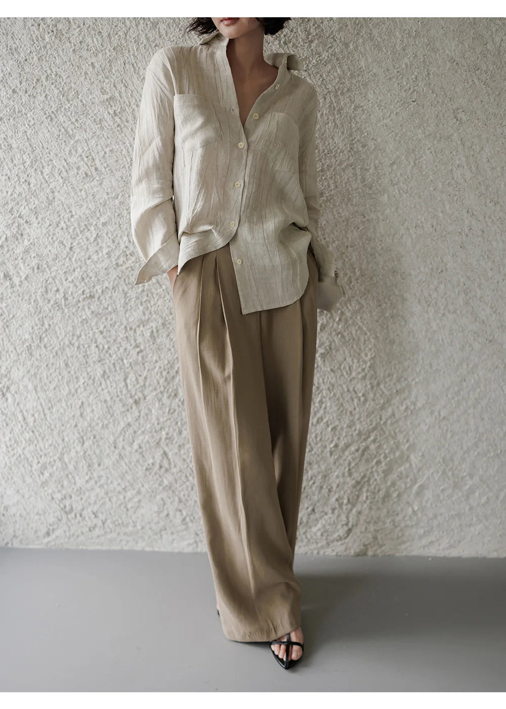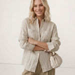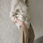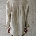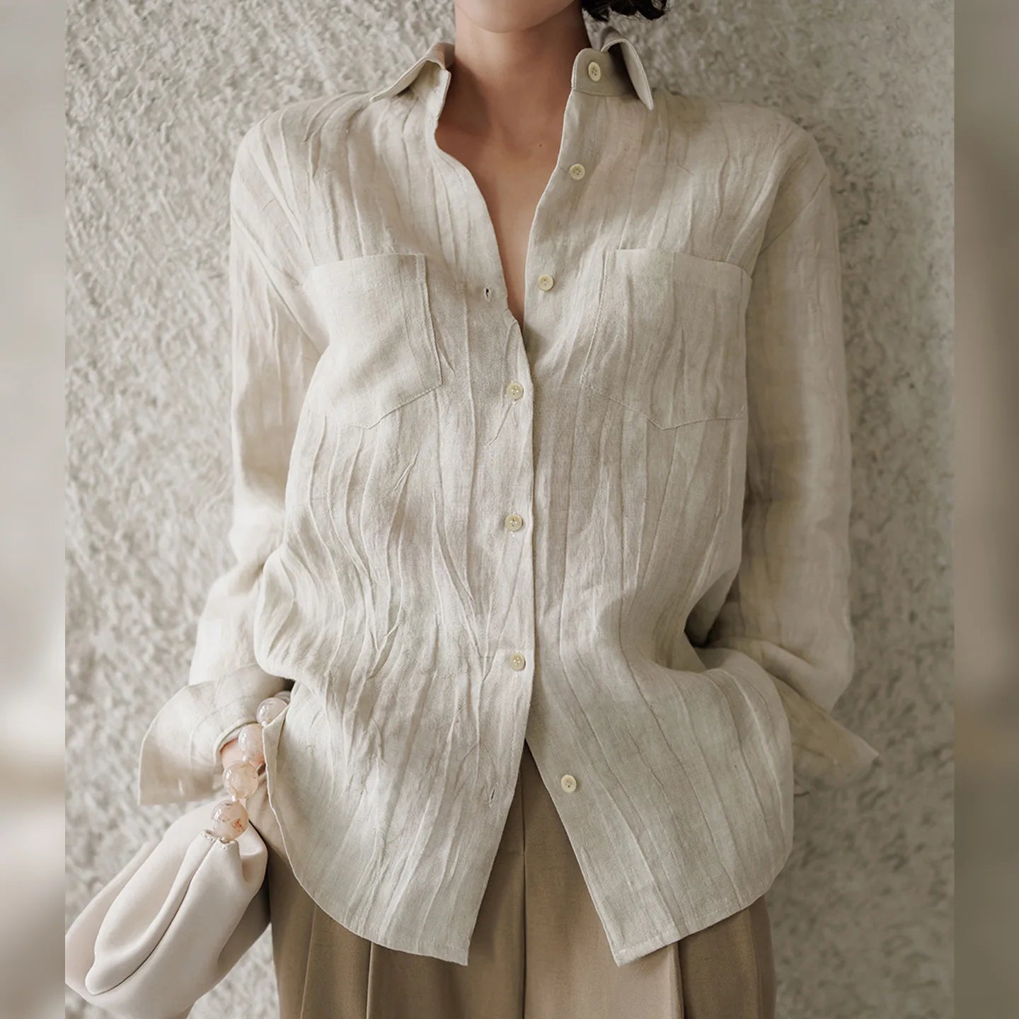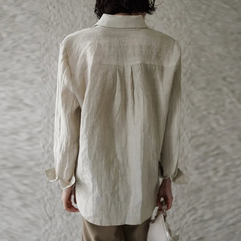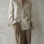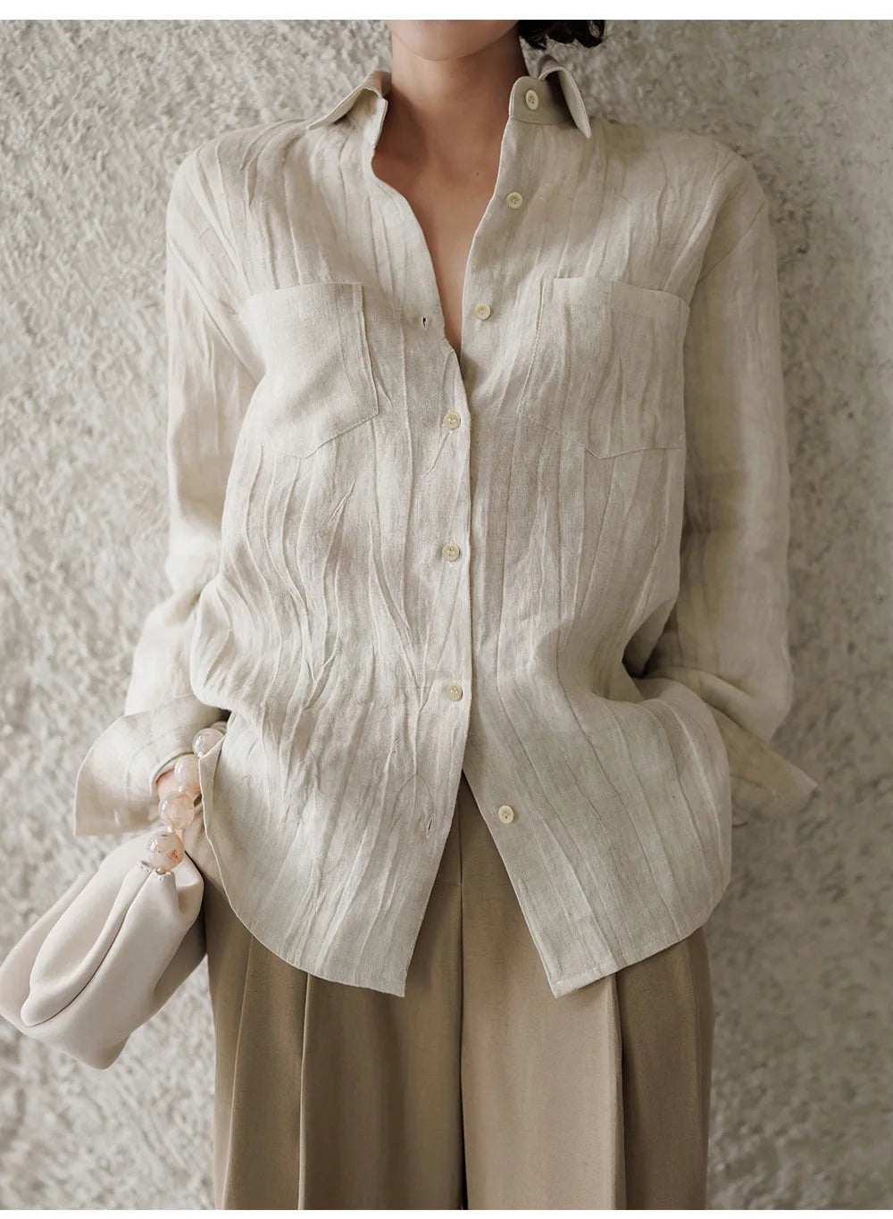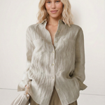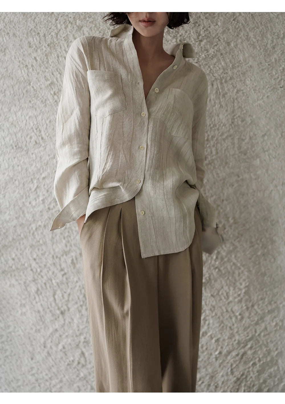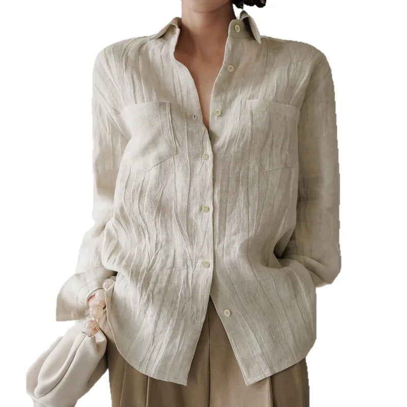 A shirt that looks like it was pressed by intention and worn by someone who knows exactly what they're doing. Pure linen with a subtle vertical pleat texture that catches light without demanding attention. Two chest pockets, a classic collar, button-front — the kind of piece that works tucked into a pleated midi or left open over a tank. Seasonless and completely reliable.