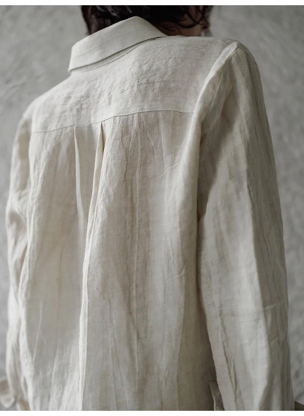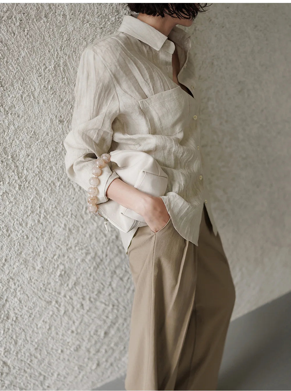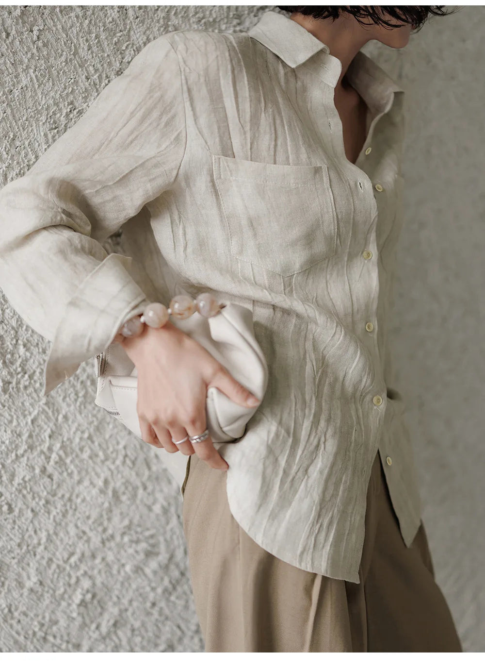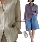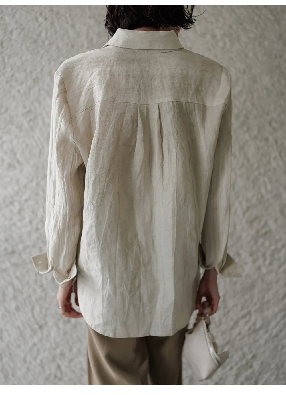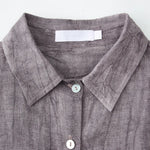 A shirt that looks like it was pressed by intention and worn by someone who knows exactly what they're doing. Pure linen with a subtle vertical pleat texture that catches light without demanding attention. Two chest pockets, a classic collar, button-front — the kind of piece that works tucked into a pleated midi or left open over a tank. Seasonless and completely reliable.