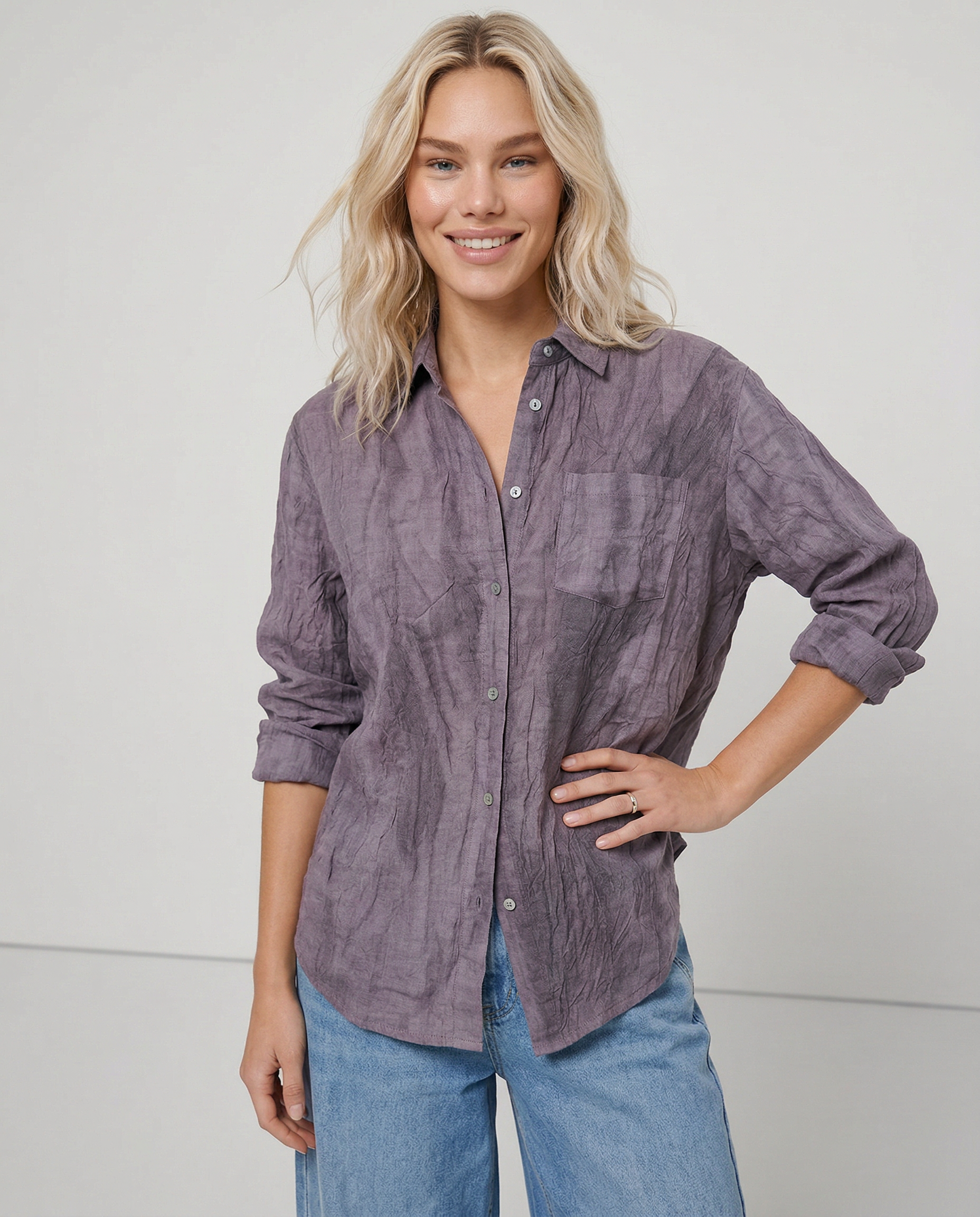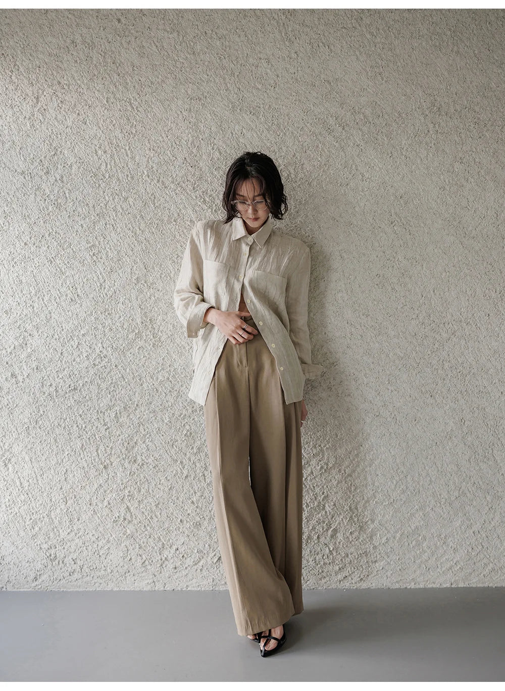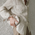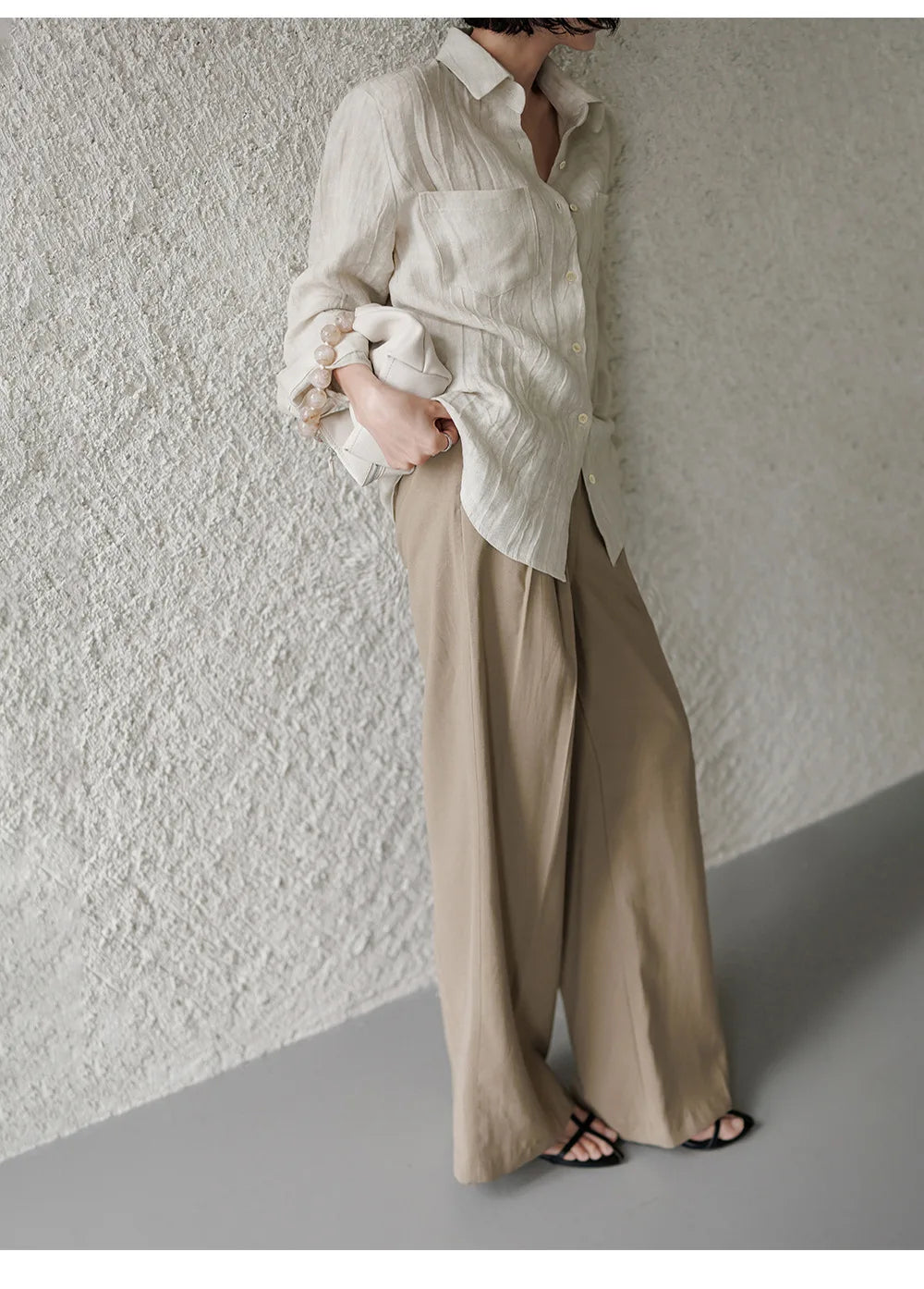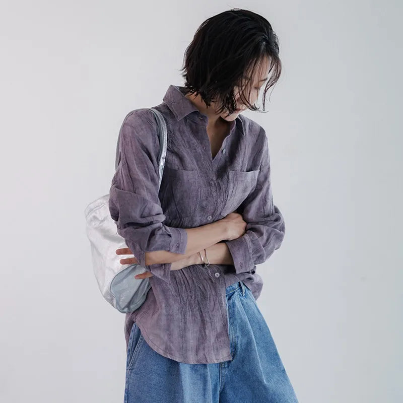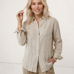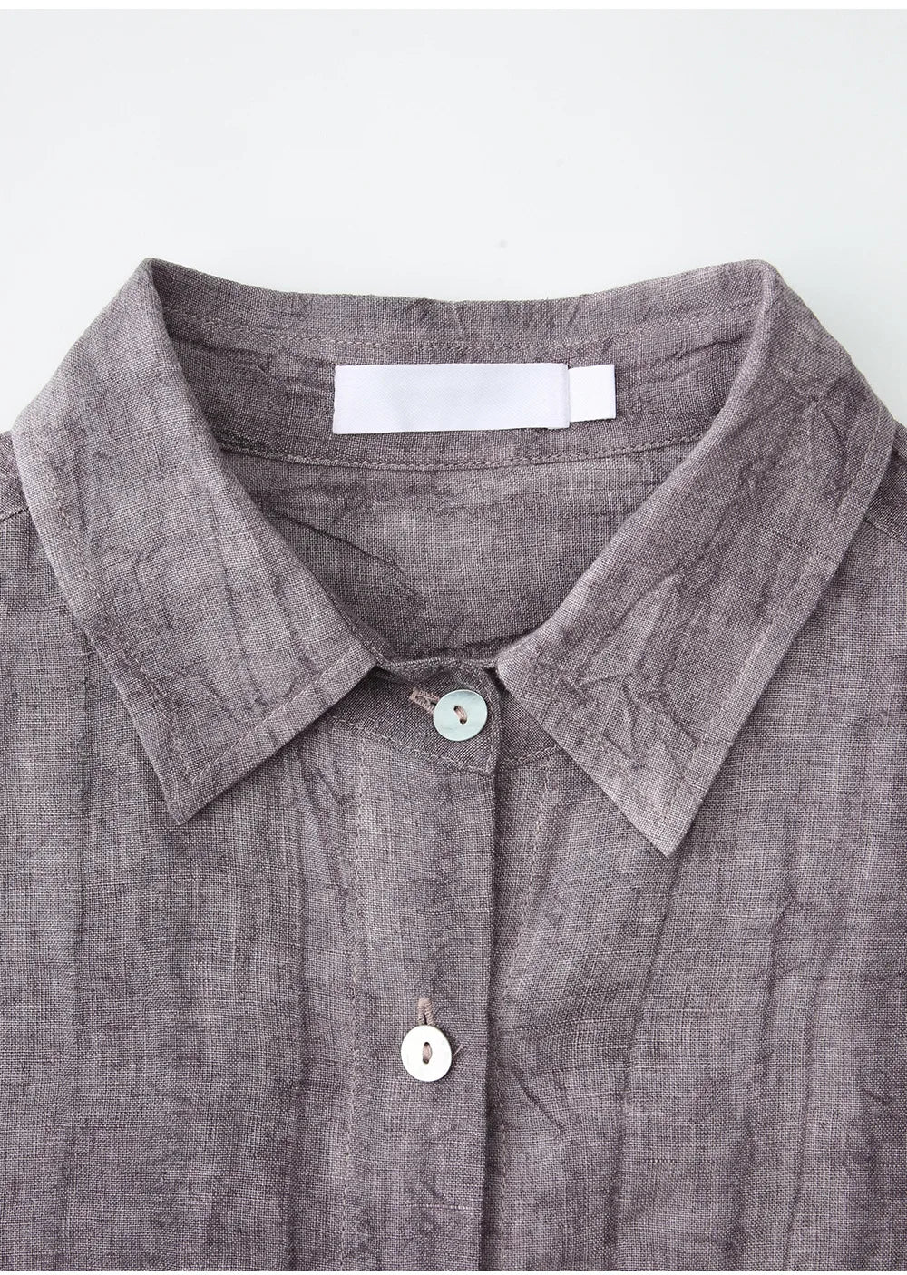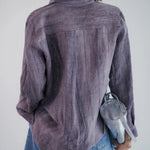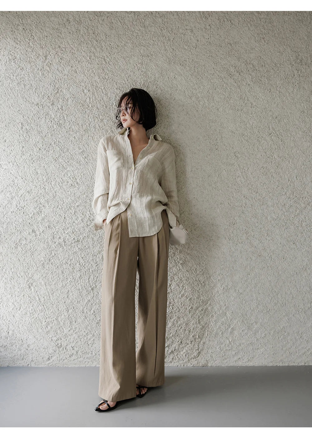 A shirt that looks like it was pressed by intention and worn by someone who knows exactly what they're doing. Pure linen with a subtle vertical pleat texture that catches light without demanding attention. Two chest pockets, a classic collar, button-front — the kind of piece that works tucked into a pleated midi or left open over a tank. Seasonless and completely reliable.