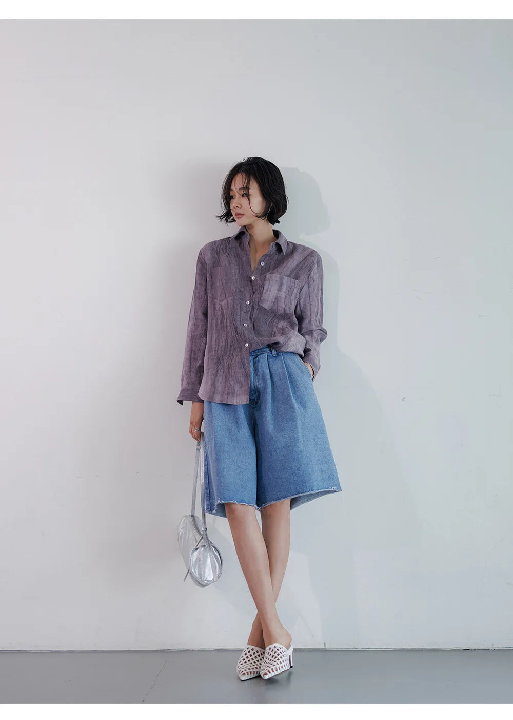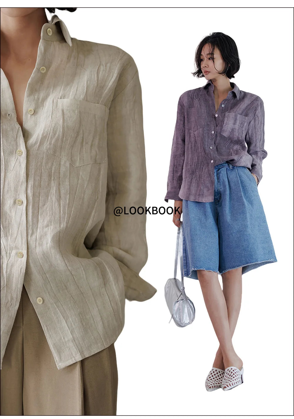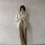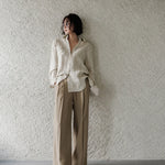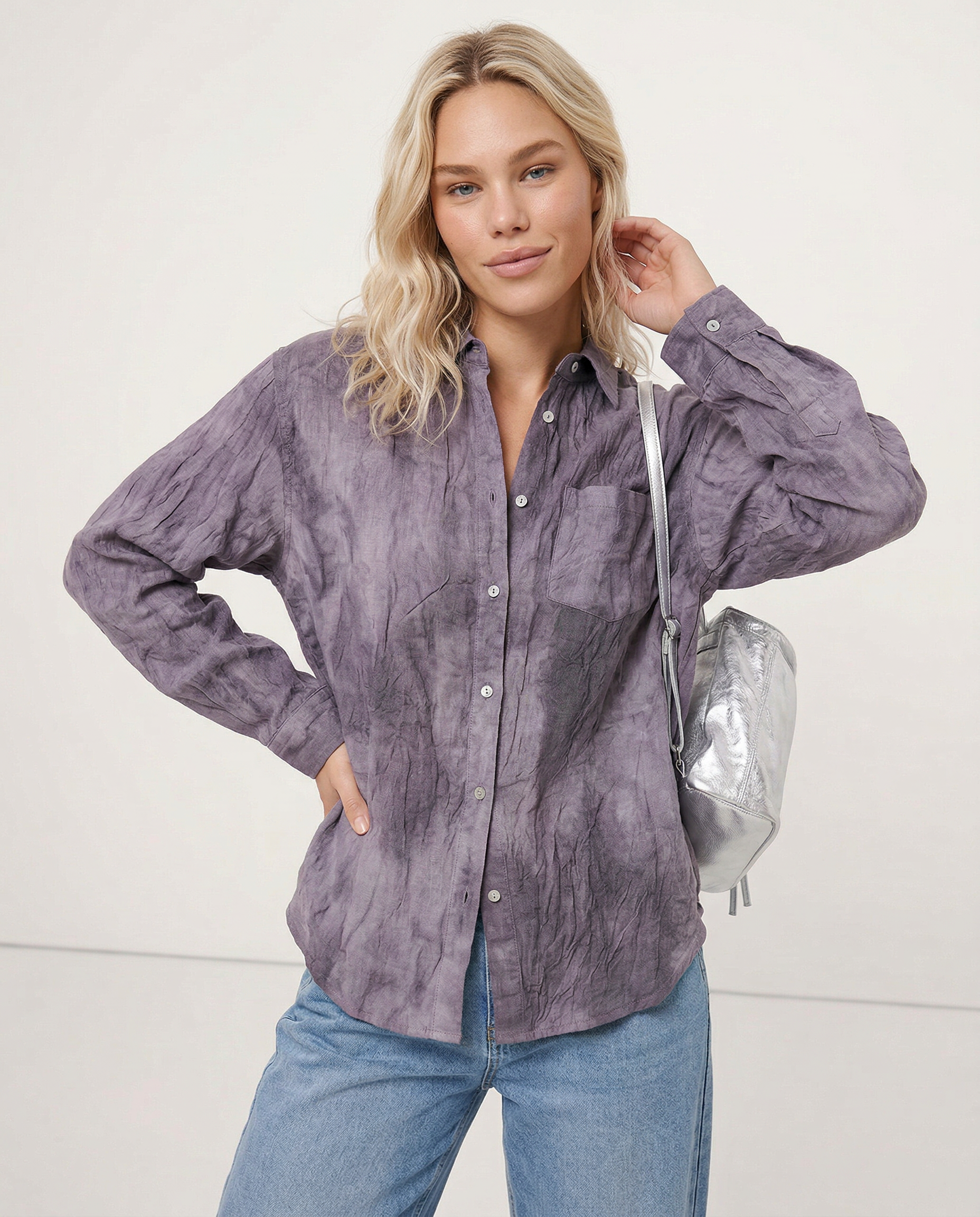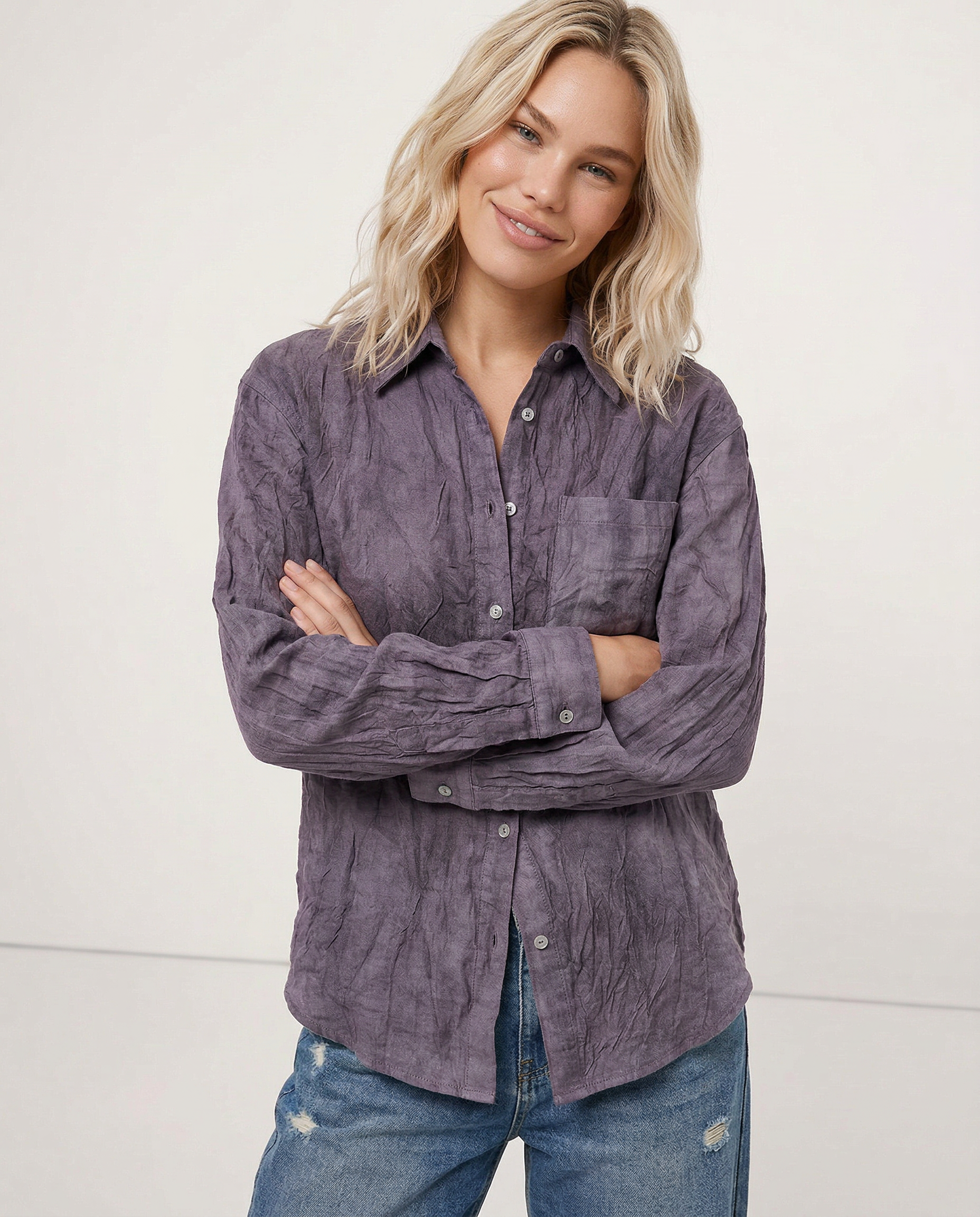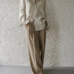 A shirt that looks like it was pressed by intention and worn by someone who knows exactly what they're doing. Pure linen with a subtle vertical pleat texture that catches light without demanding attention. Two chest pockets, a classic collar, button-front — the kind of piece that works tucked into a pleated midi or left open over a tank. Seasonless and completely reliable.