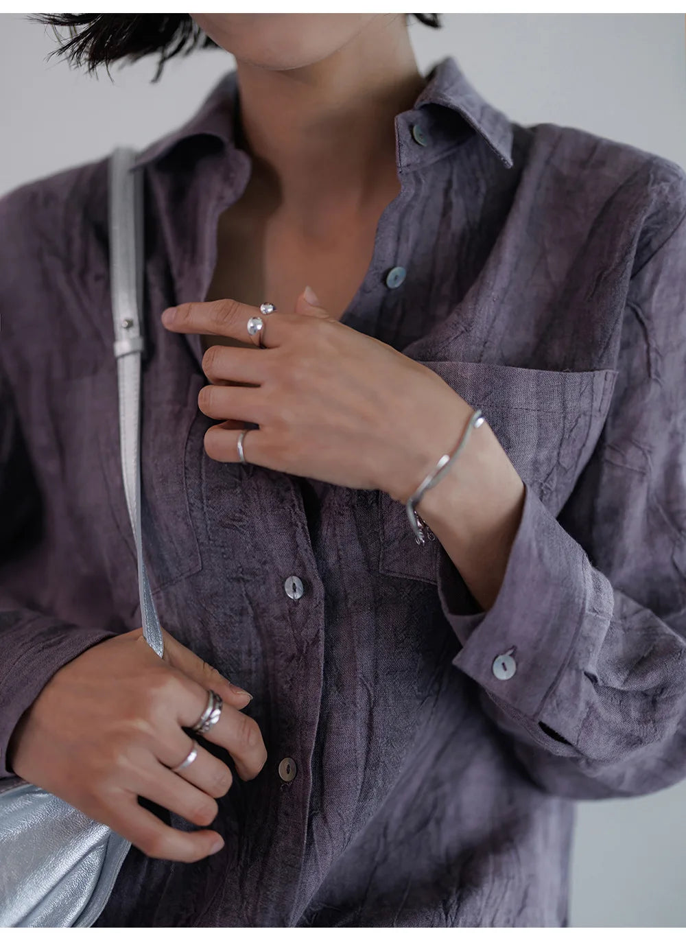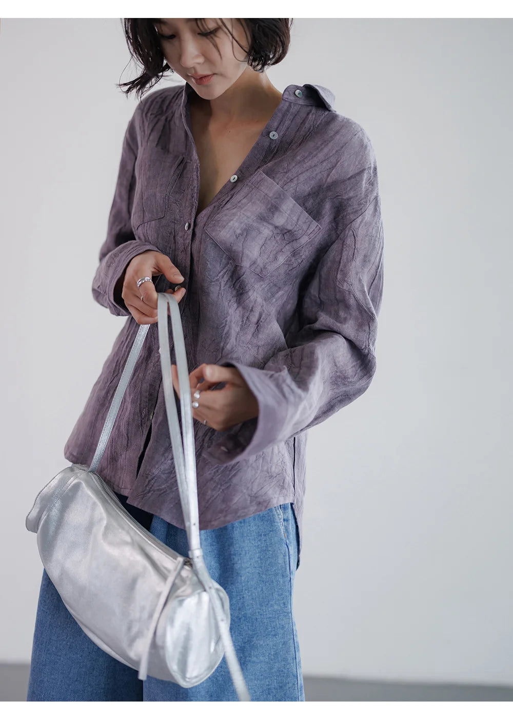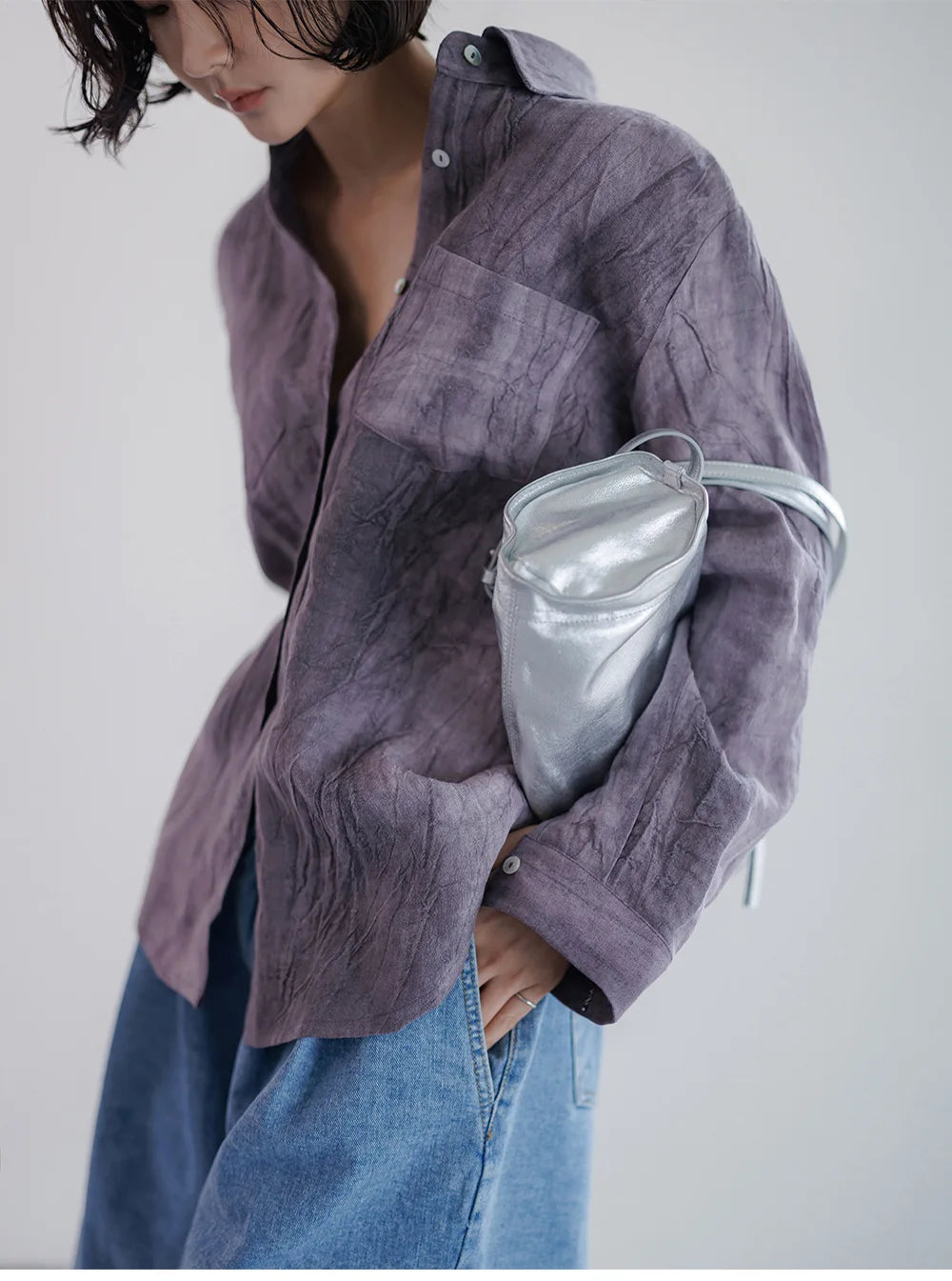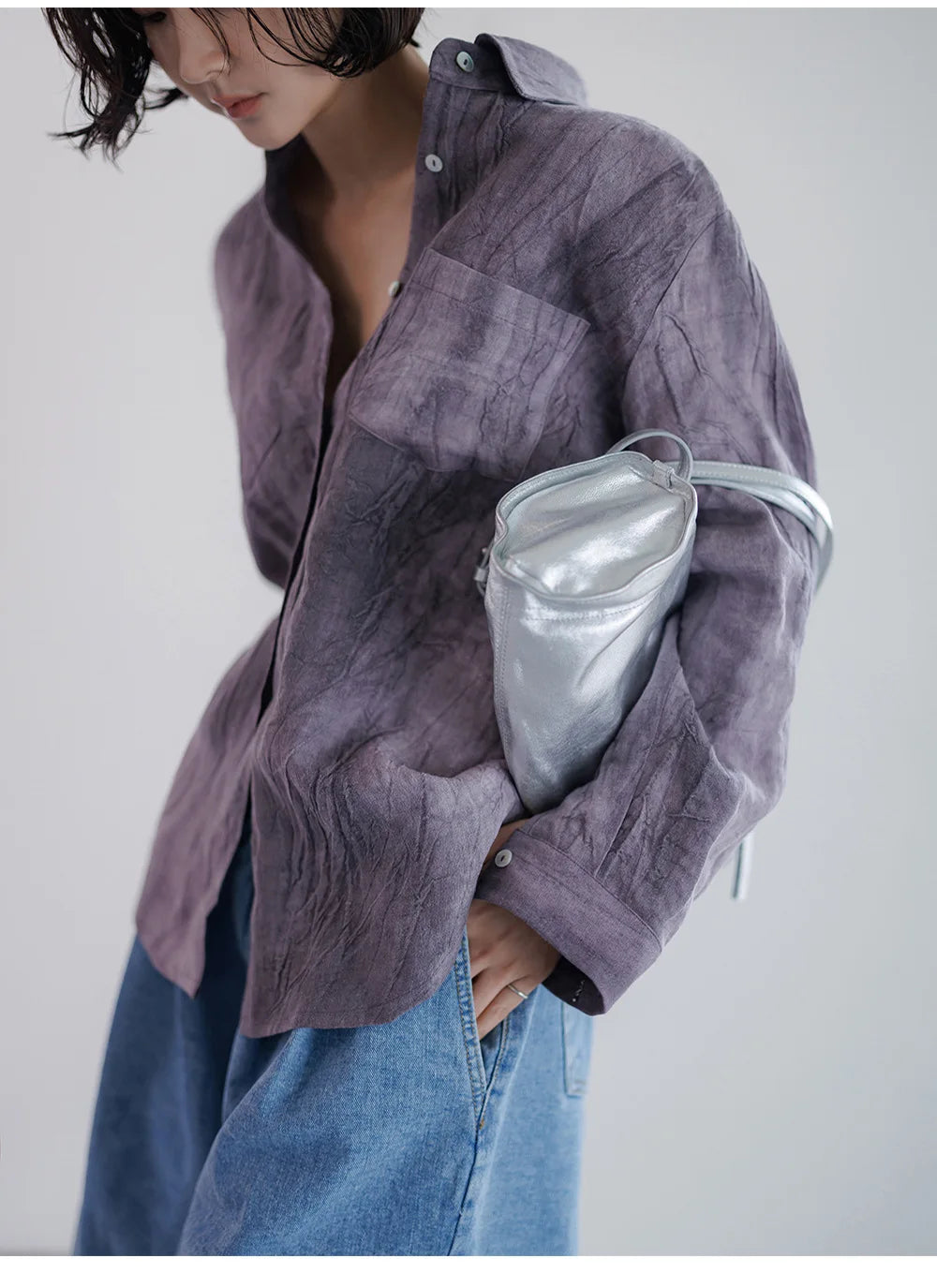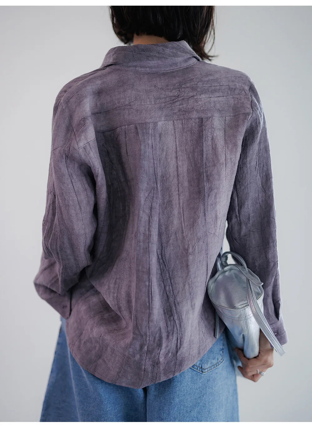 A shirt that looks like it was pressed by intention and worn by someone who knows exactly what they're doing. Pure linen with a subtle vertical pleat texture that catches light without demanding attention. Two chest pockets, a classic collar, button-front — the kind of piece that works tucked into a pleated midi or left open over a tank. Seasonless and completely reliable.