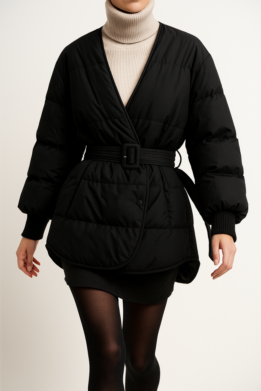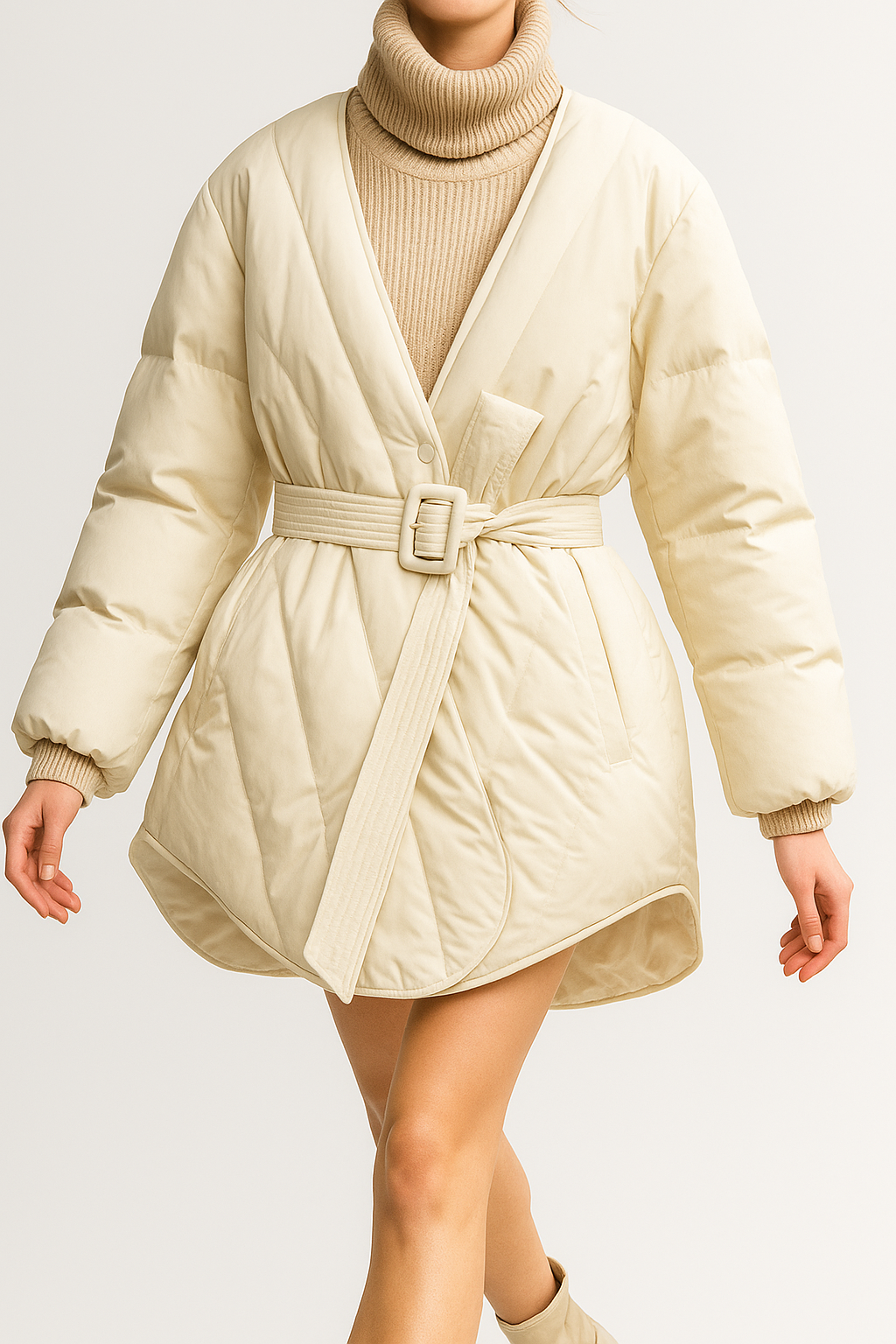 • Feminine silhouette with a belted waist.