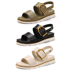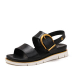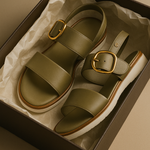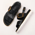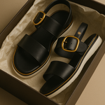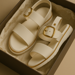 Clean lines, bold hardware—these cushioned flat sandals feature a smooth cross-strap silhouette with golden accents that catch the light. Designed for all-day comfort without compromising on edge.